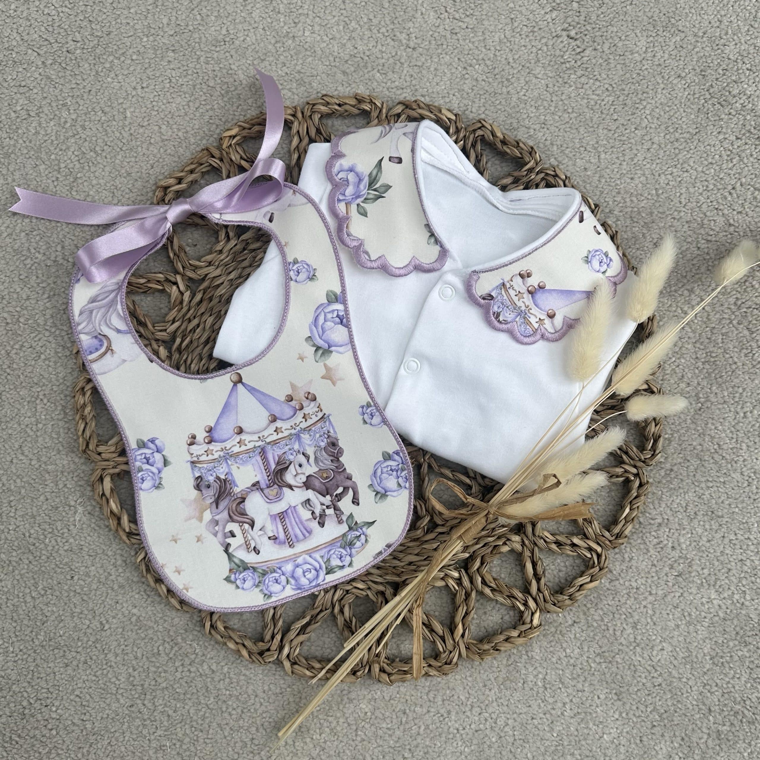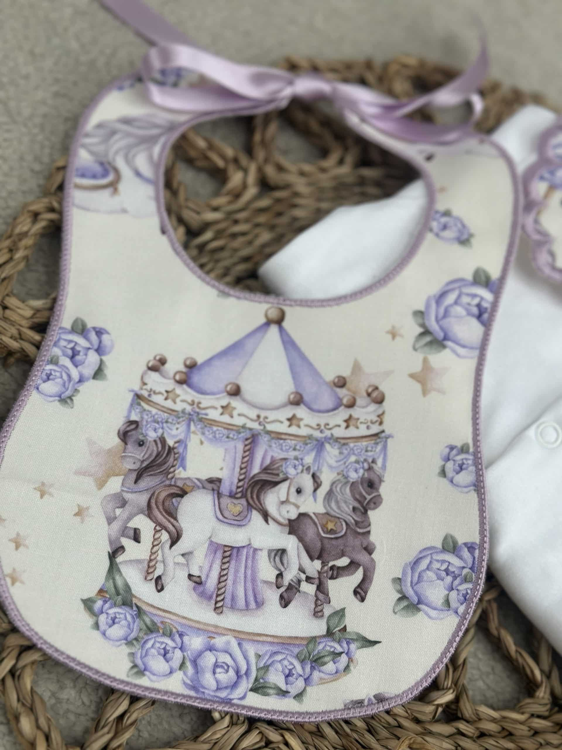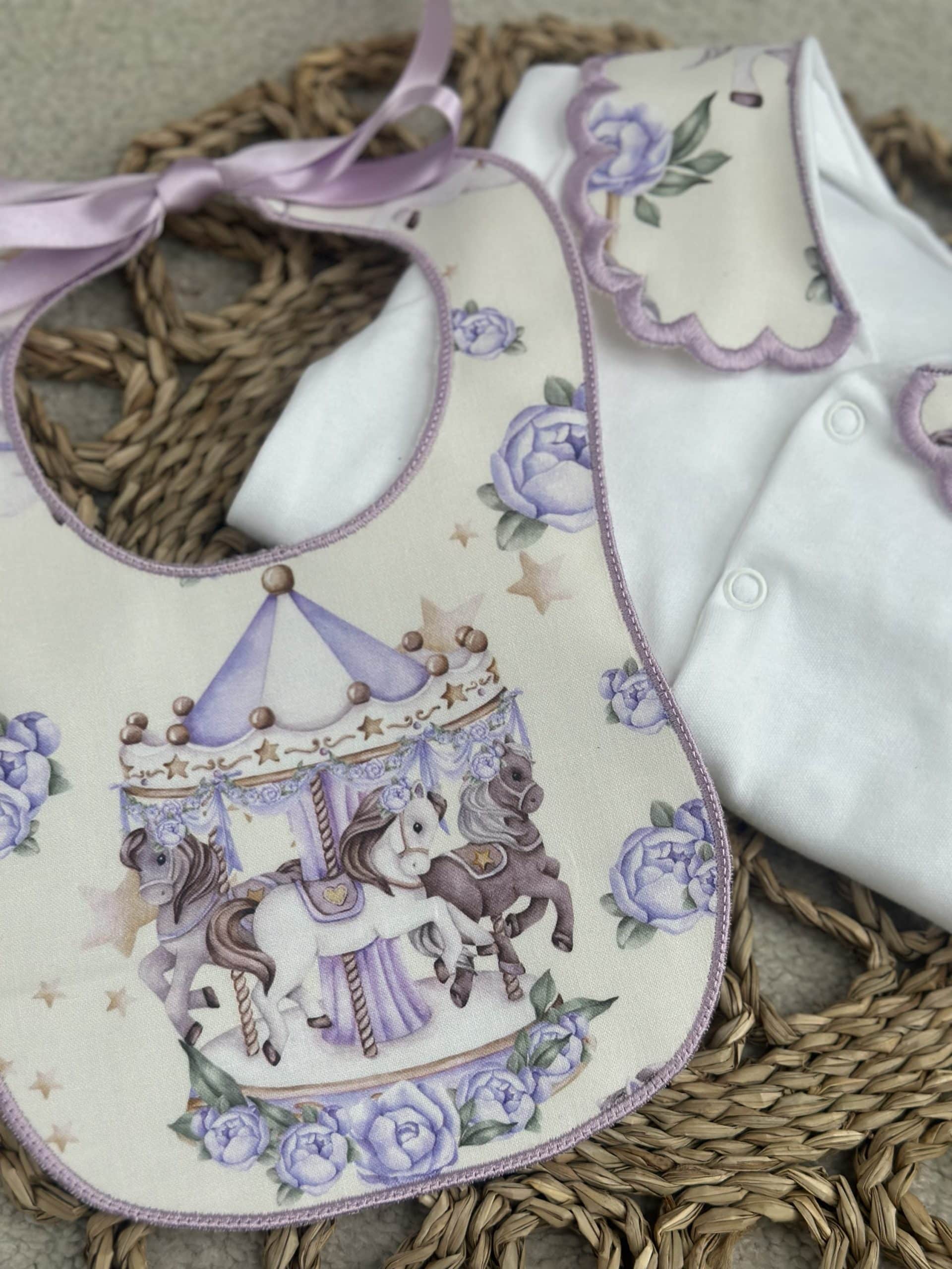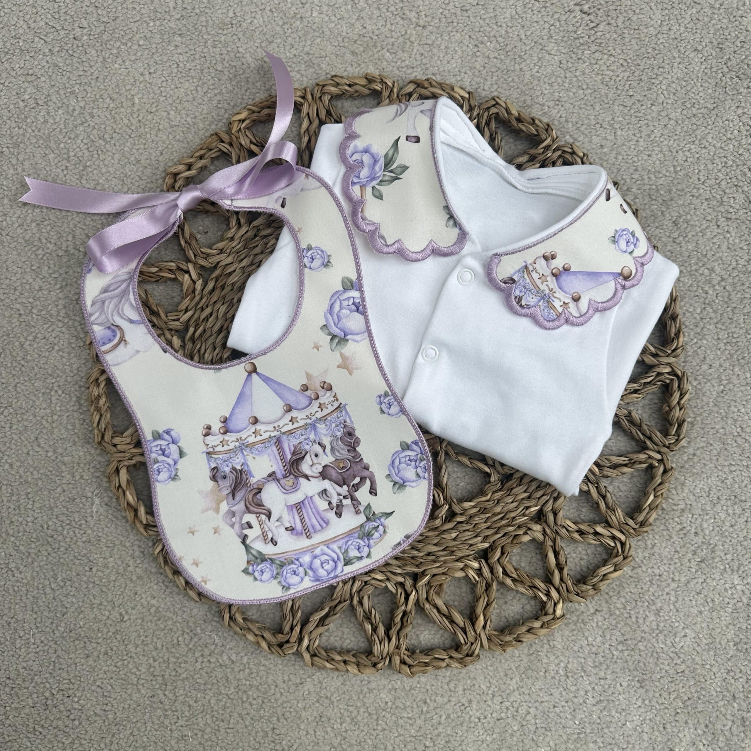Girls Lilac Carousel Handmade Sleepsuit And Bib