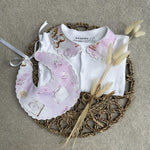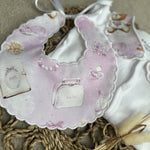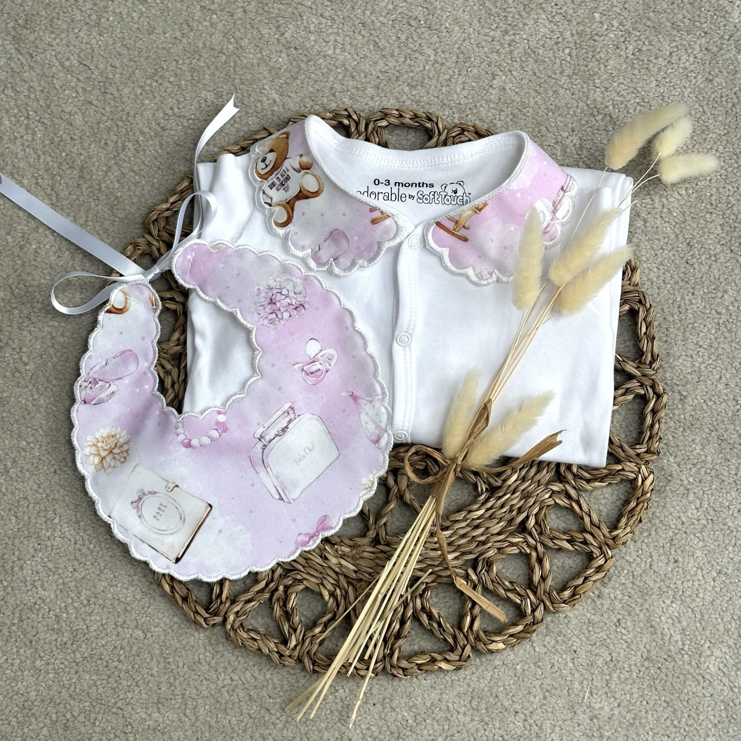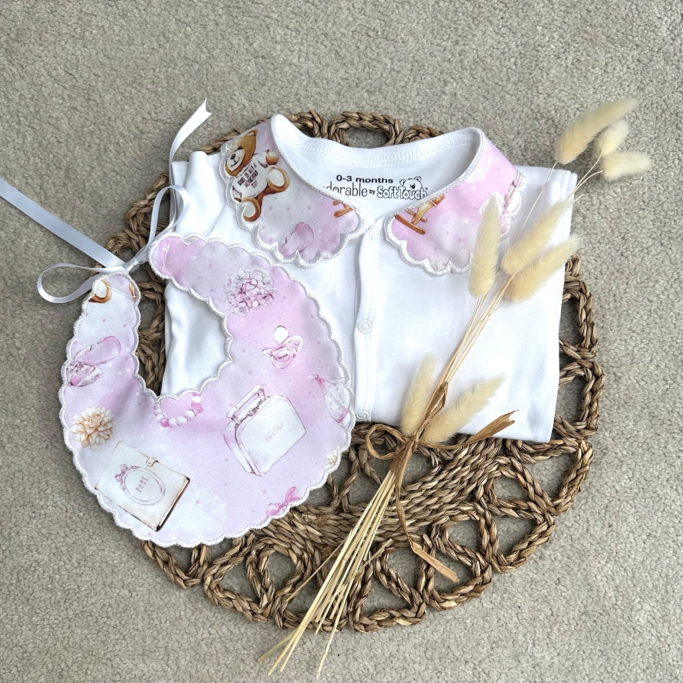 This is a beautiful unique handmade sleepsuit , with A handmade print collar and matching print bib this can be personalised with name embroidery on the bib and Front of sleepsuit..