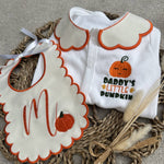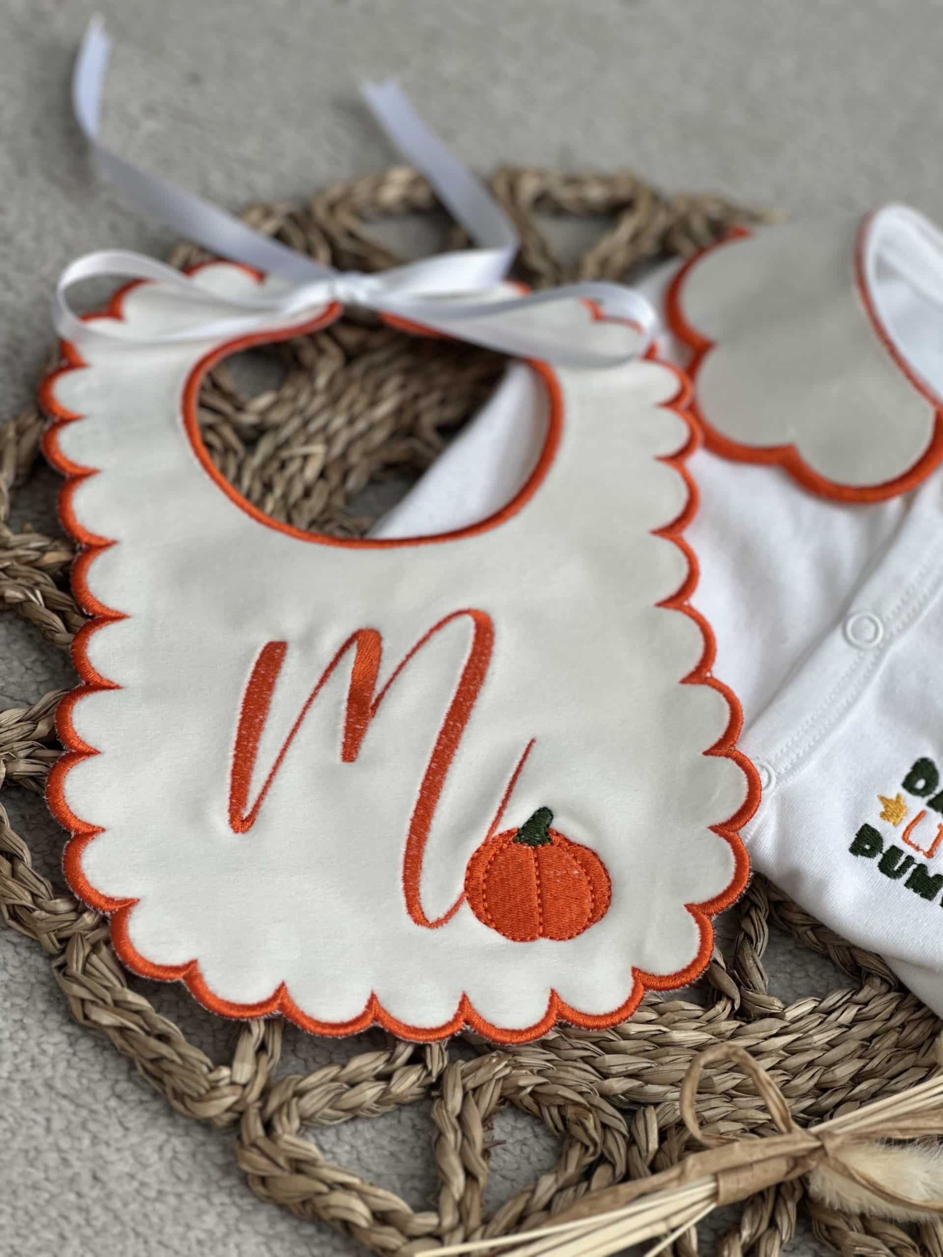 This is a beautiful unique halloween handmade sleepsuit , with A handmade velvet collar and velvet bib this is personalised with a pumpkin design on the sleepsuit and bib.
