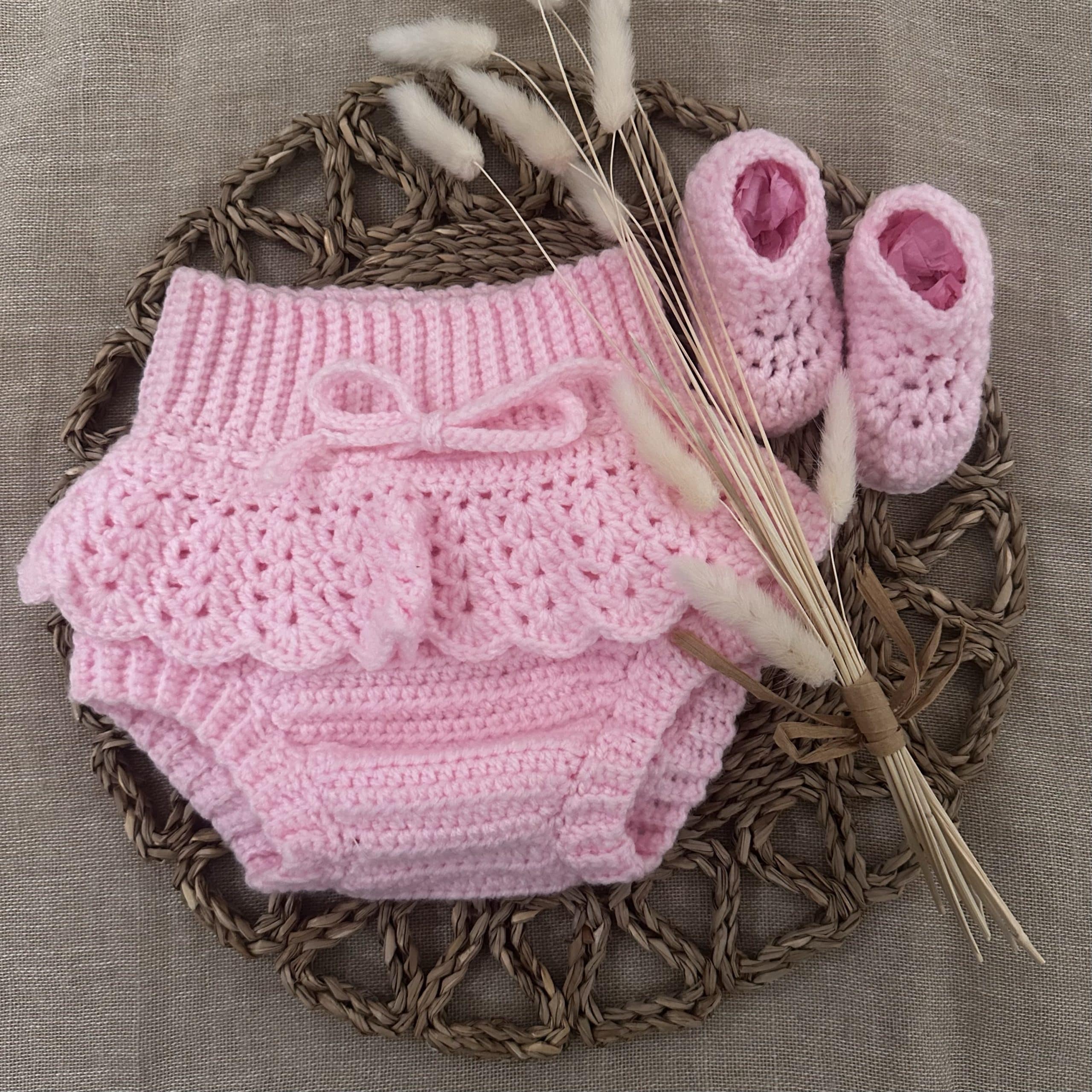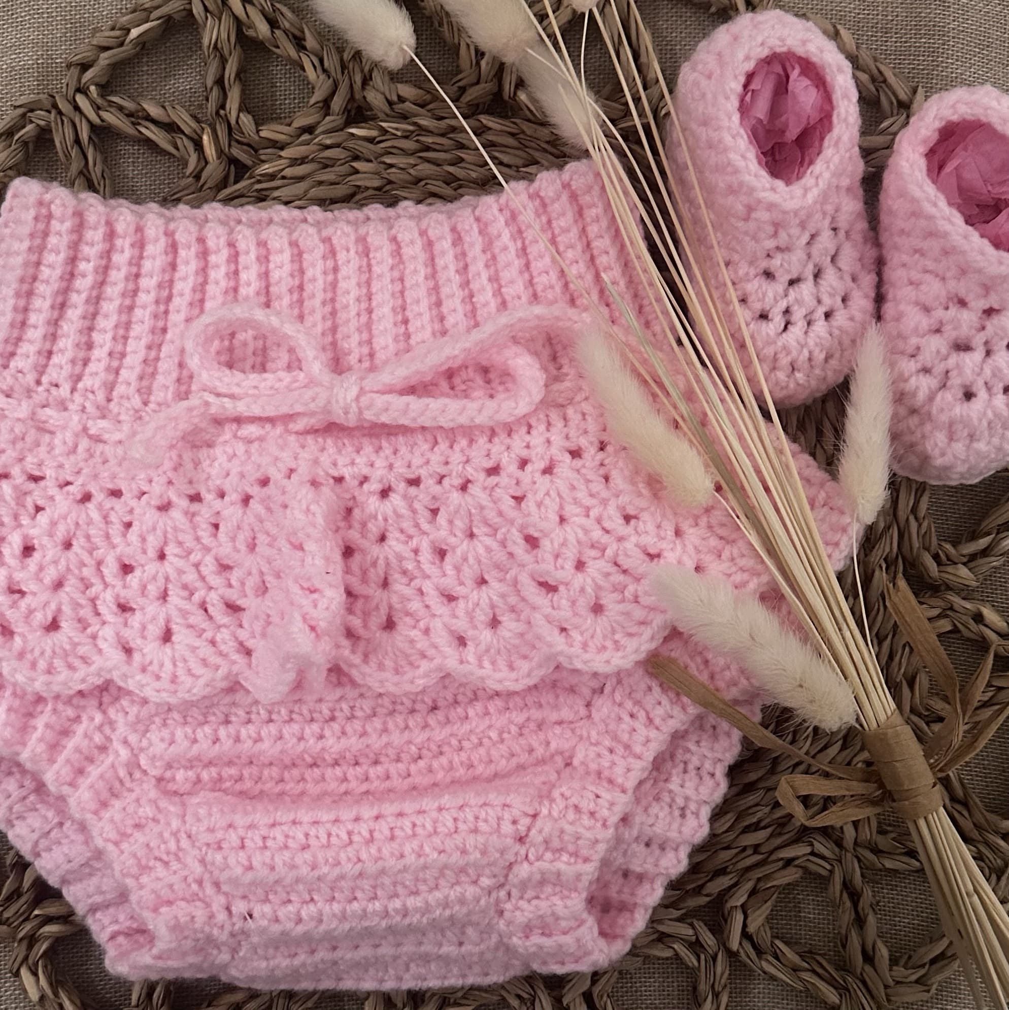 Perfect Little Thing - Hand Made Aran Frill Knickers and Booties Crochet - Pink