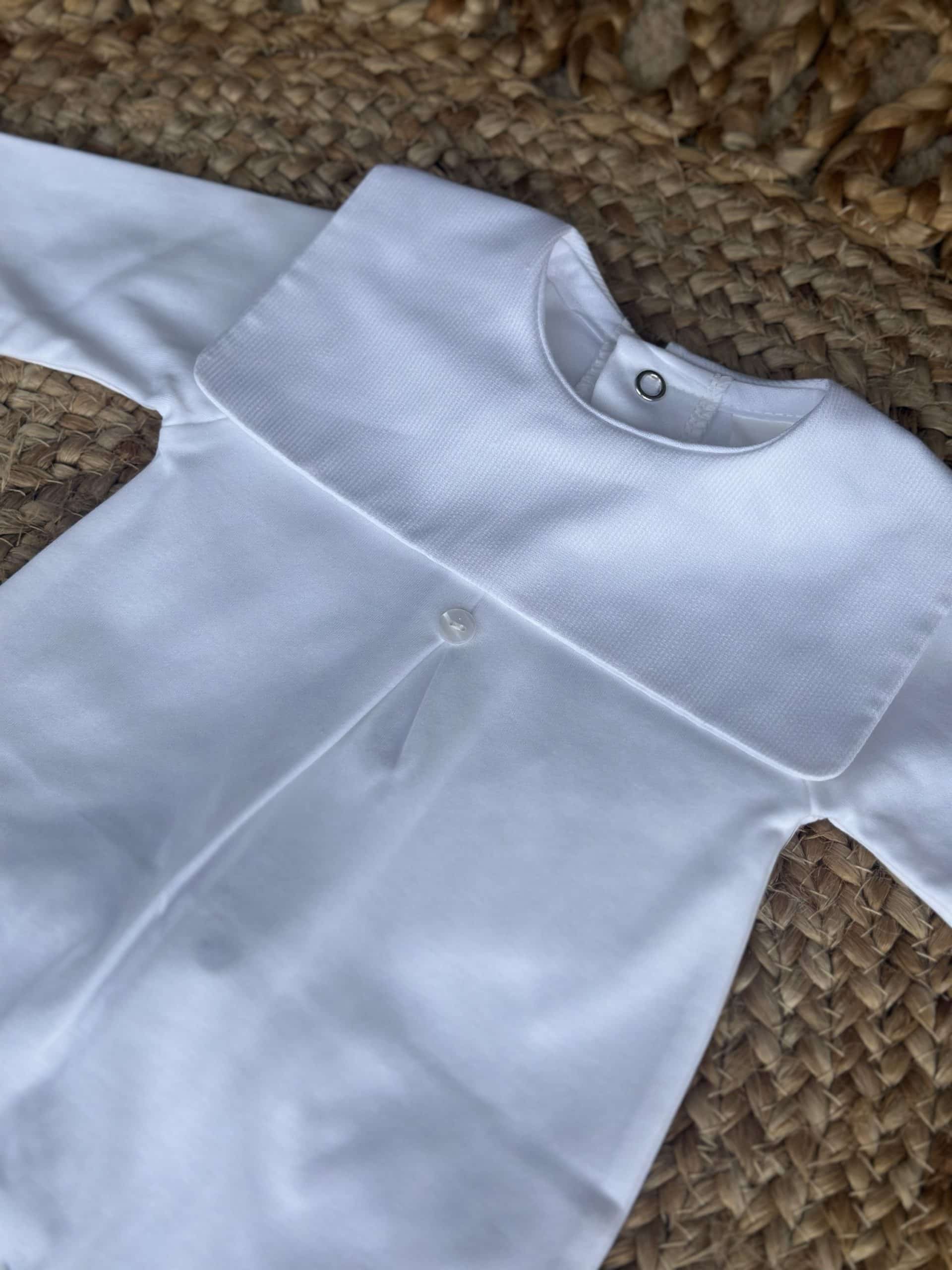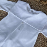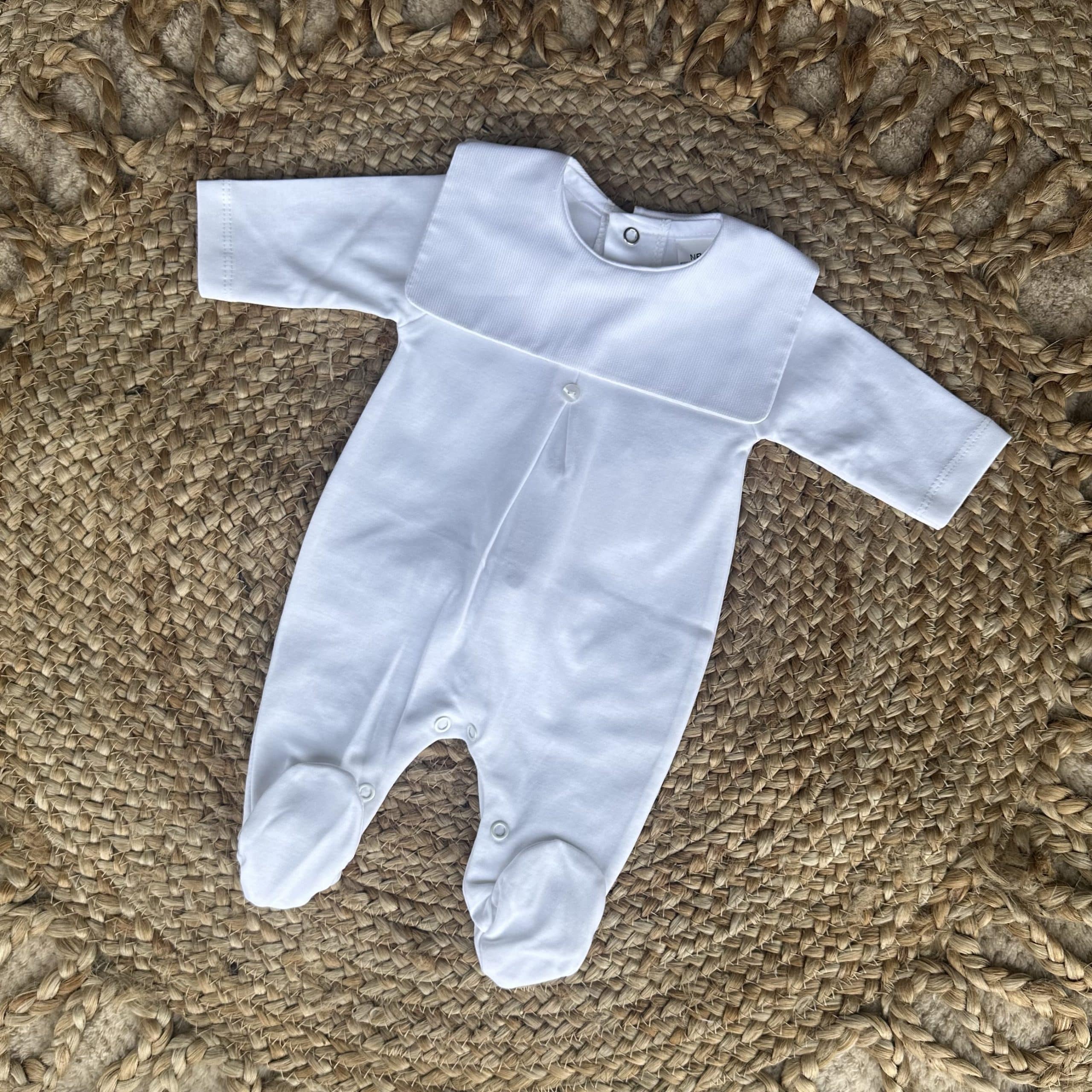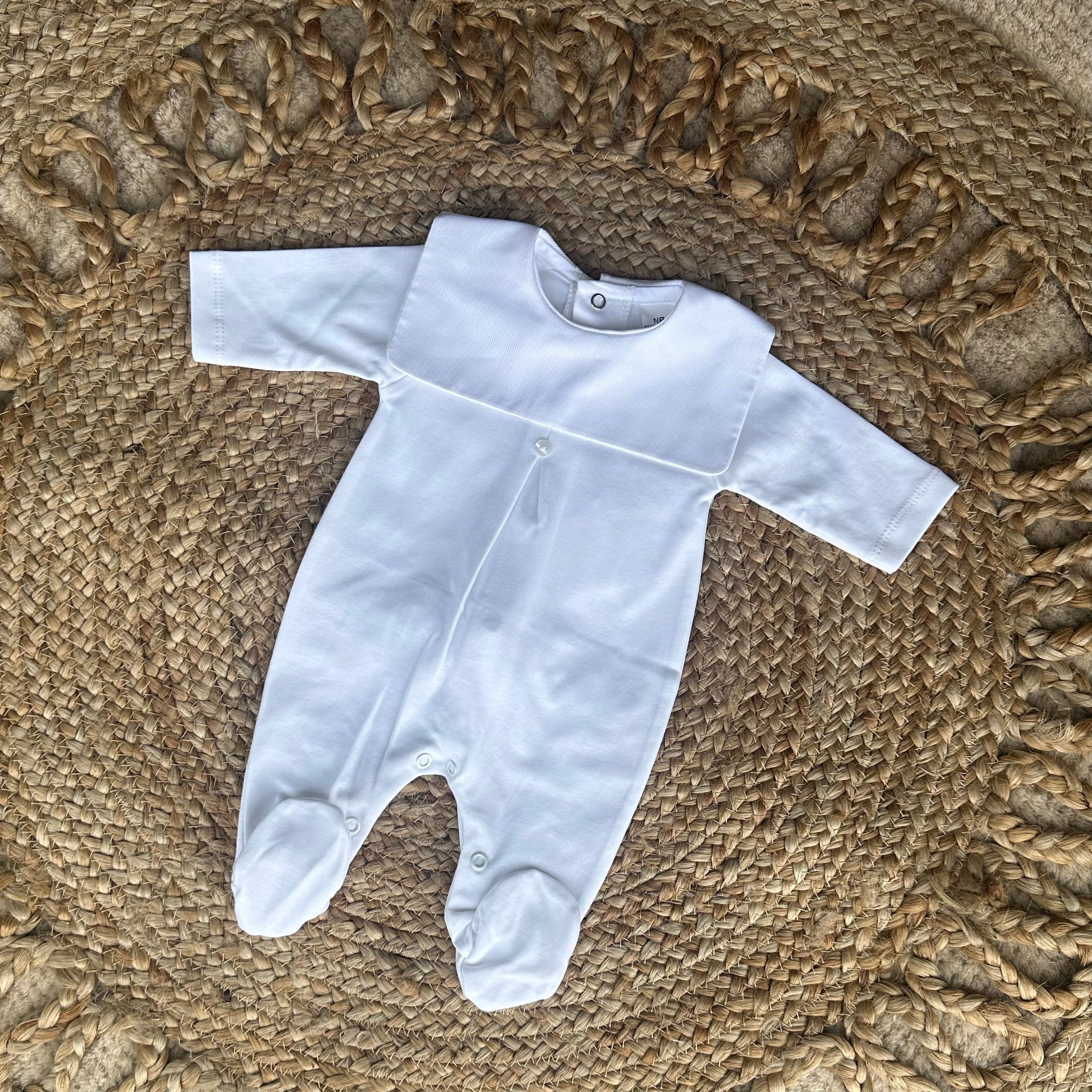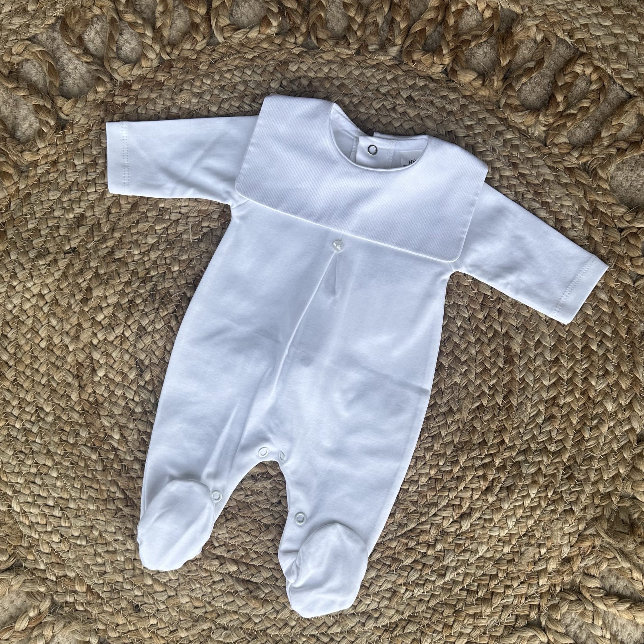 A long sleeve babygrow with a square bib, button detail with inbuilt feet.