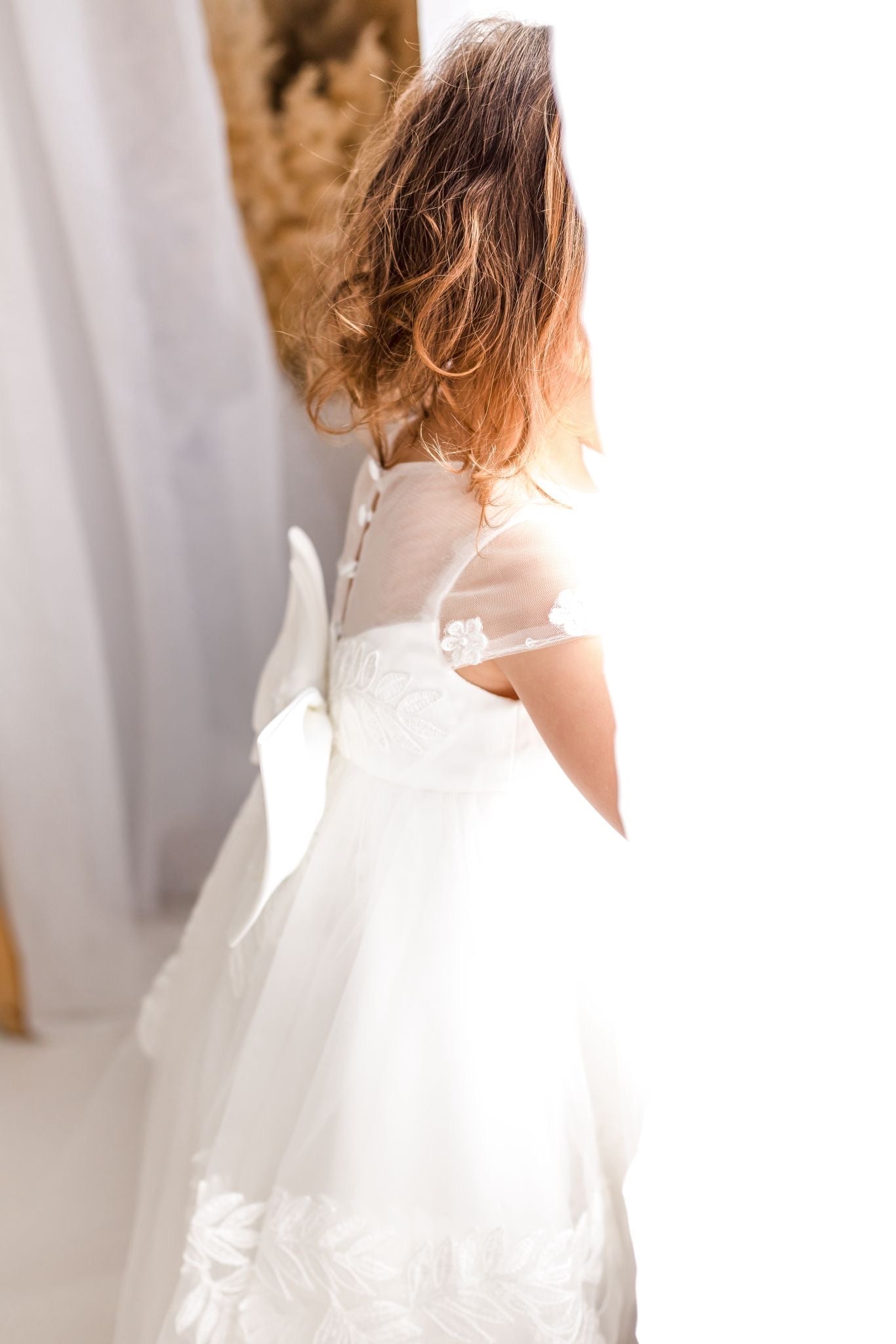 The back is simply breathtaking — finished with covered button detailing and an oversized structured bow that makes the most beautiful statement as she walks down the aisle.