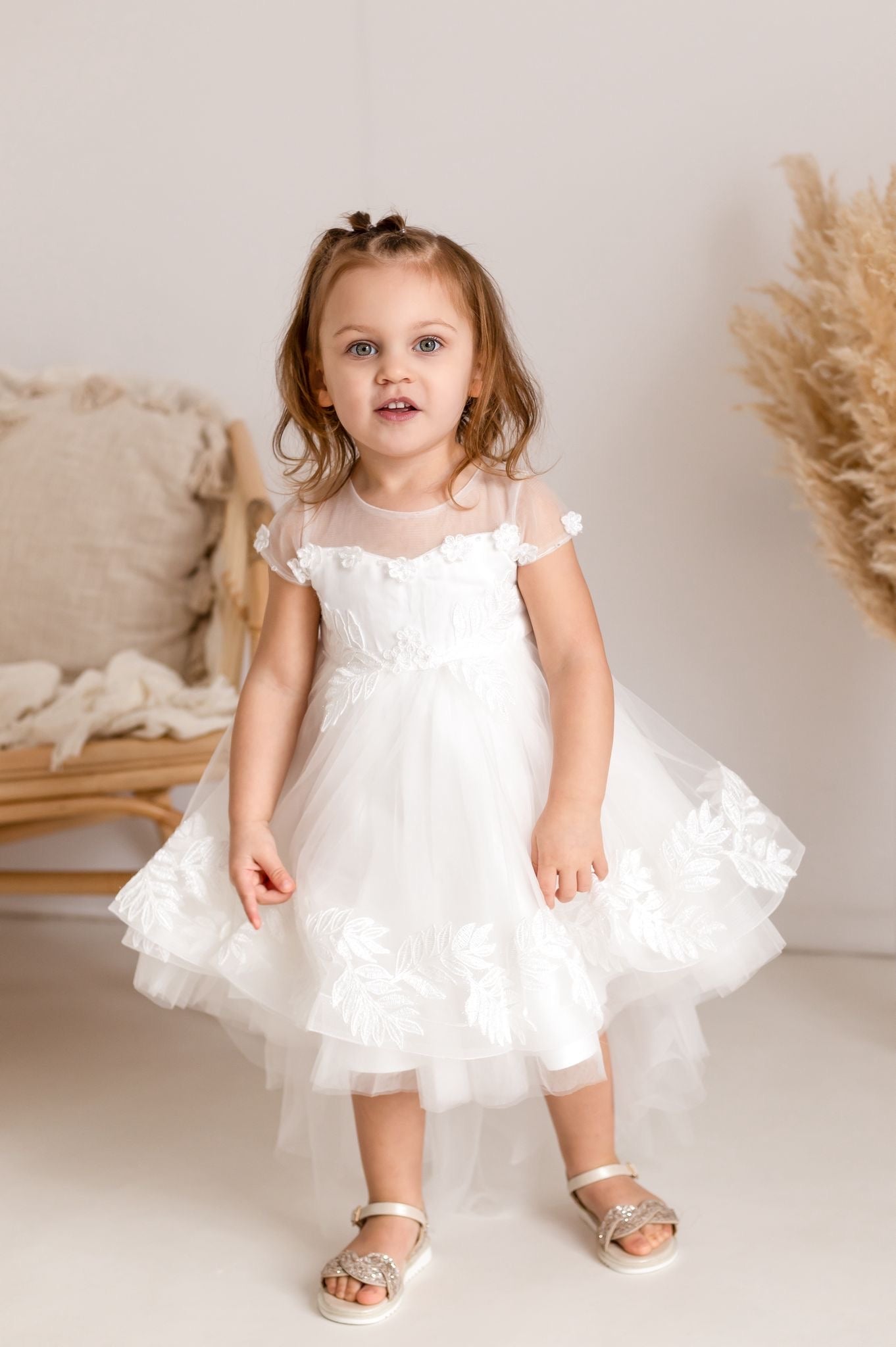The sheer illusion neckline features delicate floral appliqué detailing, while the bodice is beautifully finished with subtle embroidery for a timeless, heirloom feel. The full layered skirt creates a soft, floaty silhouette with embroidered leaf detailing along the hem for that extra touch of luxury.