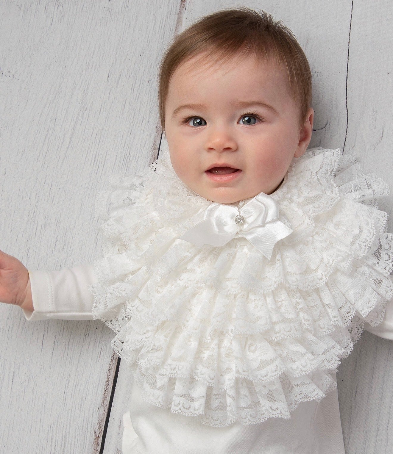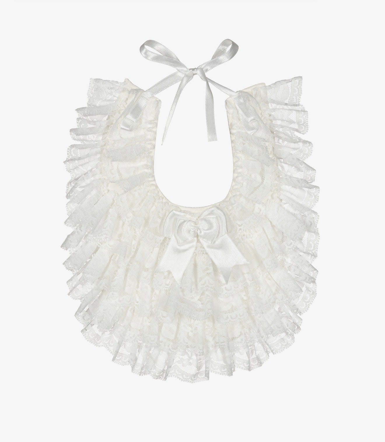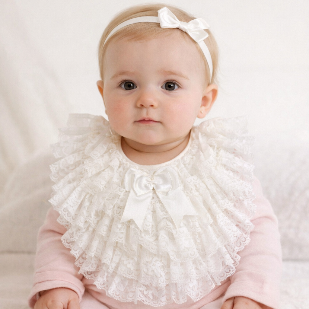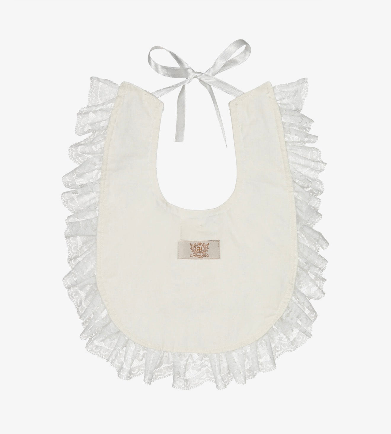 Pretty ivory bib for baby girls by Caramelo Kids, decorated with rows of delicate lace and finished with a satin bow in the middle. It ties around the neck with satin ribbons and is lined in comfortable and soft cotton.