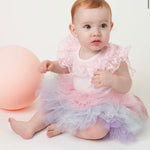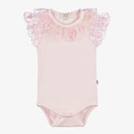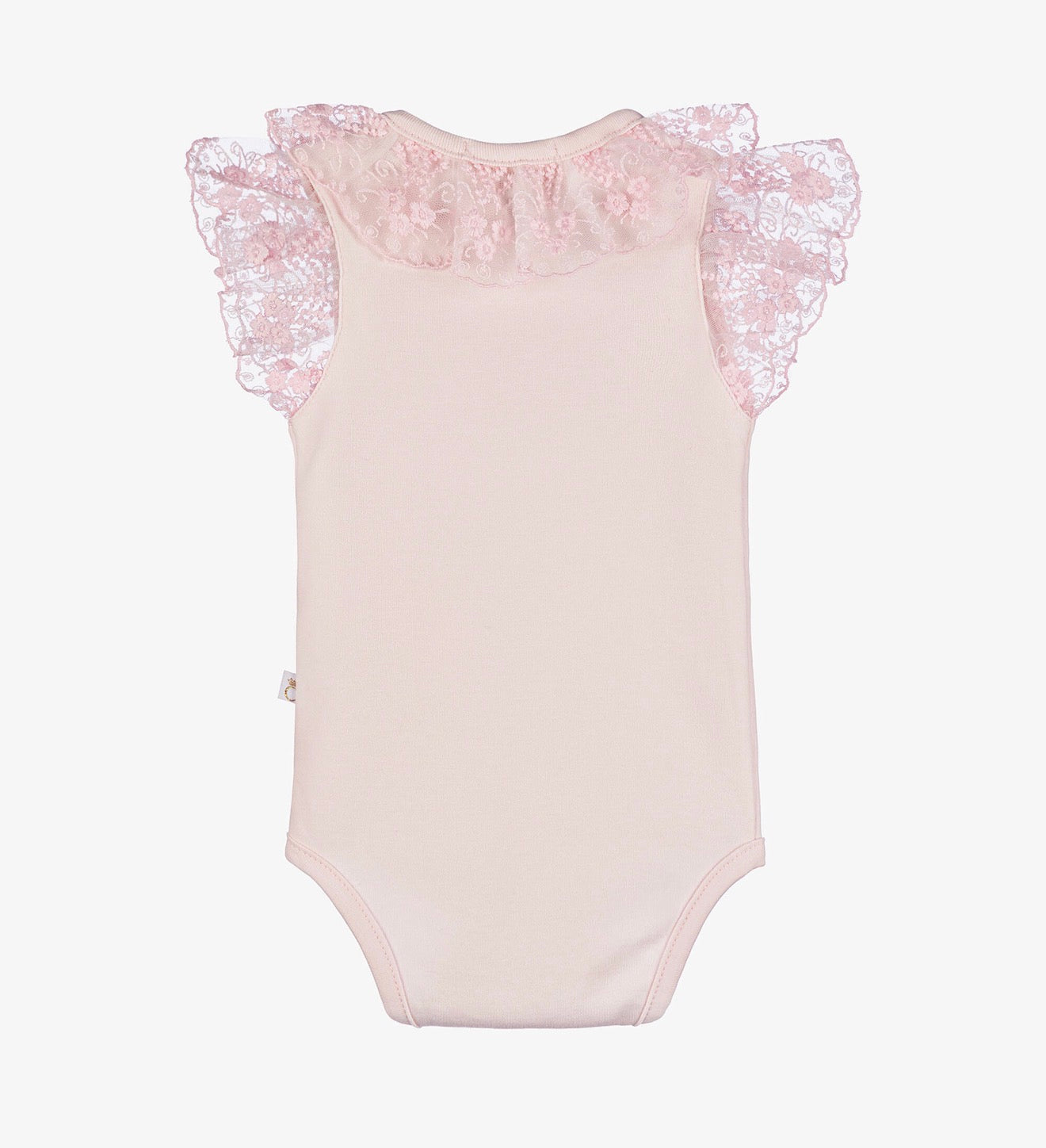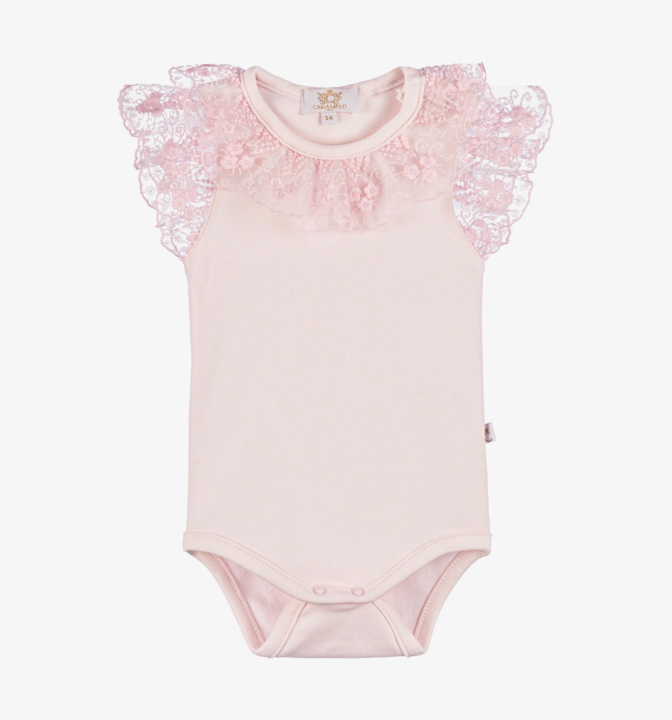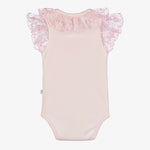Pink bodysuit for baby girls by Caramelo Kids, made in soft cotton jersey. It has a beautiful pink lace ruffle collar, with matching lace trim on the cuffs. There are popper fastenings between the legs.