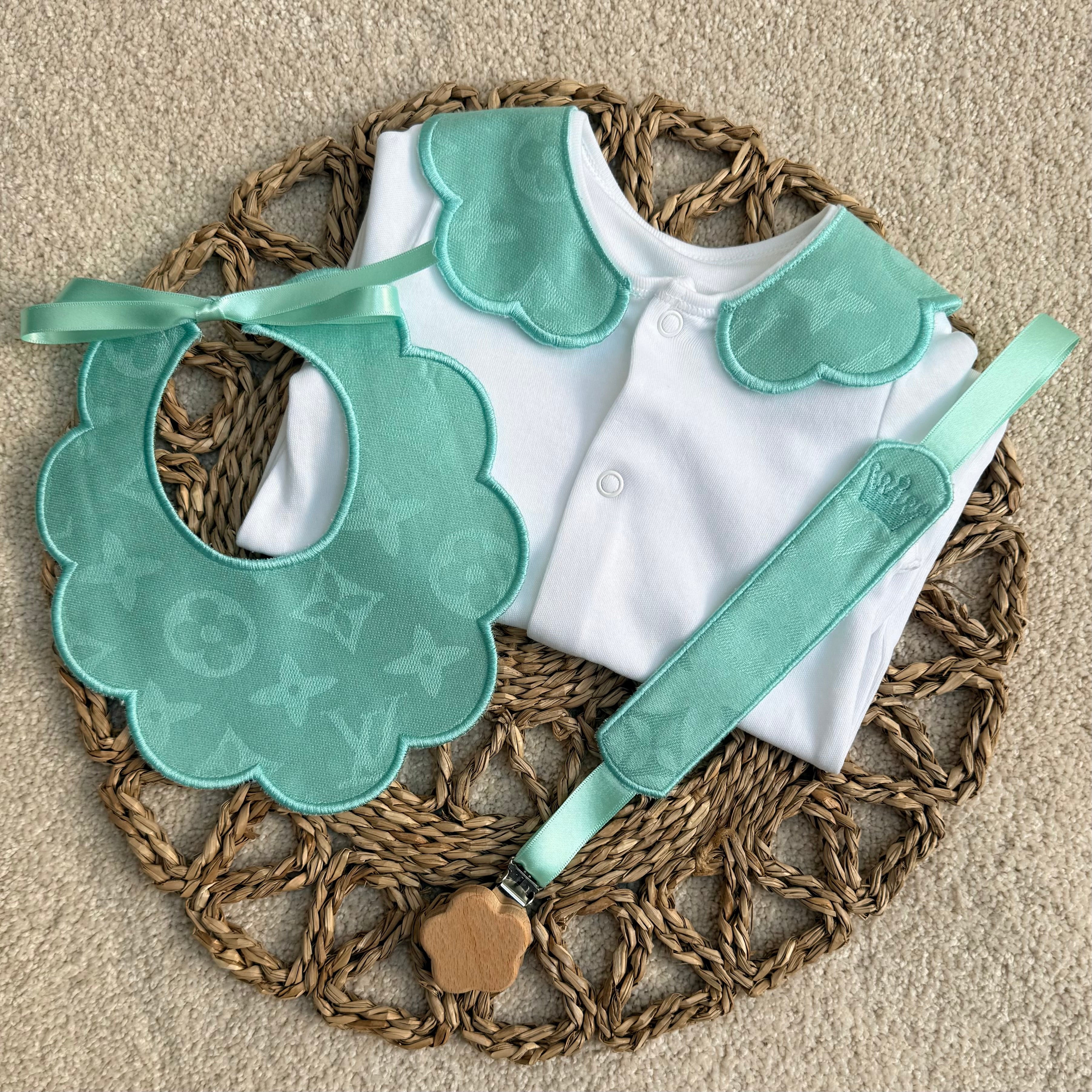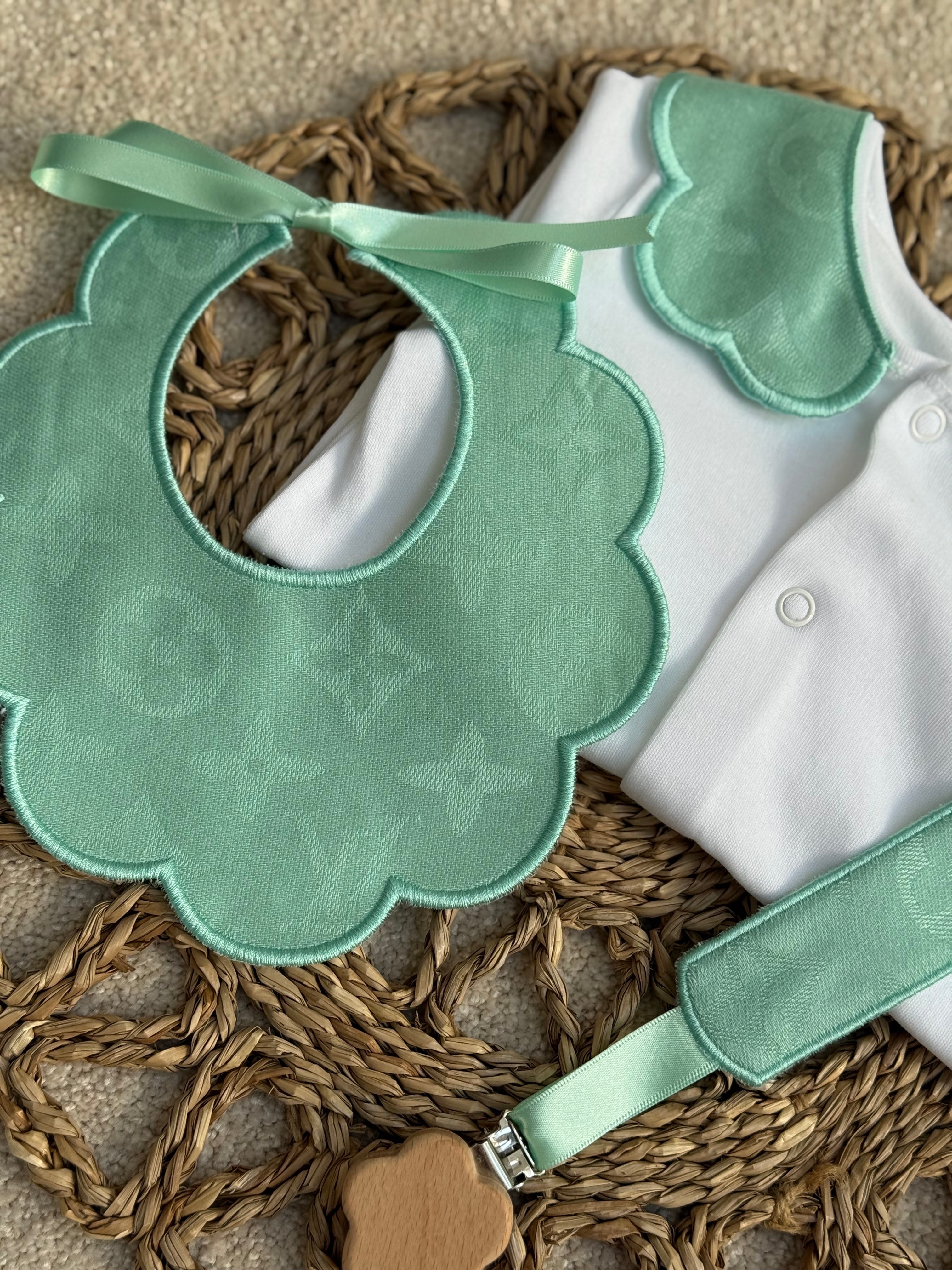 Girl's Soft Mint Handmade Sleepsuit, Dummy Clip & Bib Set