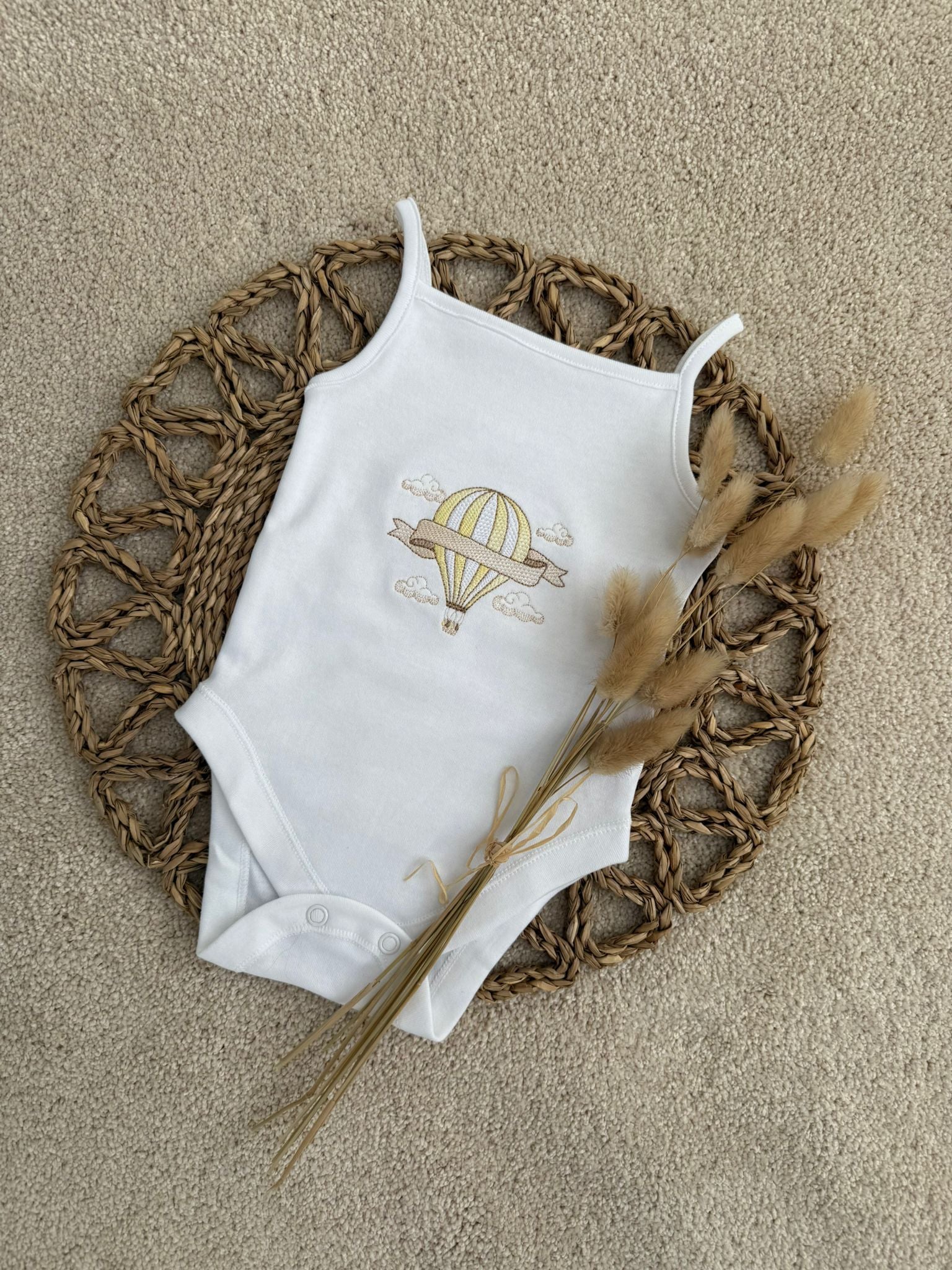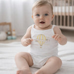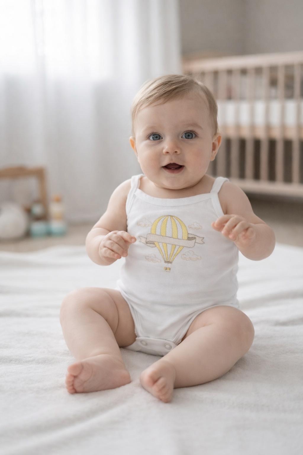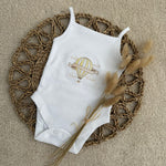 Drift into summer in the sweetest way with our Personalised Hot Air Balloon Baby Vest – a beautifully embroidered piece designed for sunshine days, holidays and precious everyday moments.