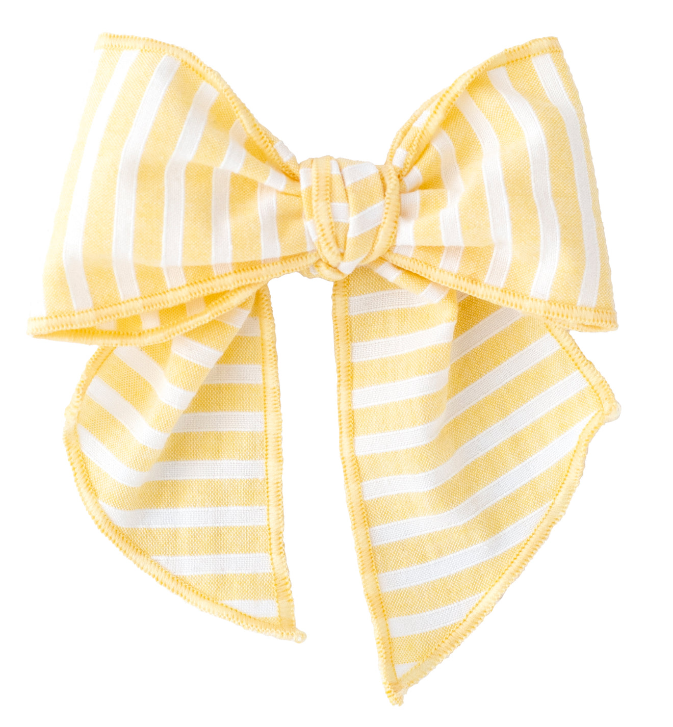 Add the perfect finishing touch to your little one's outfit with this delicate lemon and white seersucker striped hair bow from Calamaro. Crafted from soft, lightweight cotton, it is securely attached to a silver crocodile clip for a comfortable and secure fit. A timeless accessory, perfect for Spring/Summer!