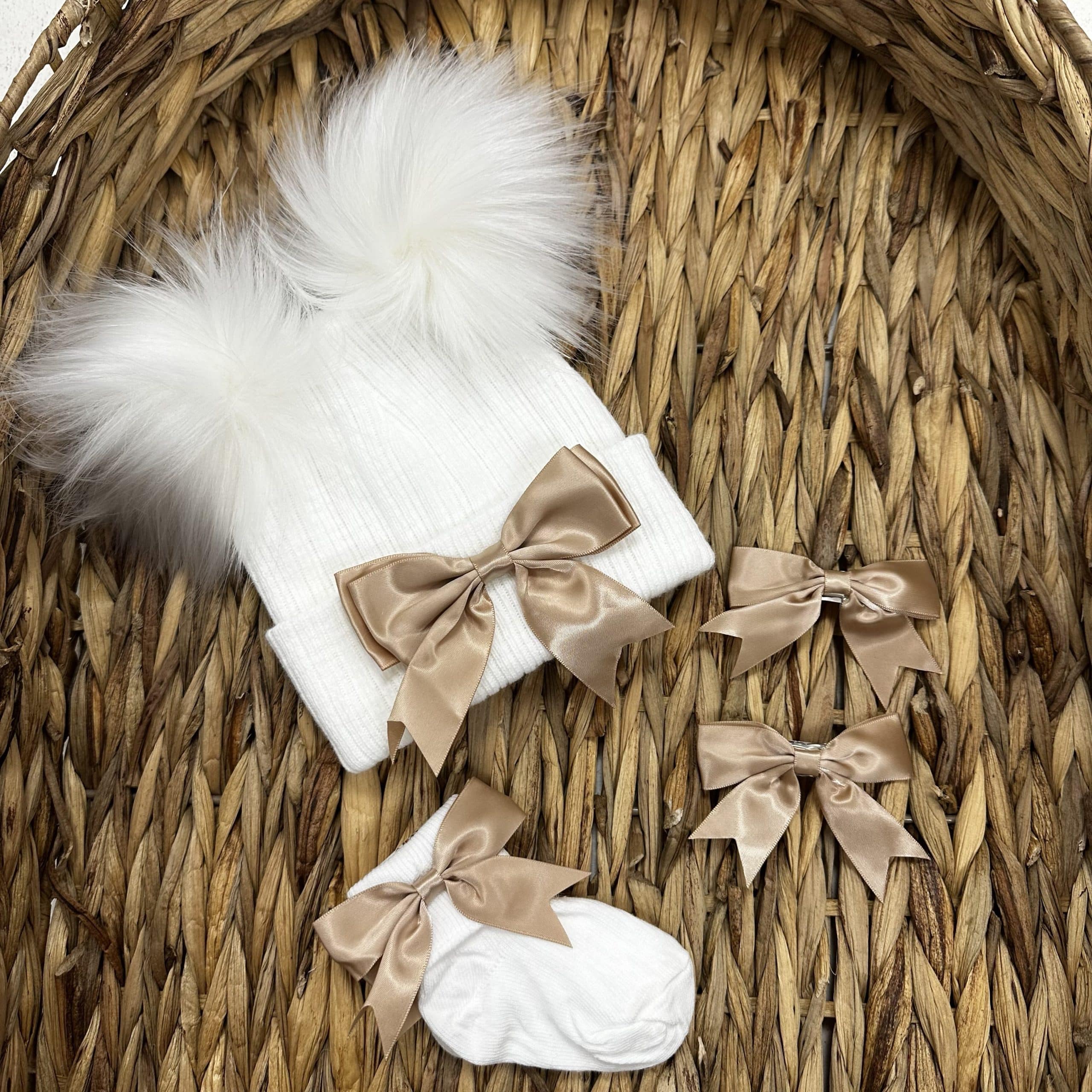 White Double Pom Hat With Beige Bow Socks & Bow Clip Set