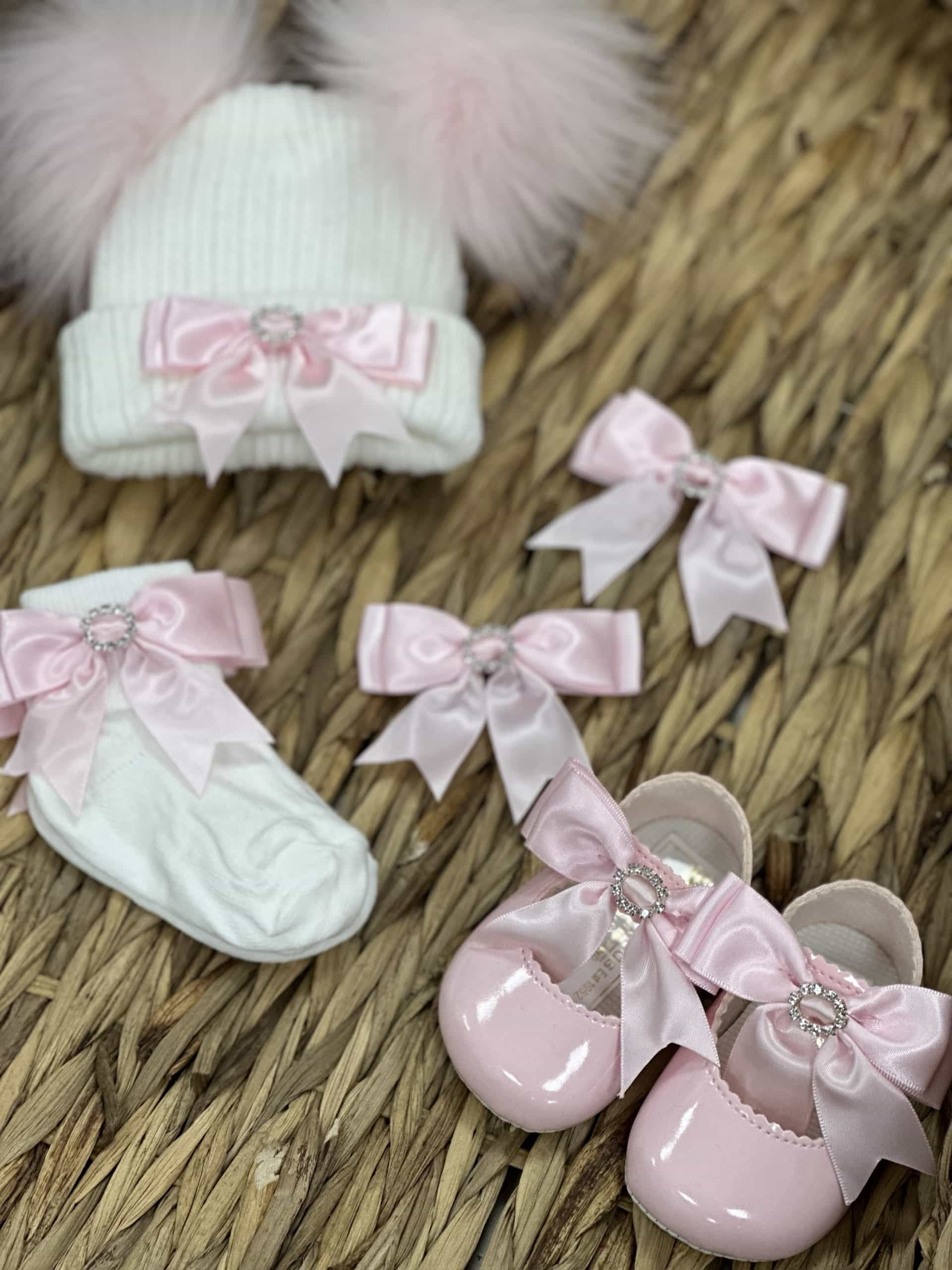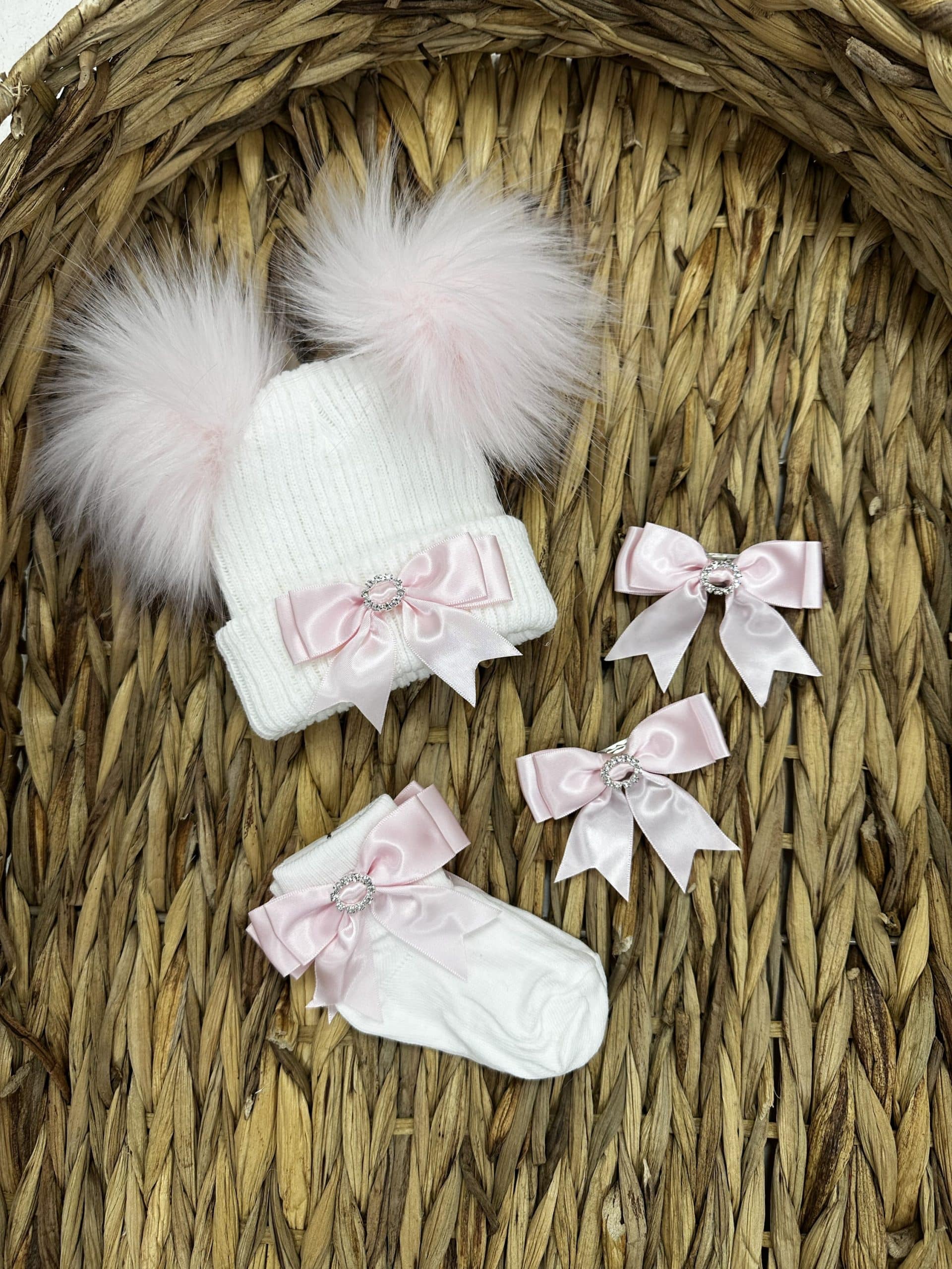White Double Pom Hat With Pink Bow Socks & Bow Clip Set