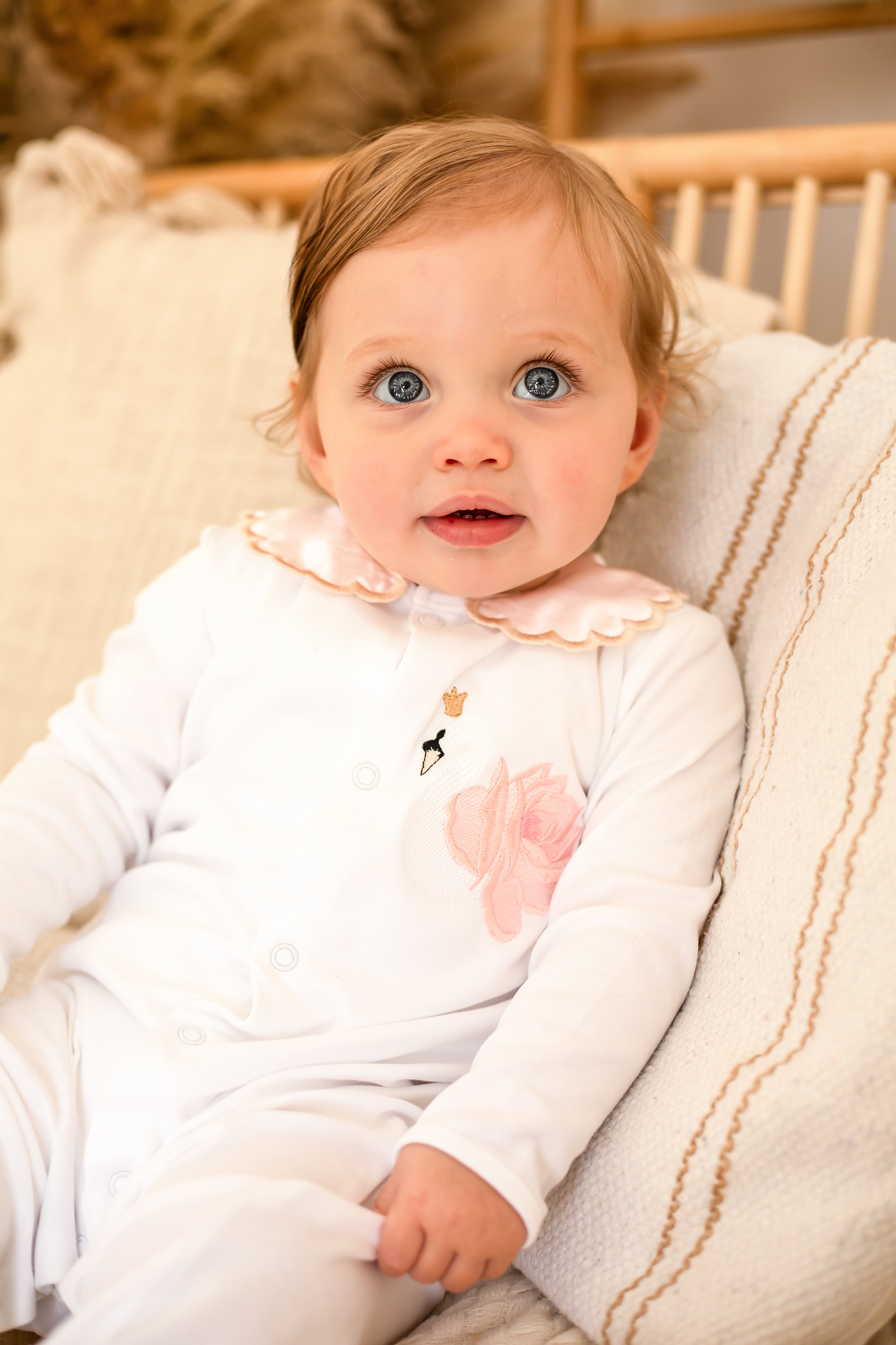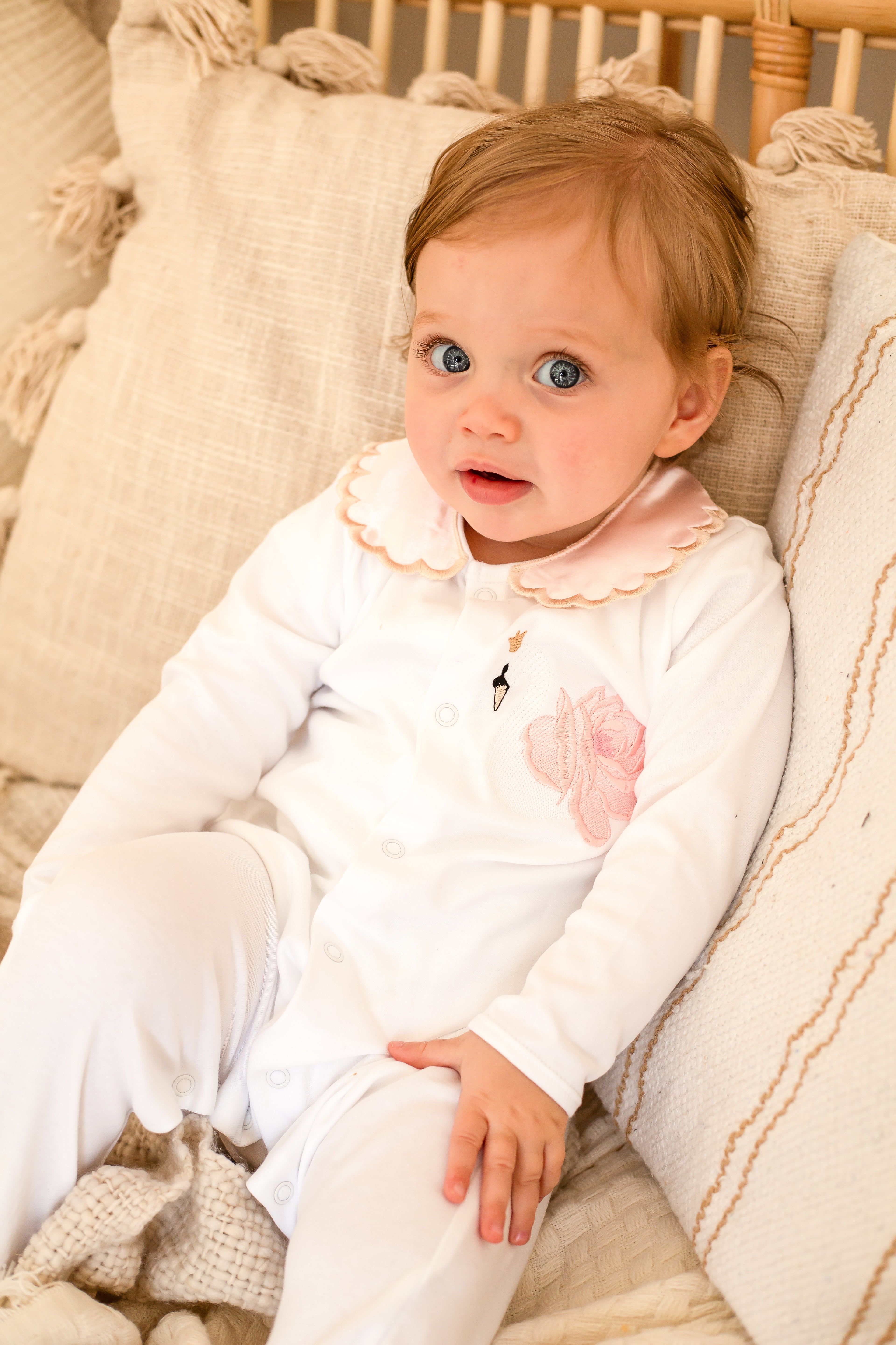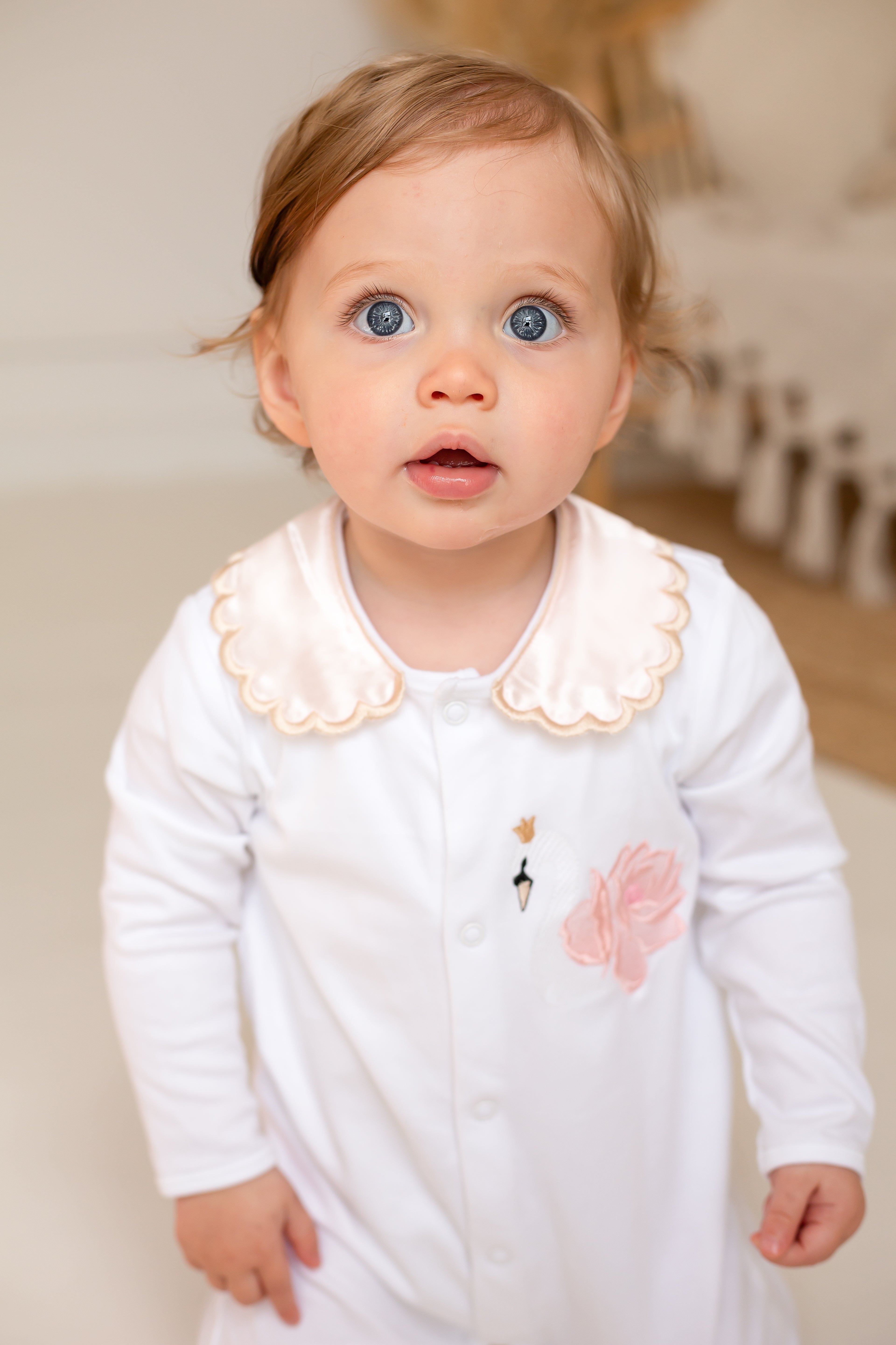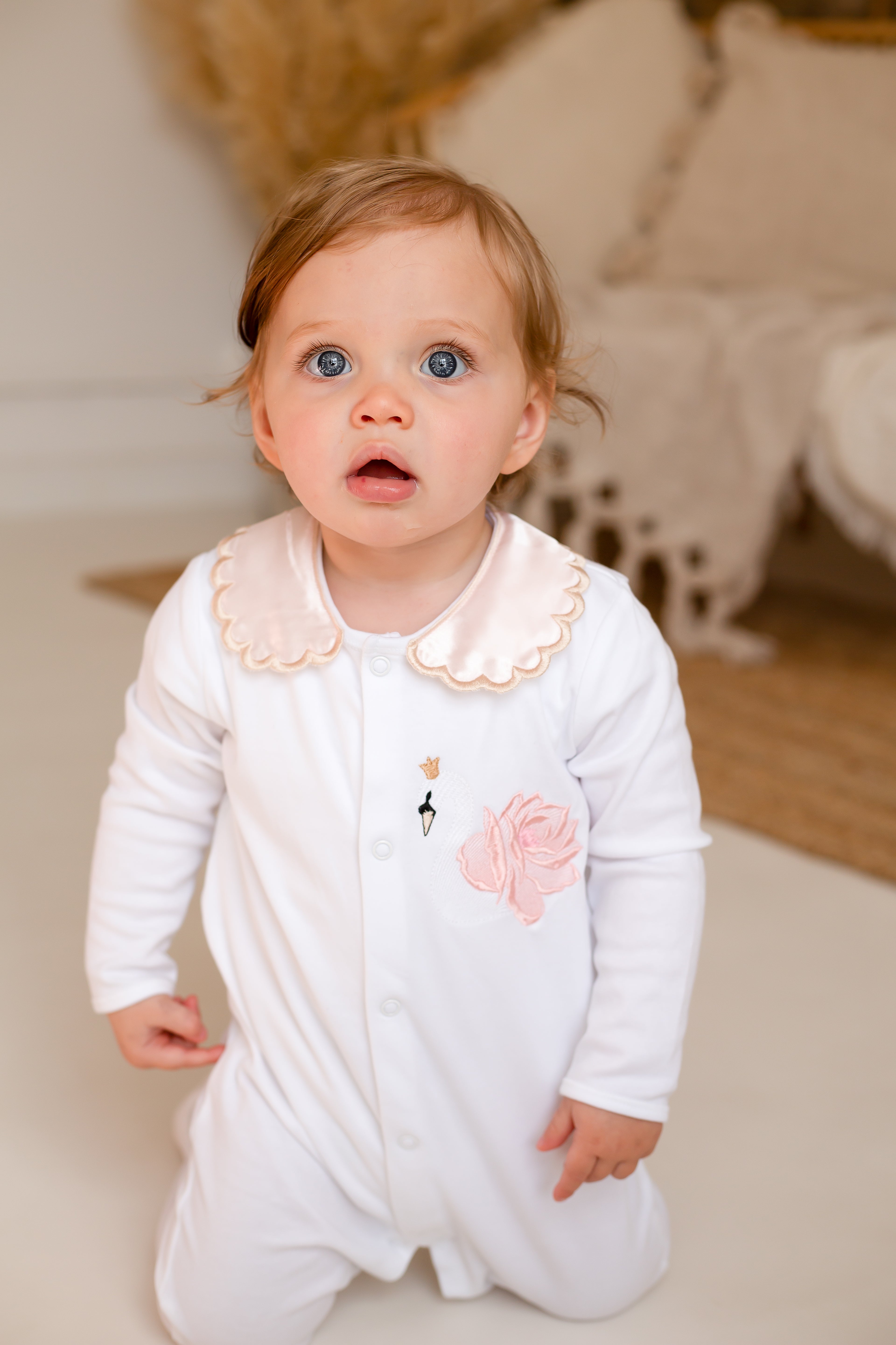This is a beautiful unique handmade sleepsuit , with A handmade collar and matching bib this can be personalised with name embroidery on the Front of sleepsuit with a cute swan design.