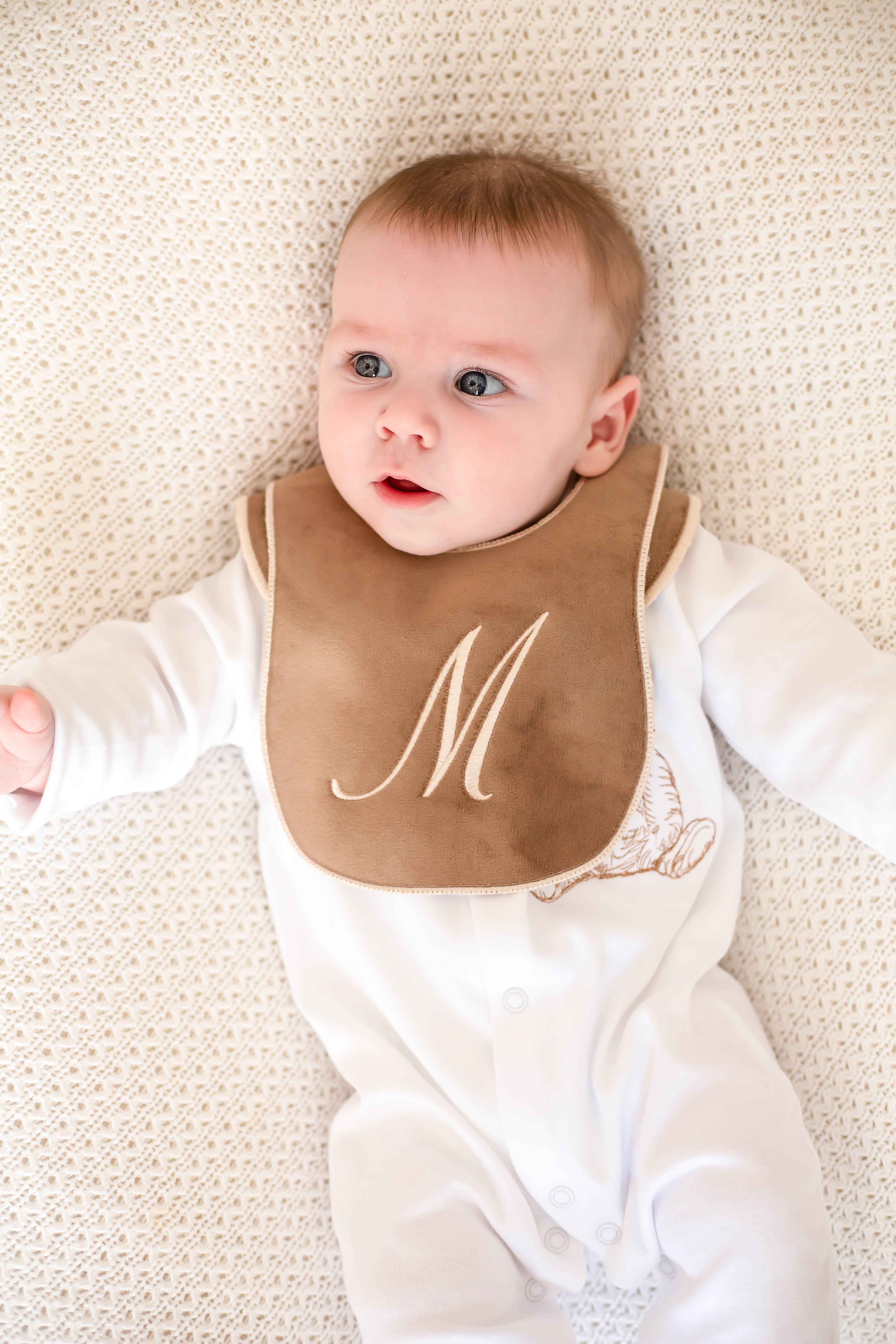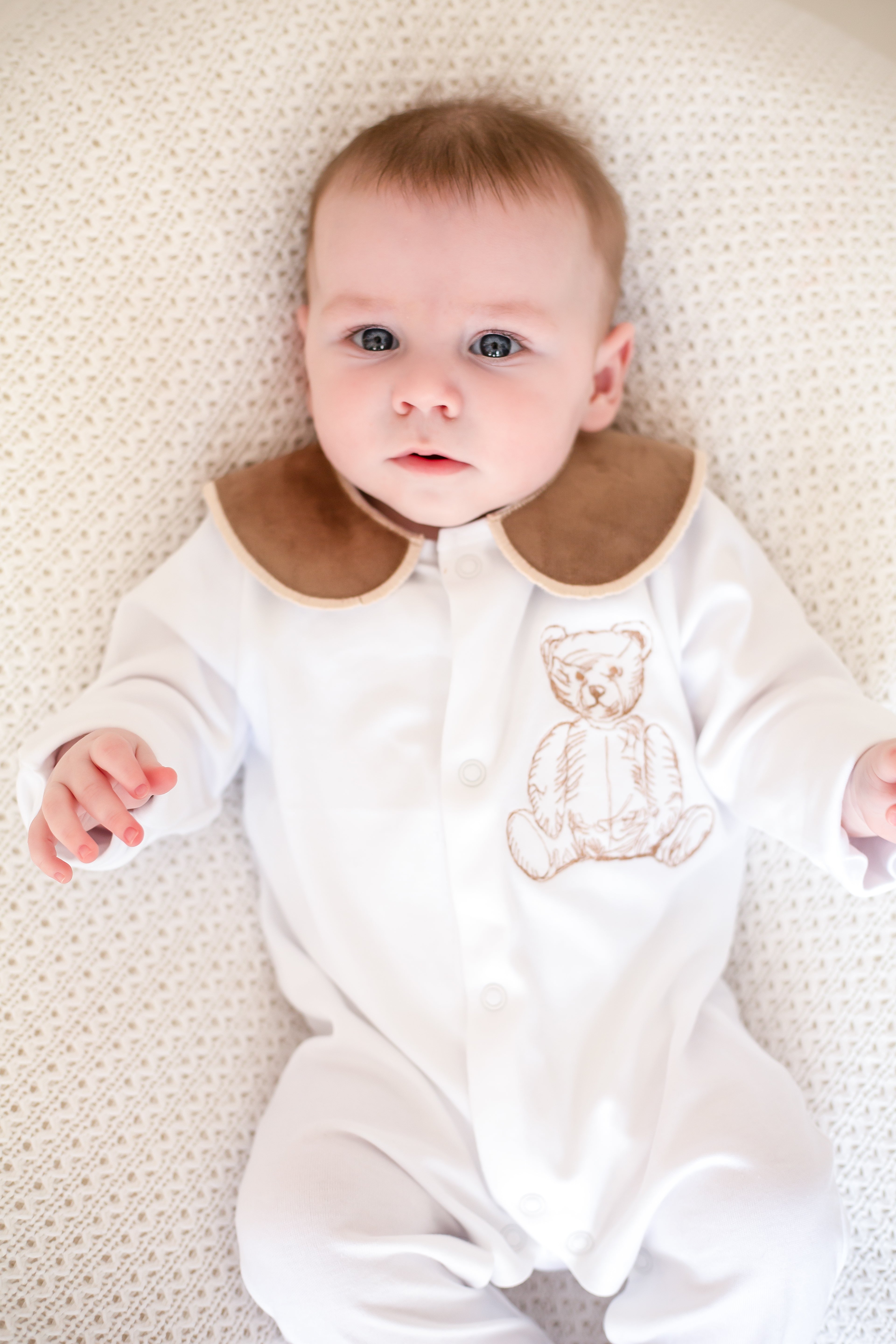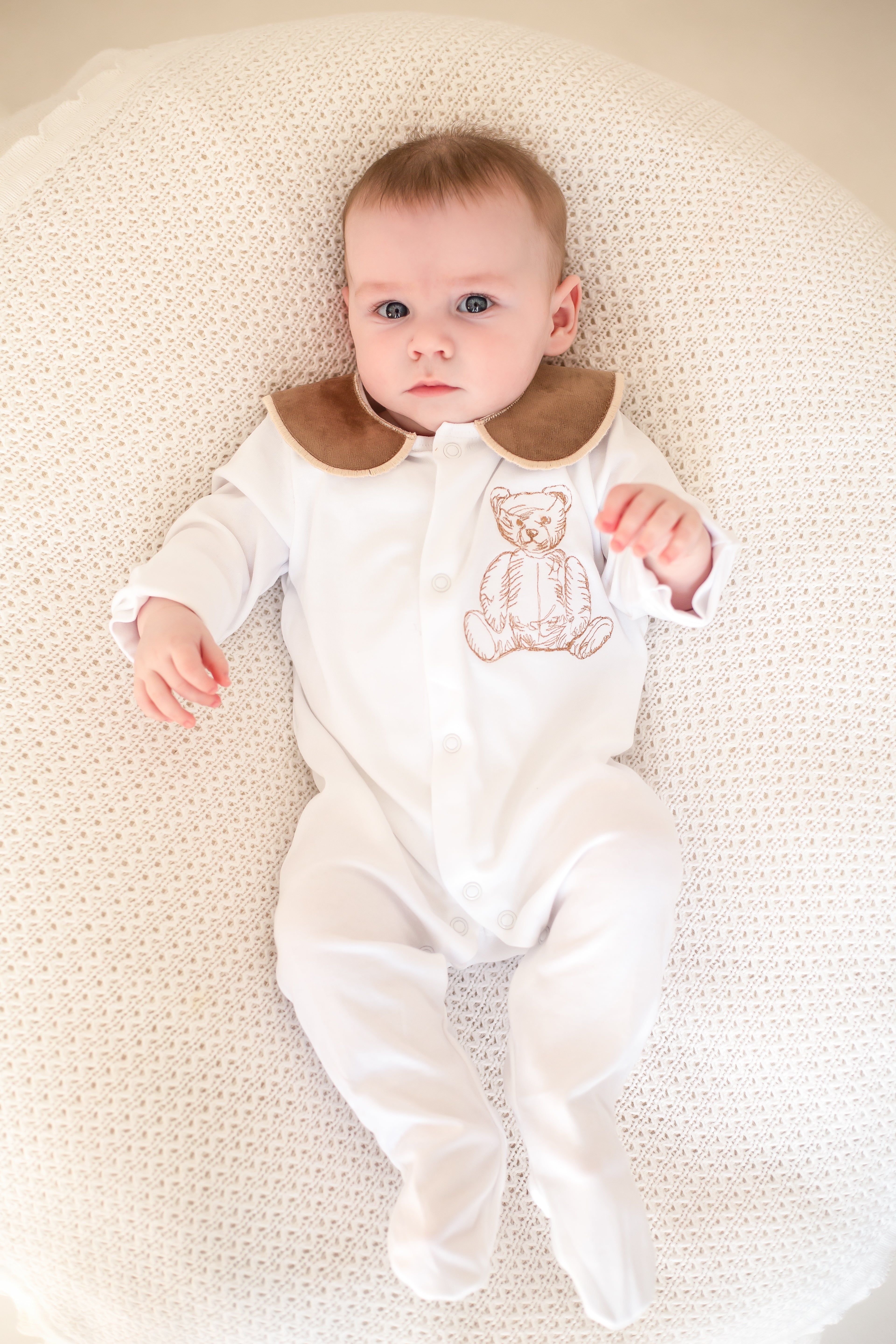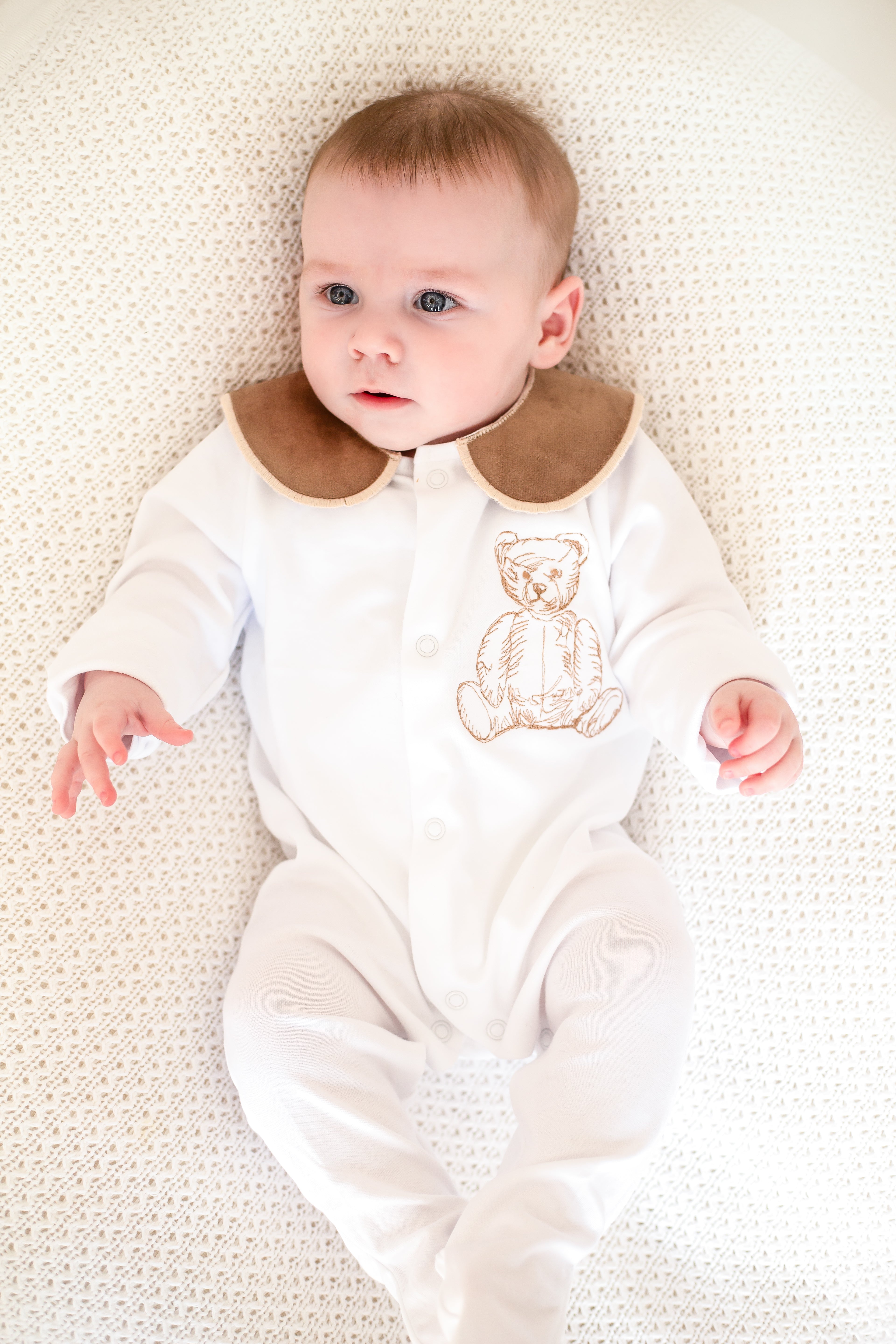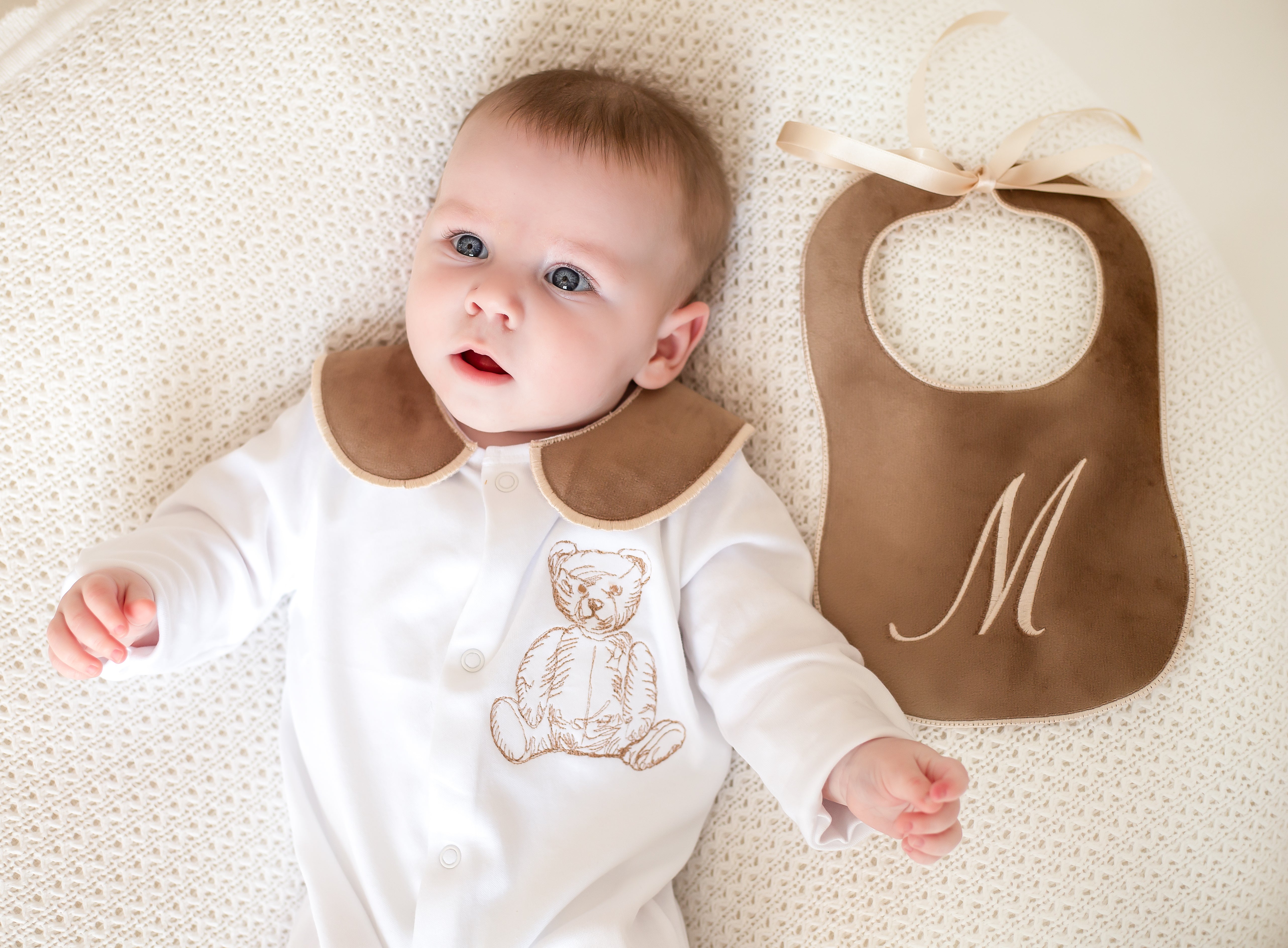 This handmade sleepsuit set is a charming and cozy choice for your little one. Crafted with love and care, the set features a soft, comfortable sleepsuit with a luxurious cotton collar, adding an elegant touch to the overall design with a beautiful embordered bear. The included handmade bib has a name or initial, giving it a whimsical, vintage-inspired look that’s both adorable and timeless.