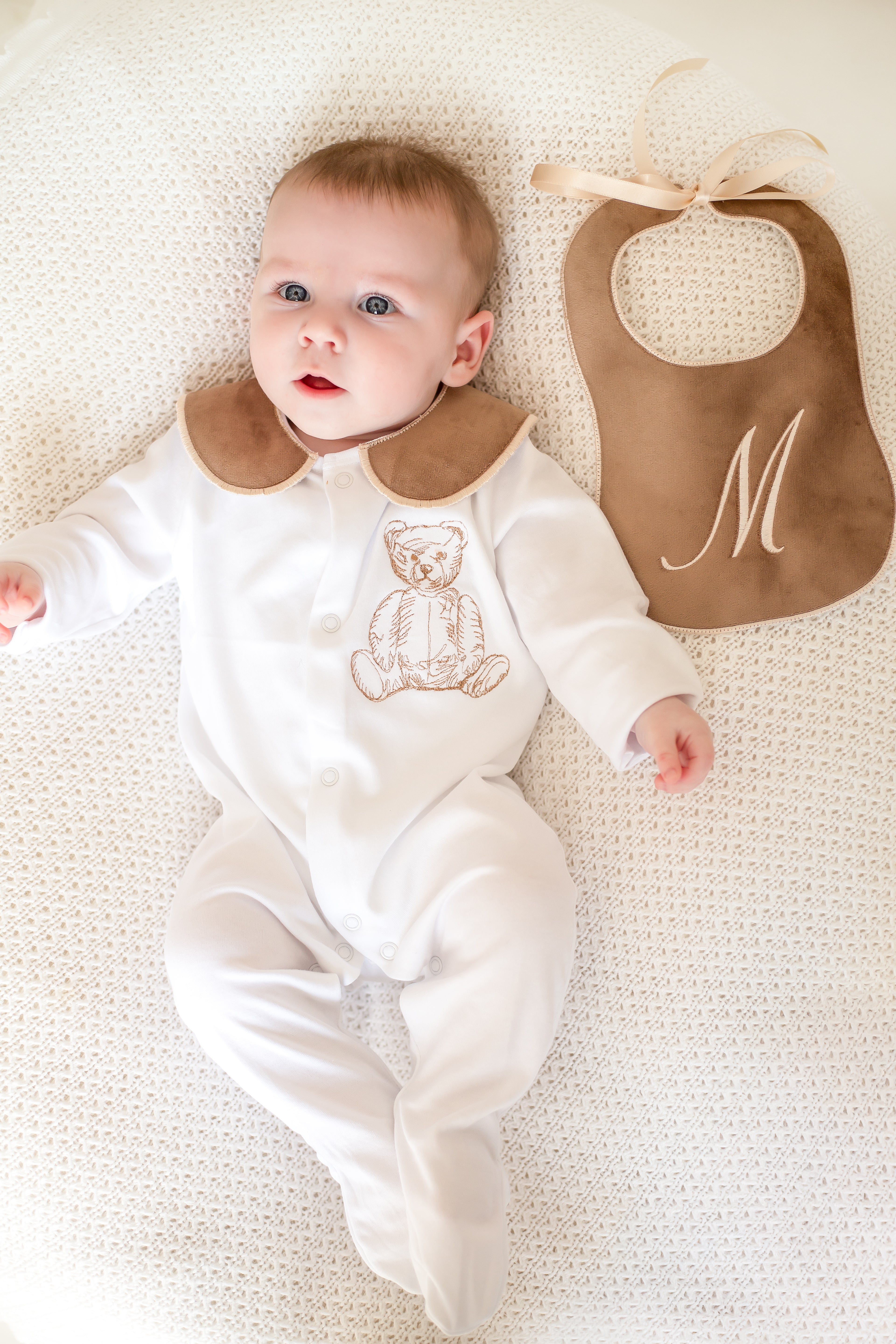 Boys Brown Bear Handmade Sleepsuit & Bib Set