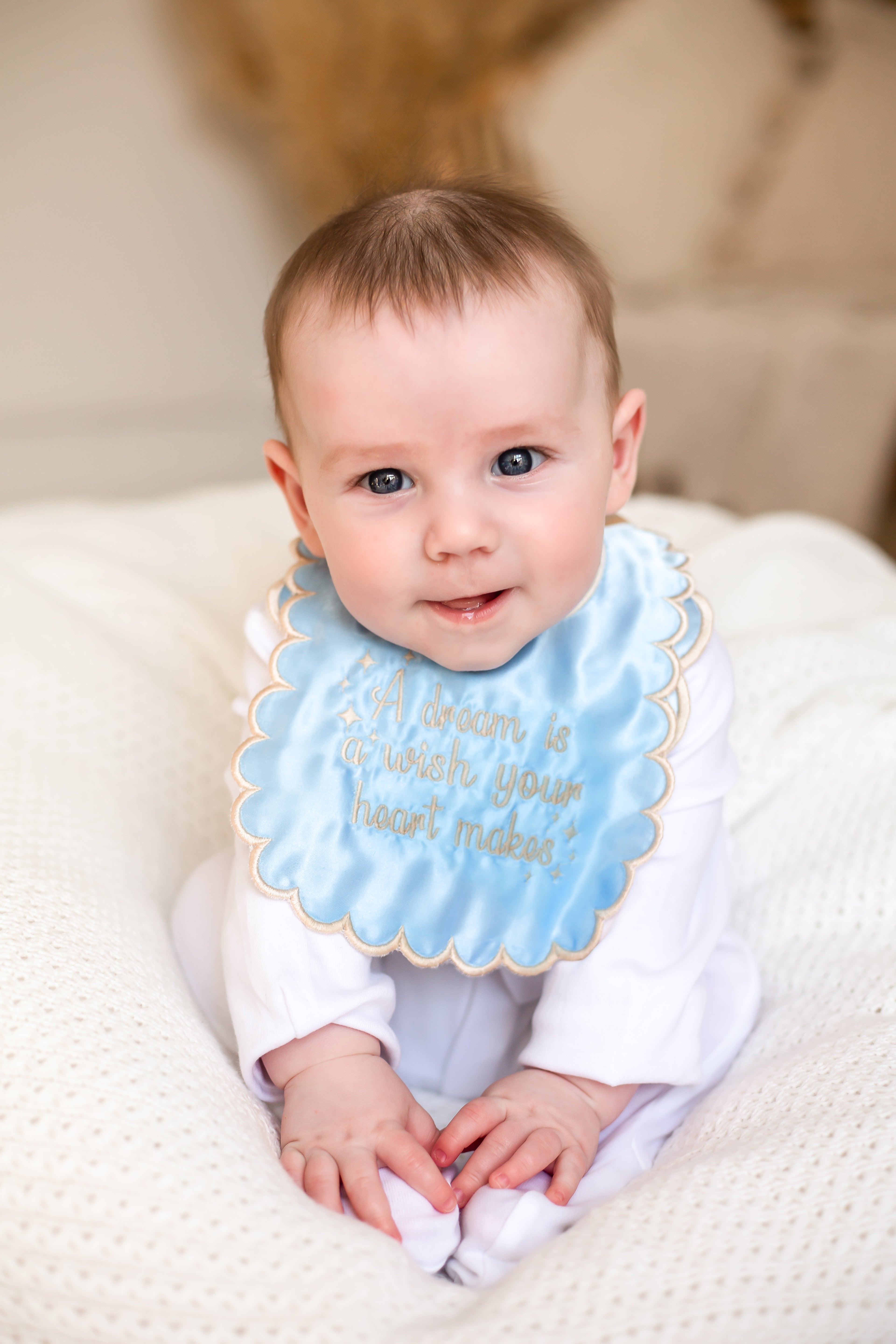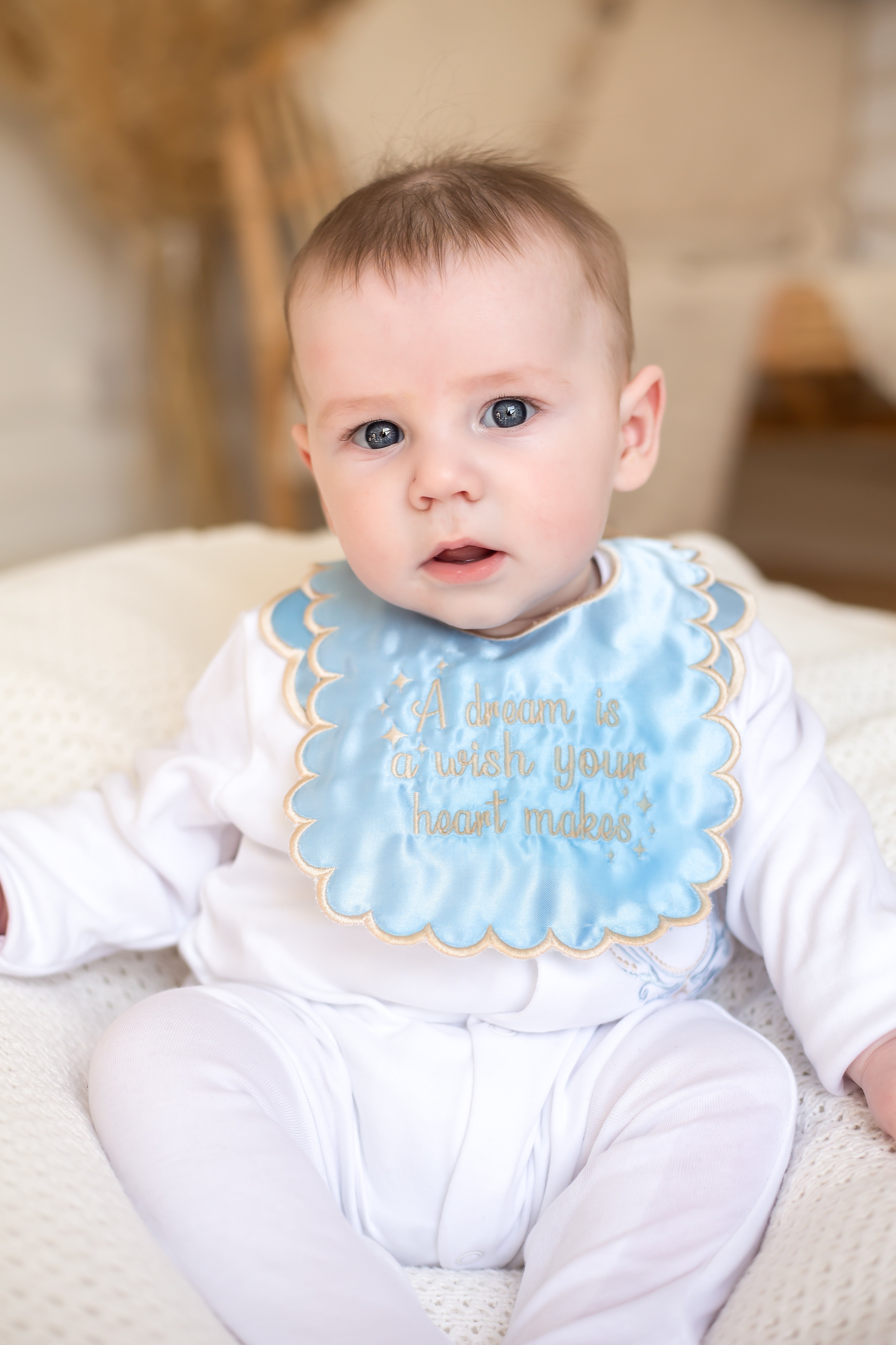 This handmade sleepsuit set is a charming and cozy choice for your little one. Crafted with love and care, the set features a soft, comfortable sleepsuit with a luxurious cotton collar, adding an elegant touch to the overall design. The included handmade bib has a embroidery design on the front saying 'A Dream is a wish your heart makes', giving it a whimsical, vintage-inspired look that’s both adorable and timeless.