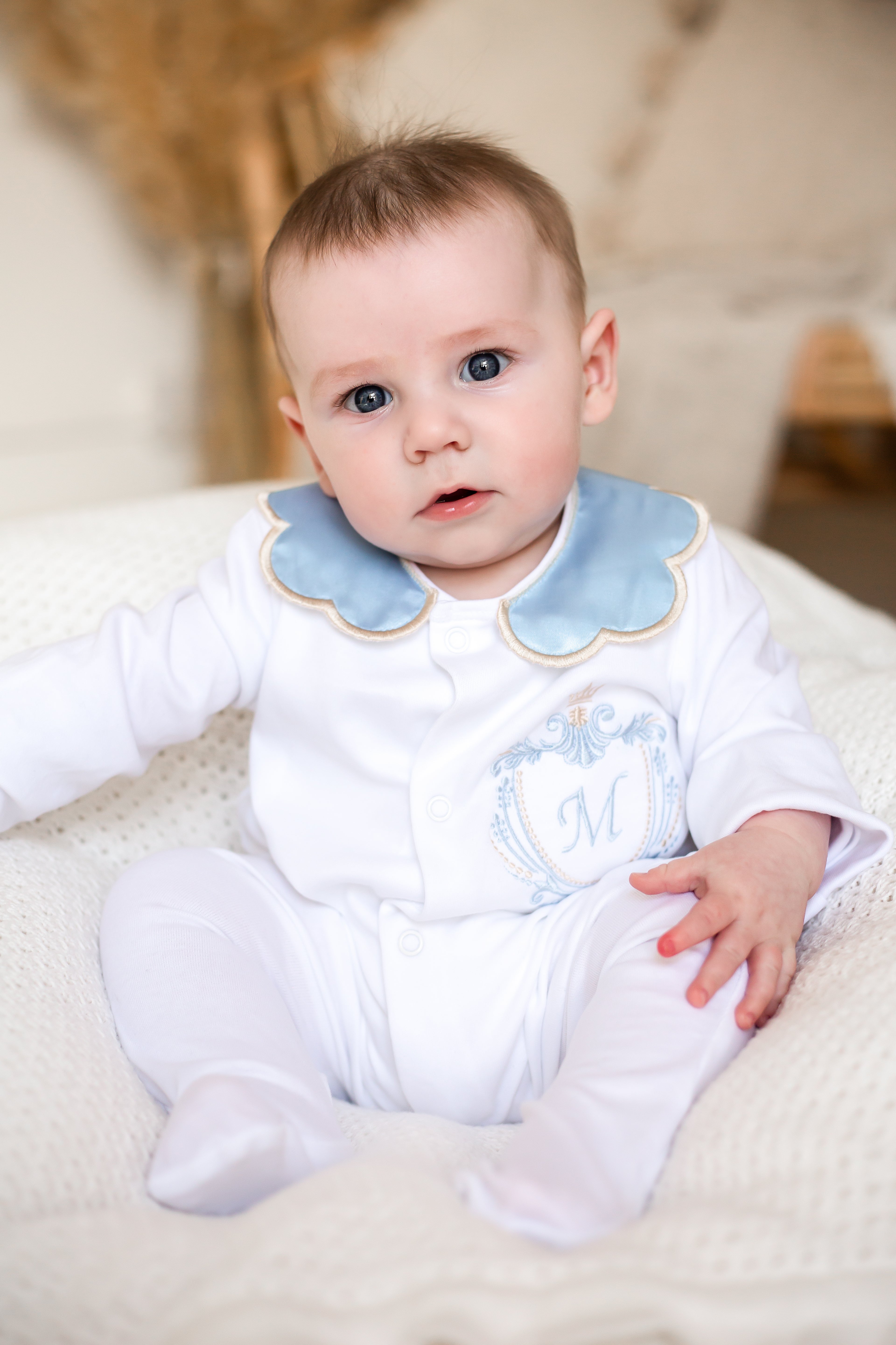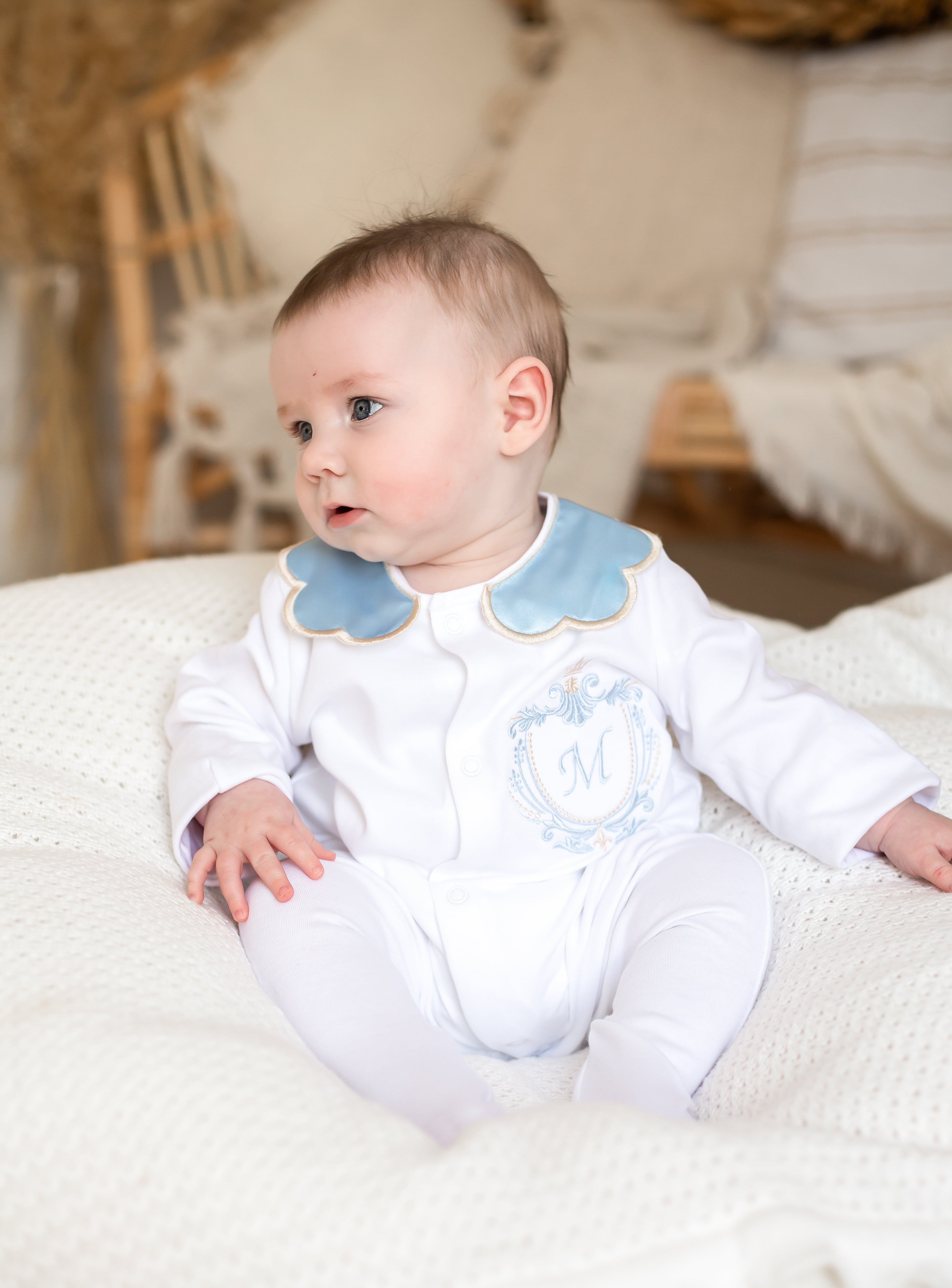 Boys Satin Crest Handmade Sleepsuit & Bib Set