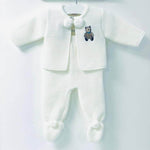 Baby Knitted Jacket with pom poms on the front & Trousers with full foot, perfect for a coming home outfit, Gift for a baby shower. Team it up with a babidu vest under neath.