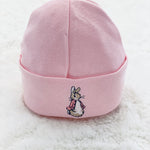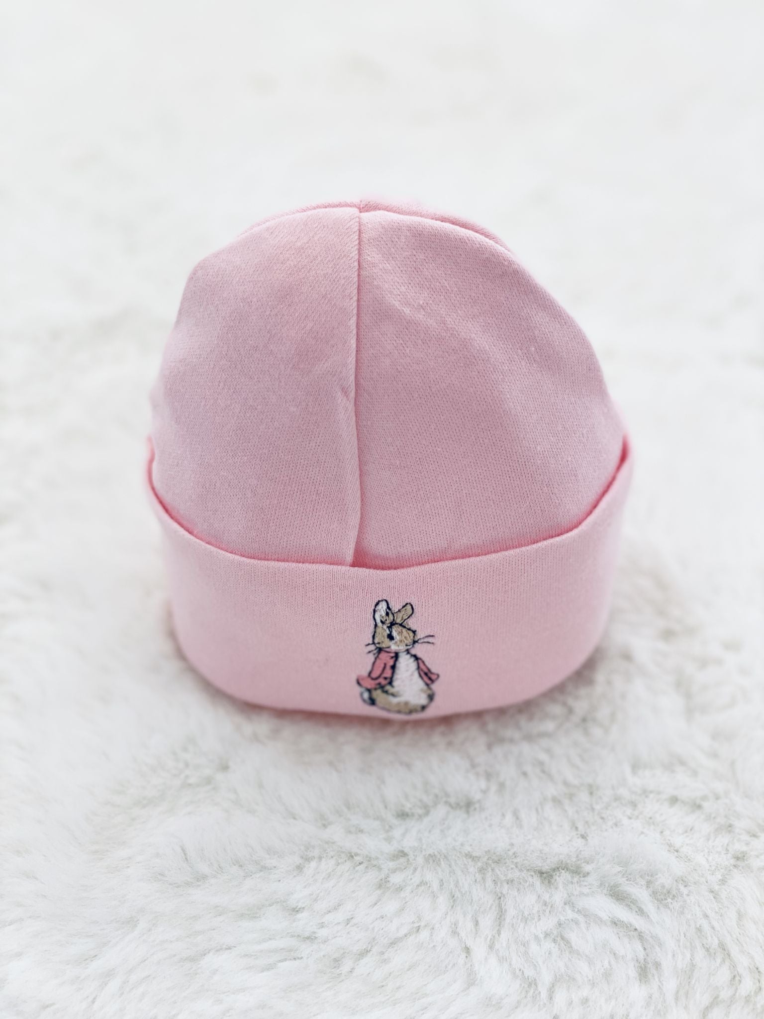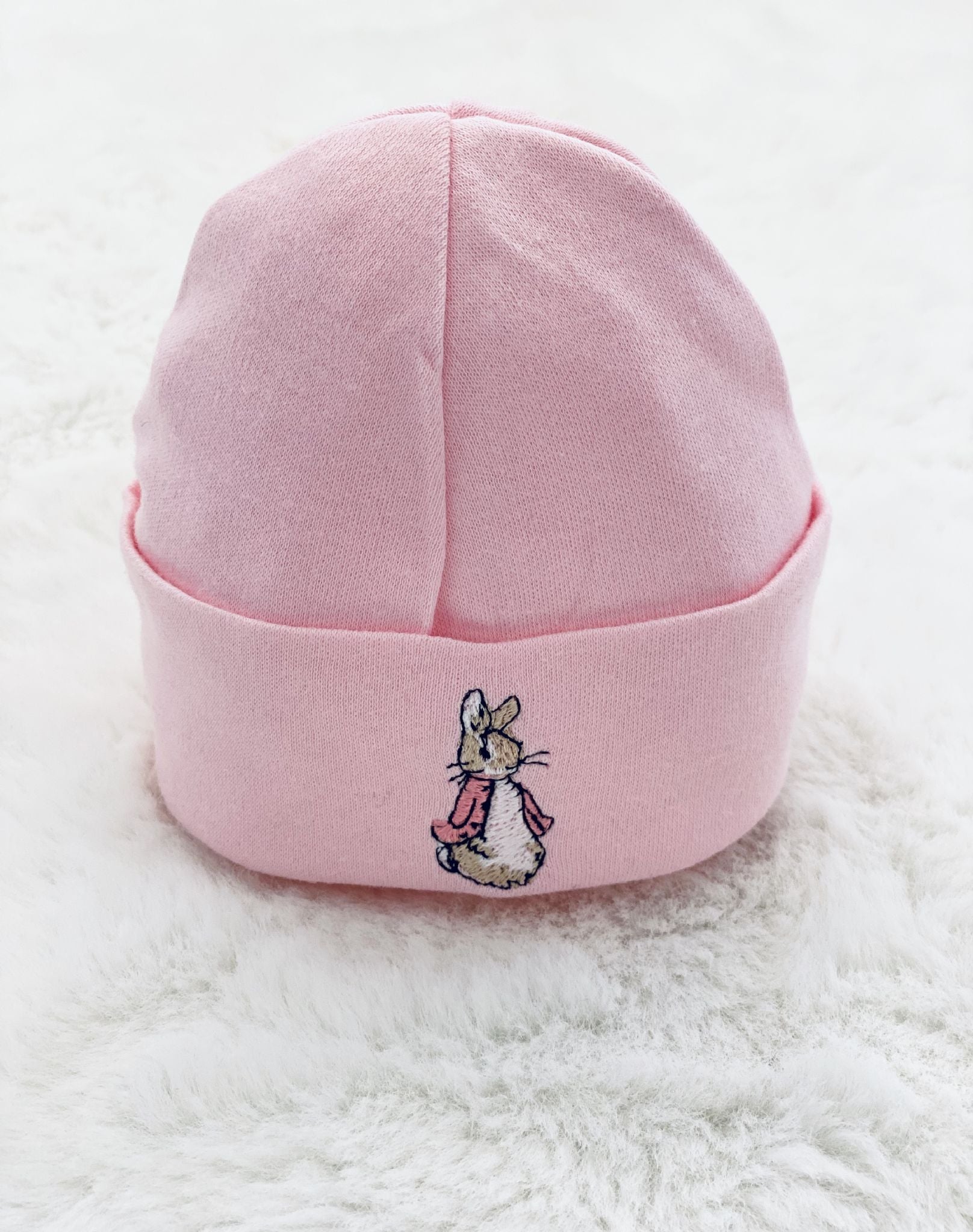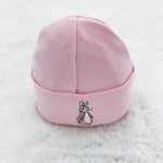 New born pink cotton beanie hat with flopsy rabbit on the front.