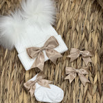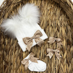 White Double Pom Hat With Beige Bow Socks & Bow Clip Set