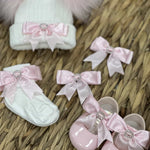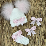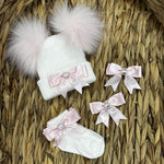 White Double Pom Hat With Pink Bow Socks & Bow Clip Set