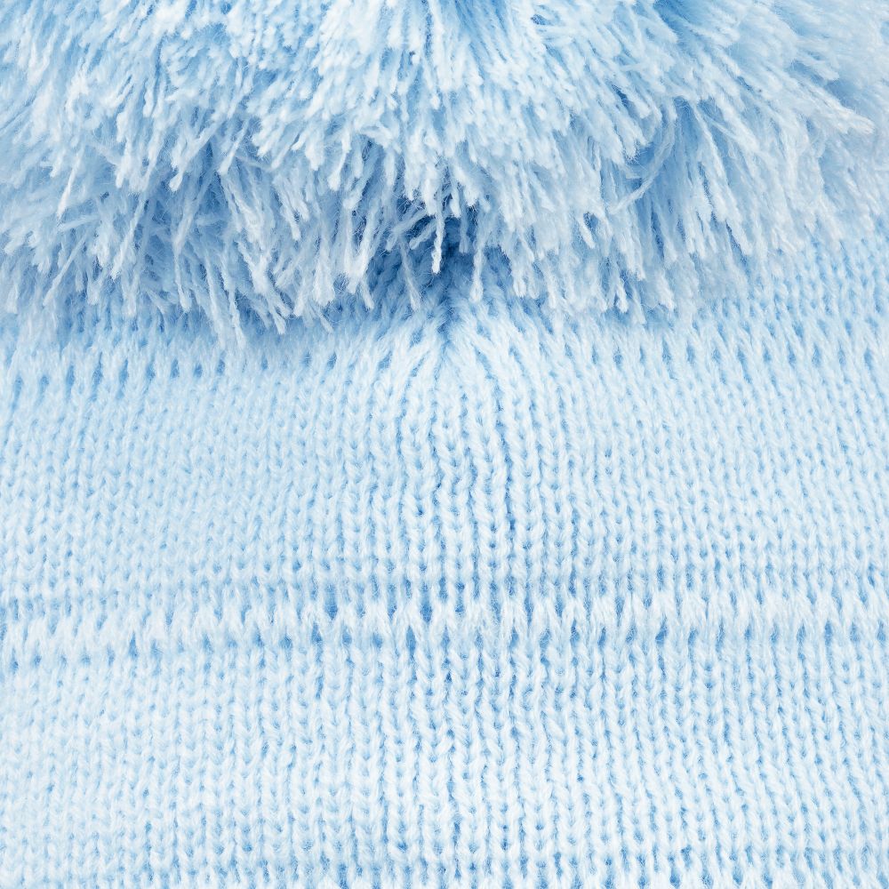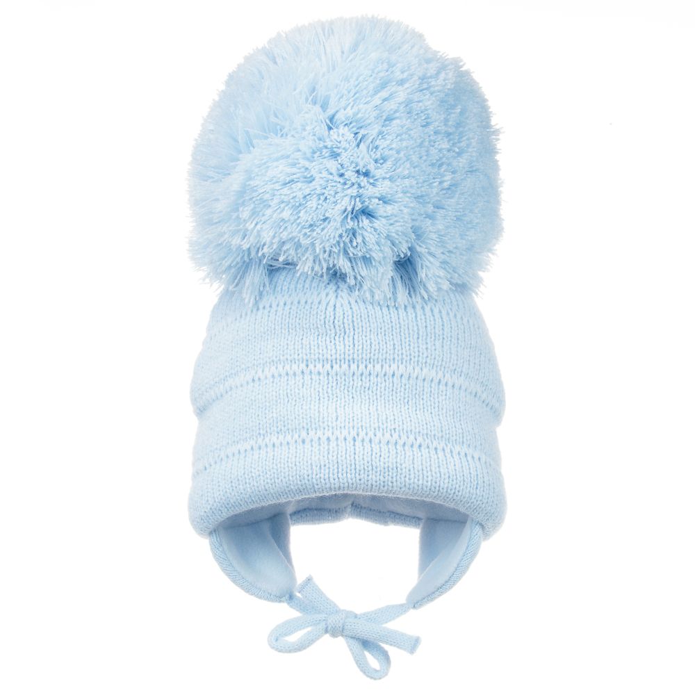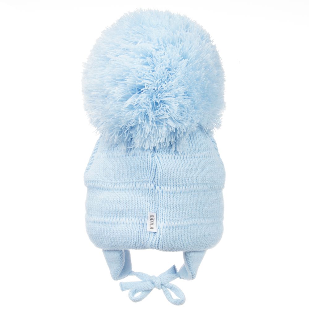 Blue knitted hat for Boys by Sätila of Sweden. Made in soft acrylic, with ear flaps and a warm fleece lining. It has a Big giant pom-pom on top and knitted ties to secure under the chin. Beautiful for little boys.