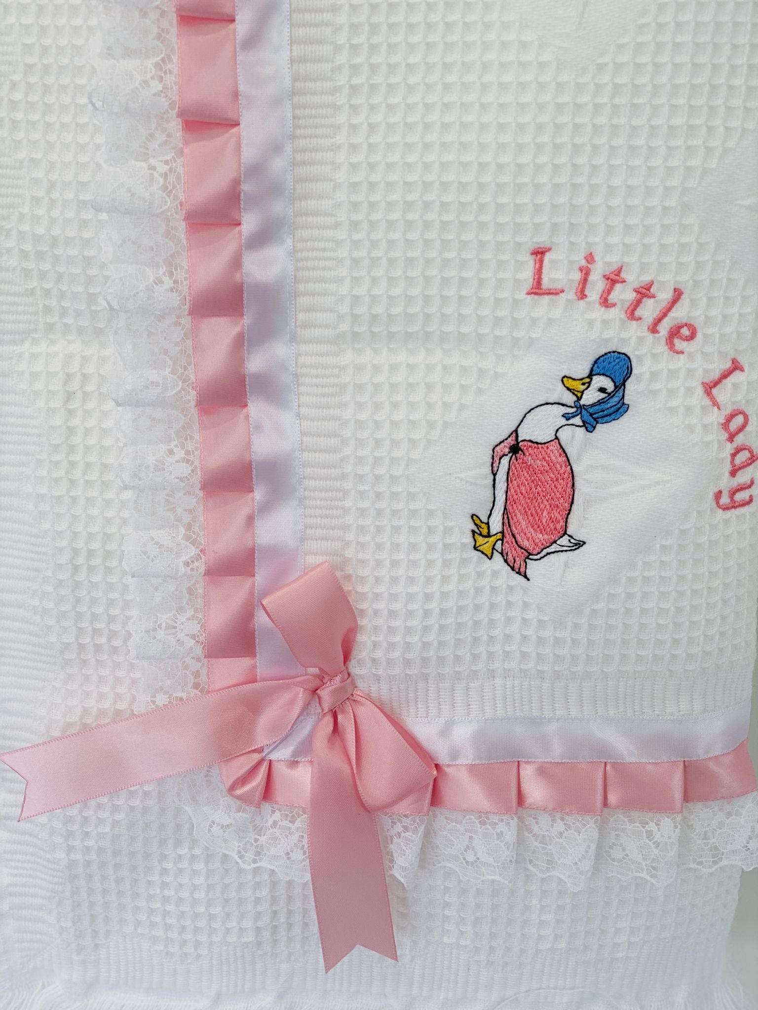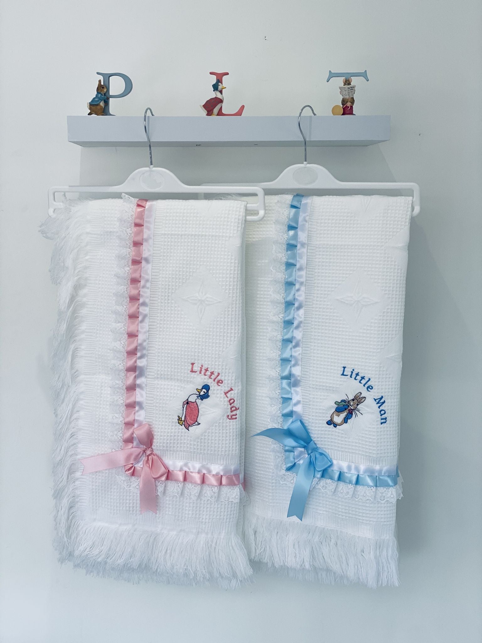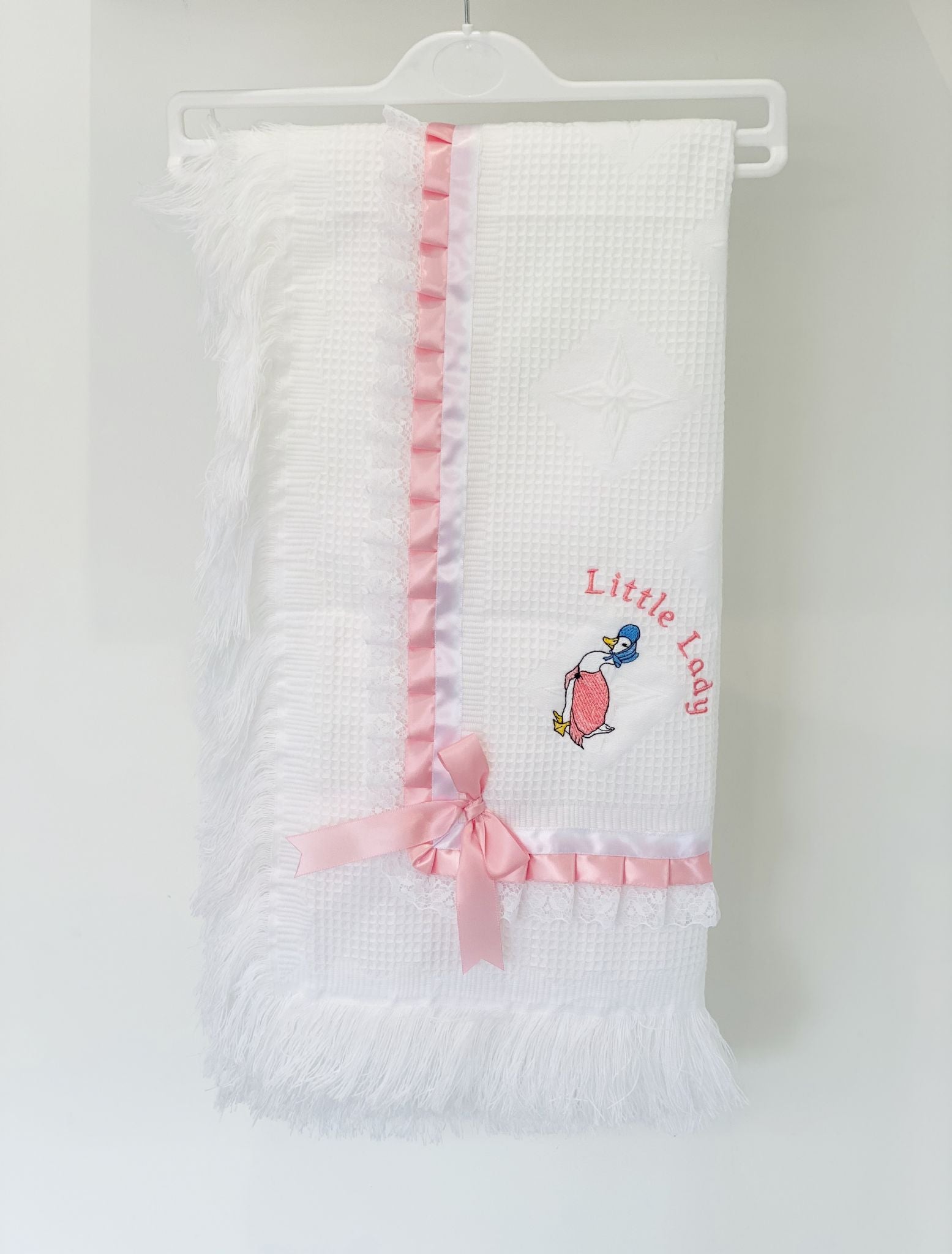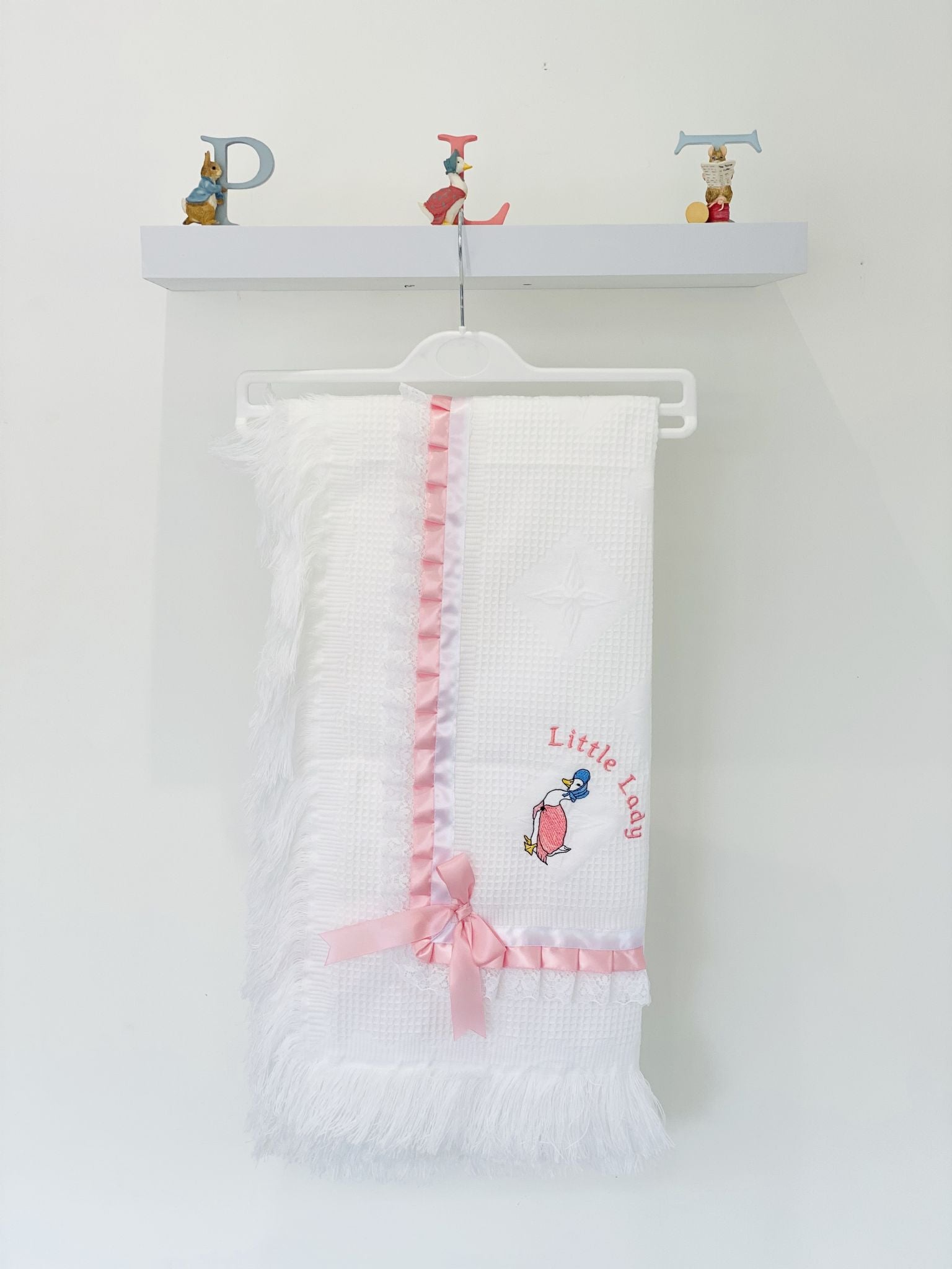 Perfect Little Thing baby shawl comes in a varied design with a lace ribbon and frill edge.