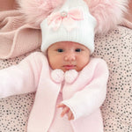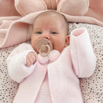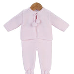 Baby girls Knitted Jacket with pom poms on the front and & Trousers with full foot, perfect for a coming home outfit, Gift for a baby shower. Team it up with a babidu vest under neath.