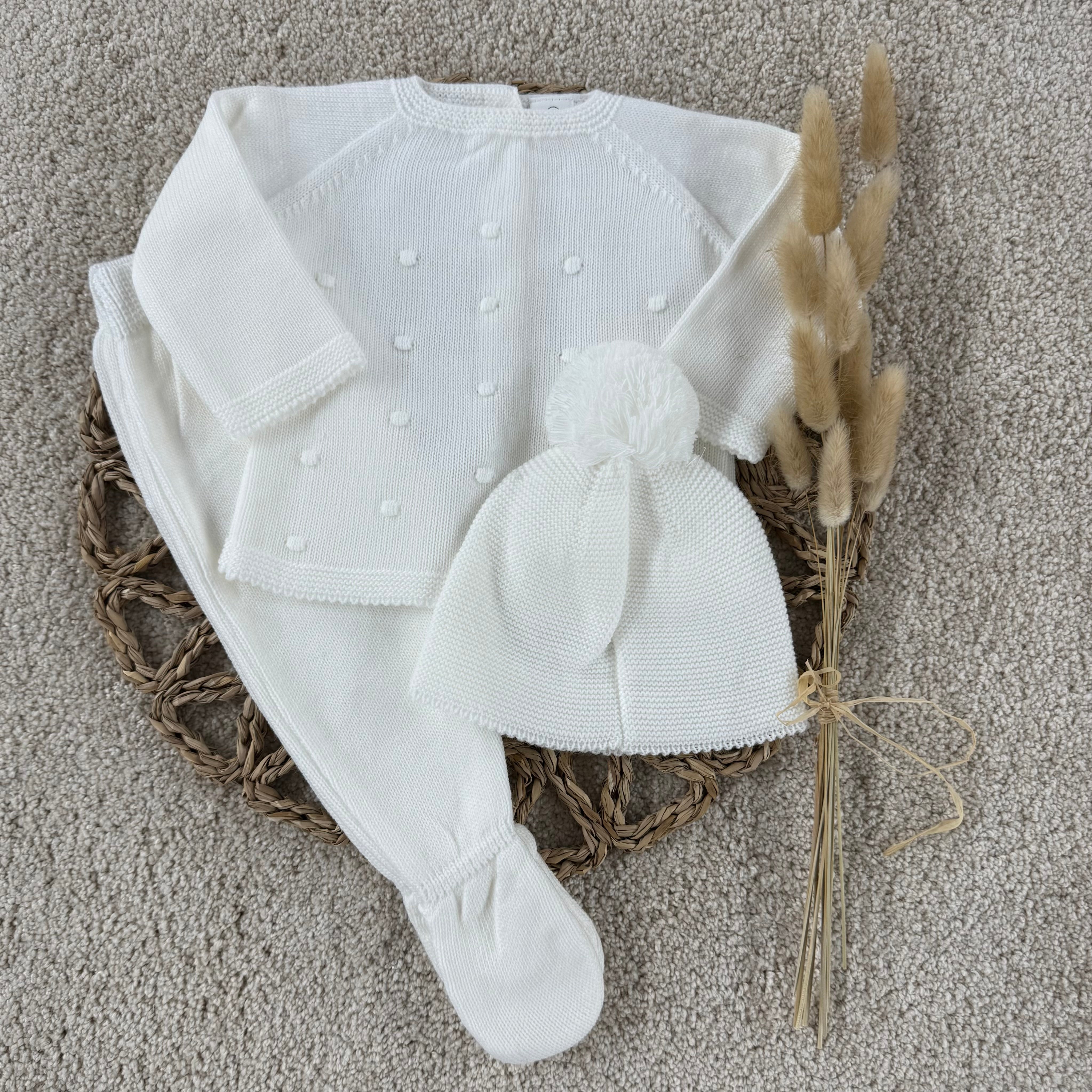 Wrap your little one in timeless elegance with this beautifully crafted Spanish knitted 3-piece outfit. Made from soft, breathable yarn, this charming set includes knitted pants, a long-sleeve top, and a matching beanie hat topped with an adorable pom.