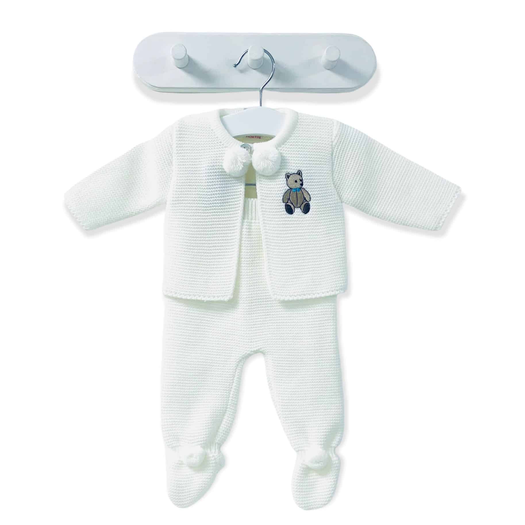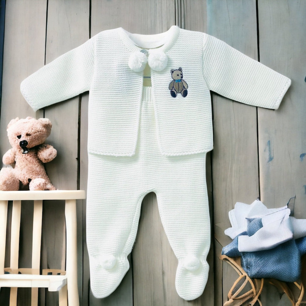 Baby Knitted Jacket with pom poms on the front & Trousers with full foot, perfect for a coming home outfit, Gift for a baby shower. Team it up with a babidu vest under neath.