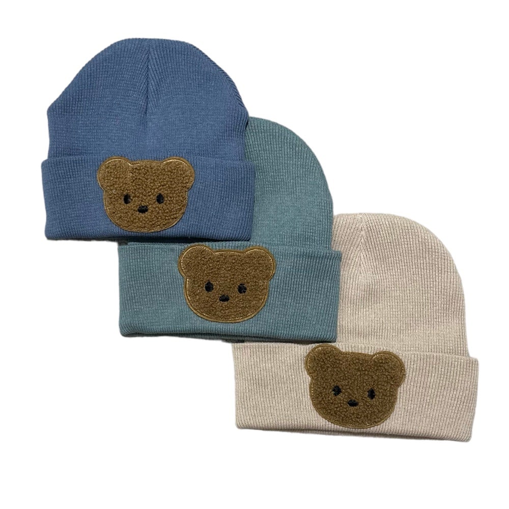 Our adorable 100% cotton beanie hat with a Brown bear appliques on the front. This comes with a pair of cotton mittens to match, Size is 0-12 months.