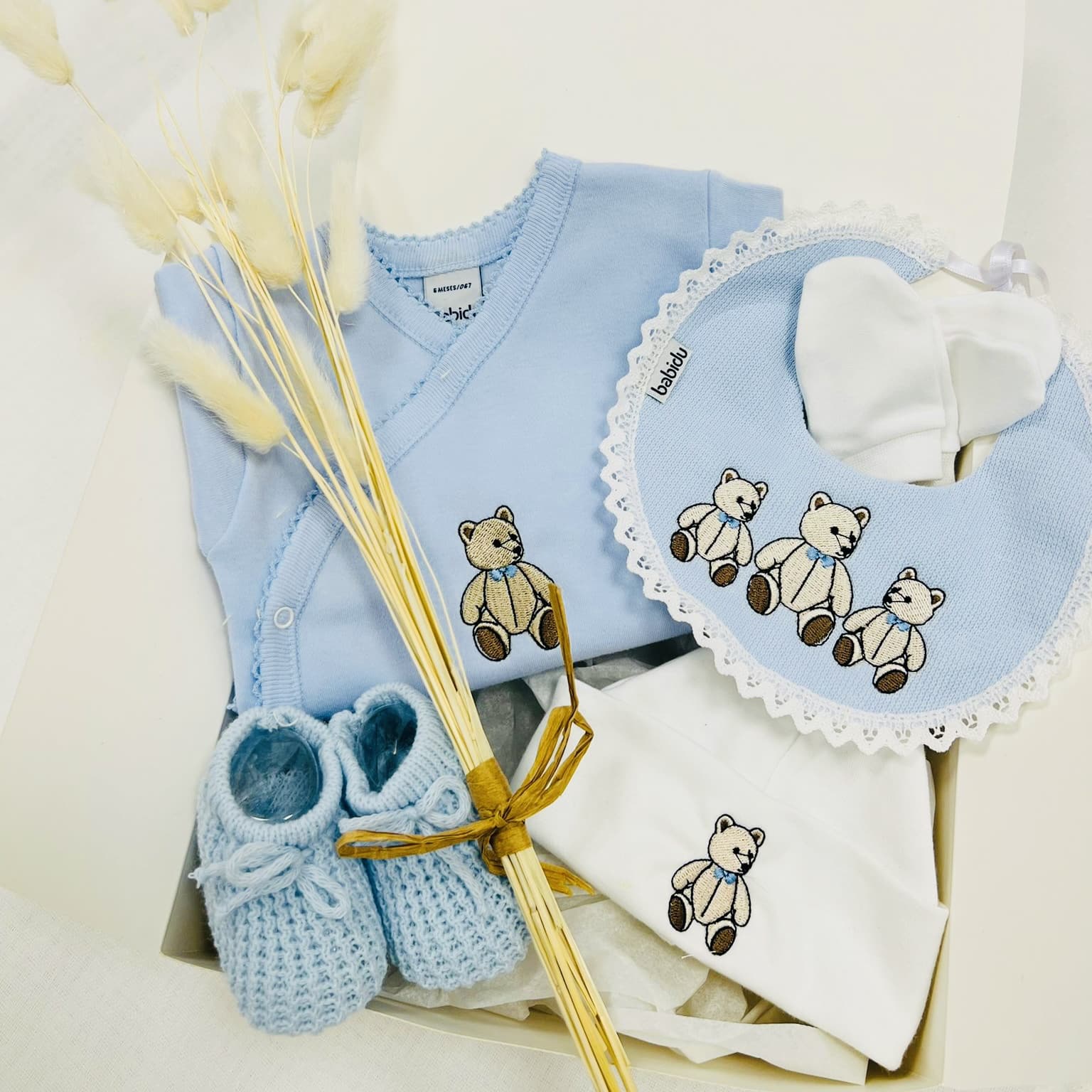 The set includes a babidu vest, beanie hat, knitted booties and babidu bib.