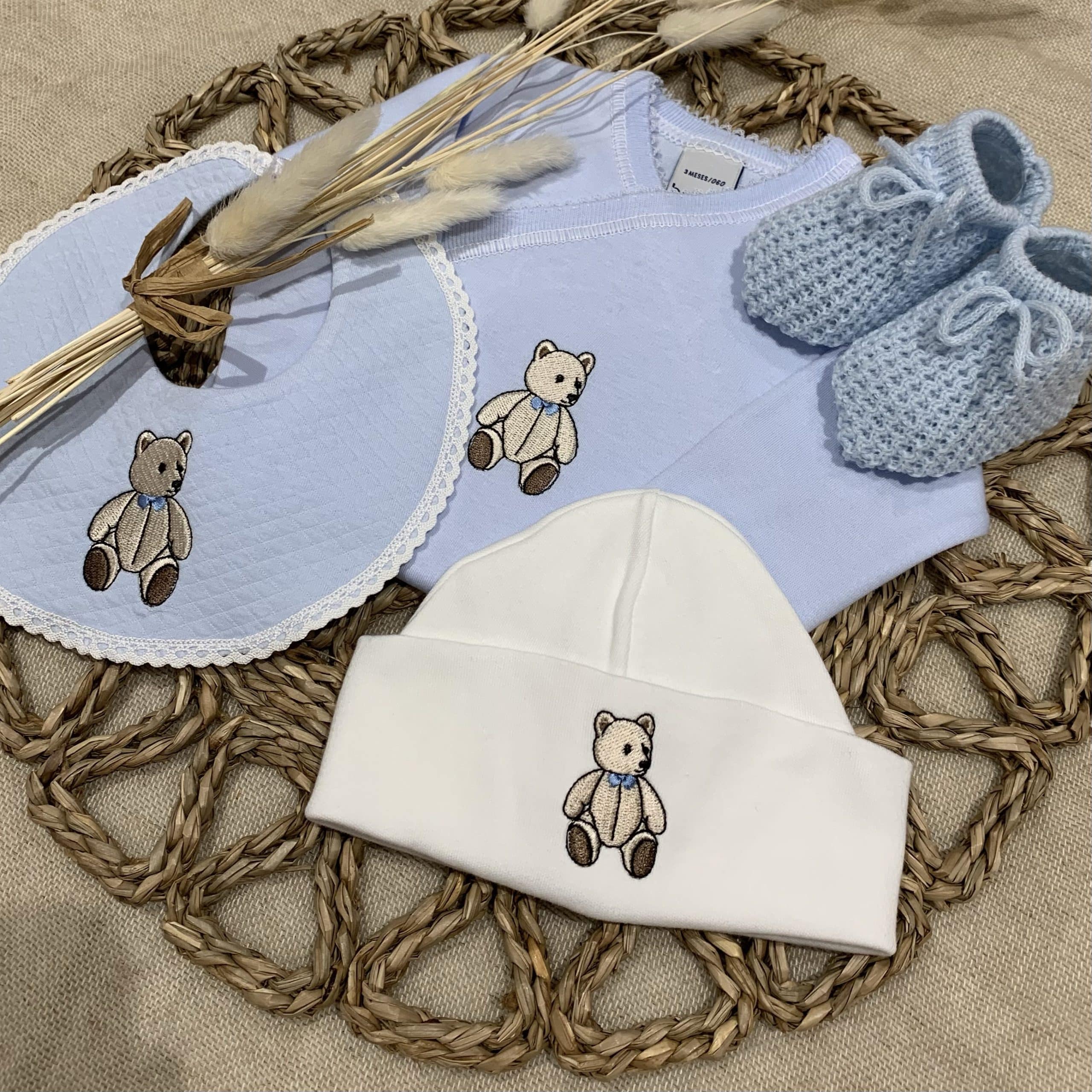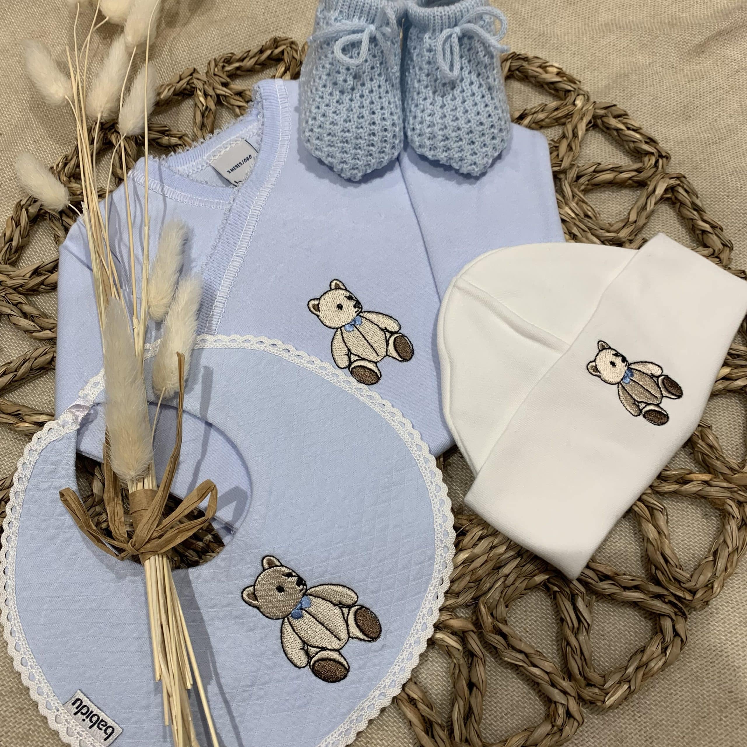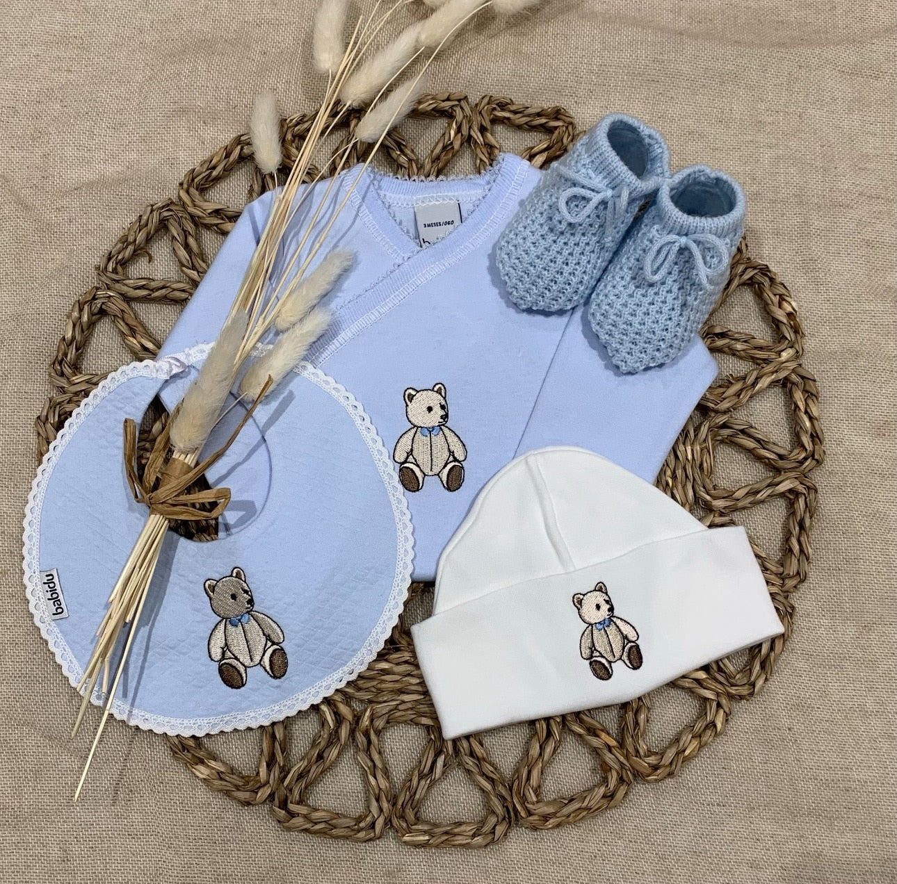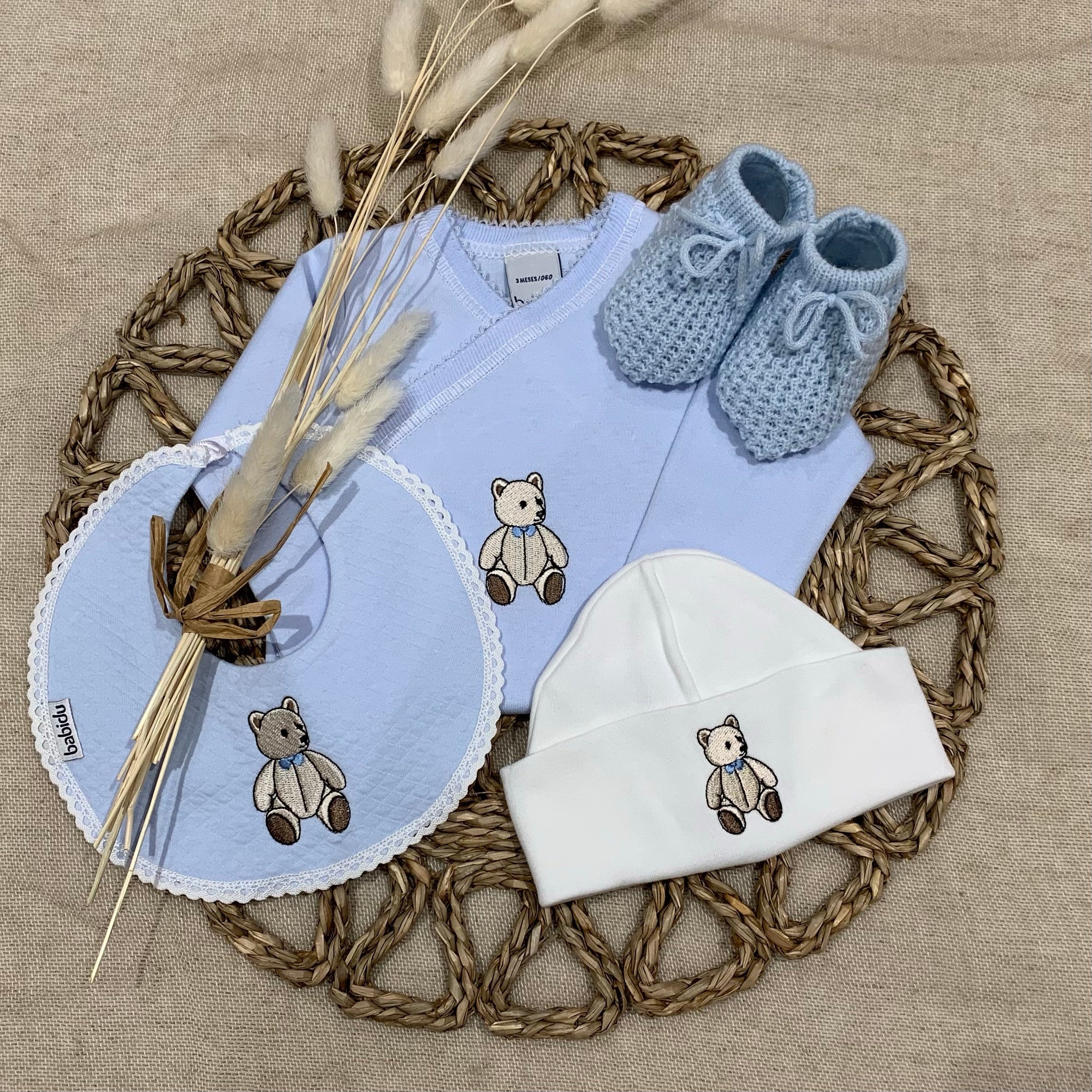 The set includes a babidu vest, beanie hat, knitted booties and babidu bib.