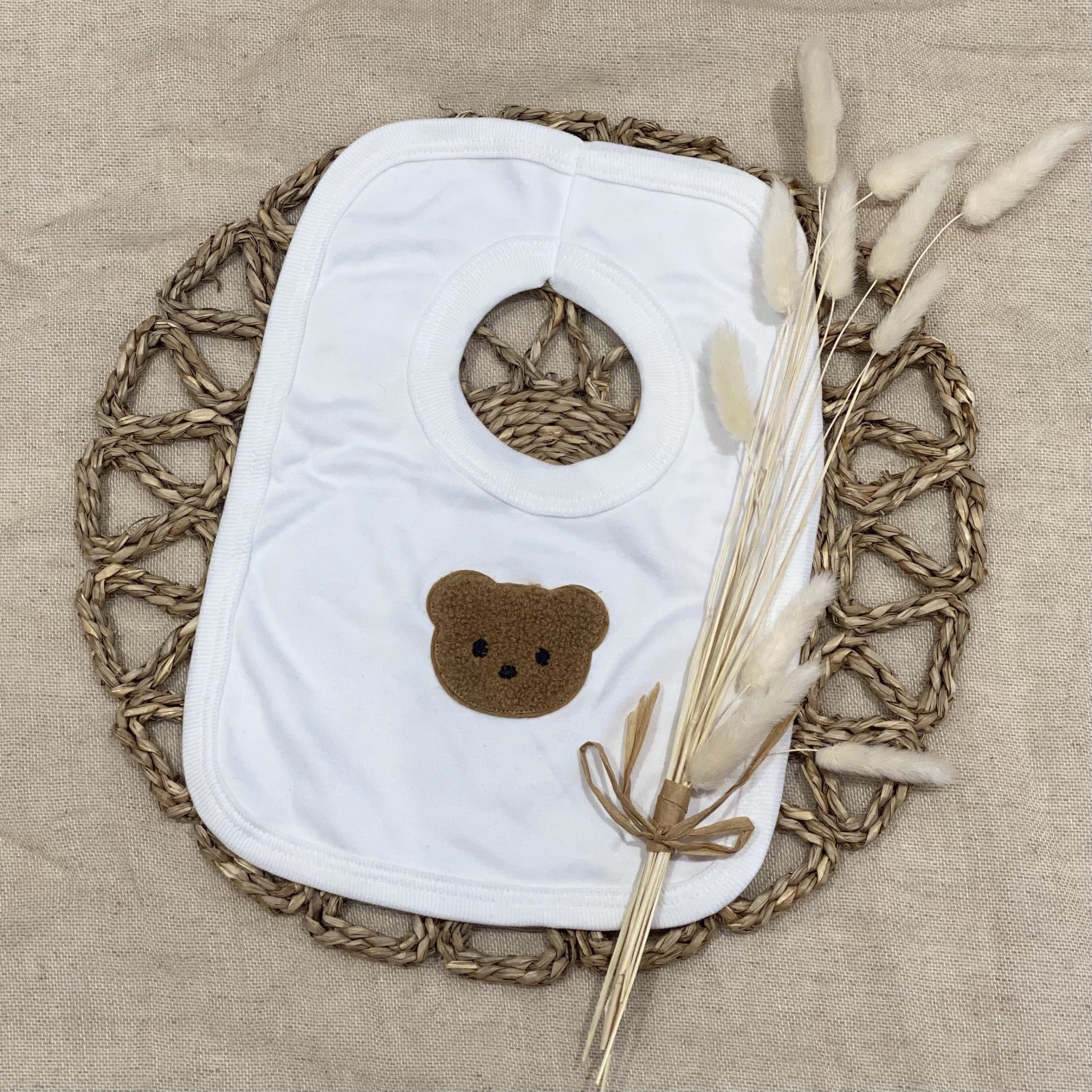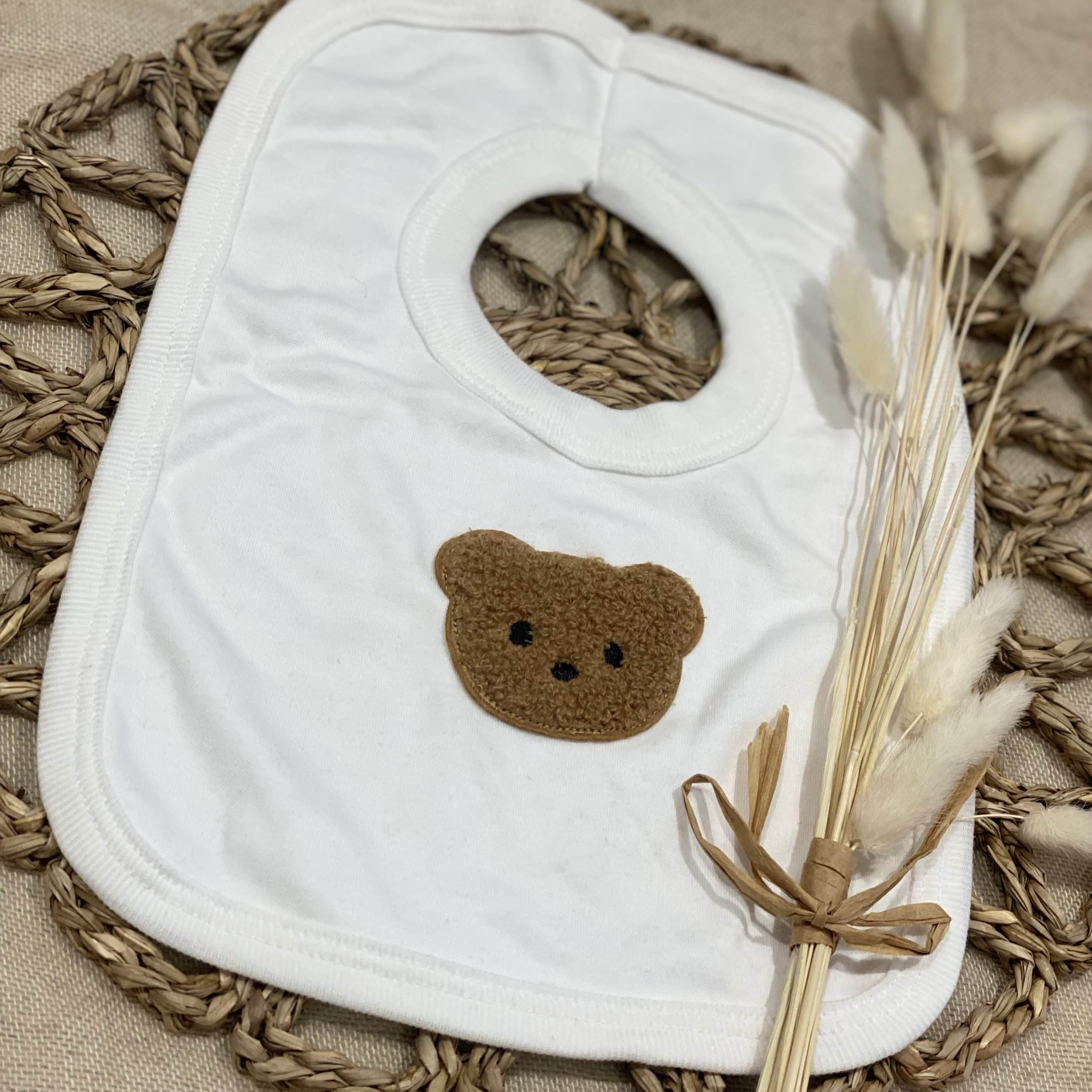 Unisex baby cotton bib with a bear sewn on the front. pull over head bib.
