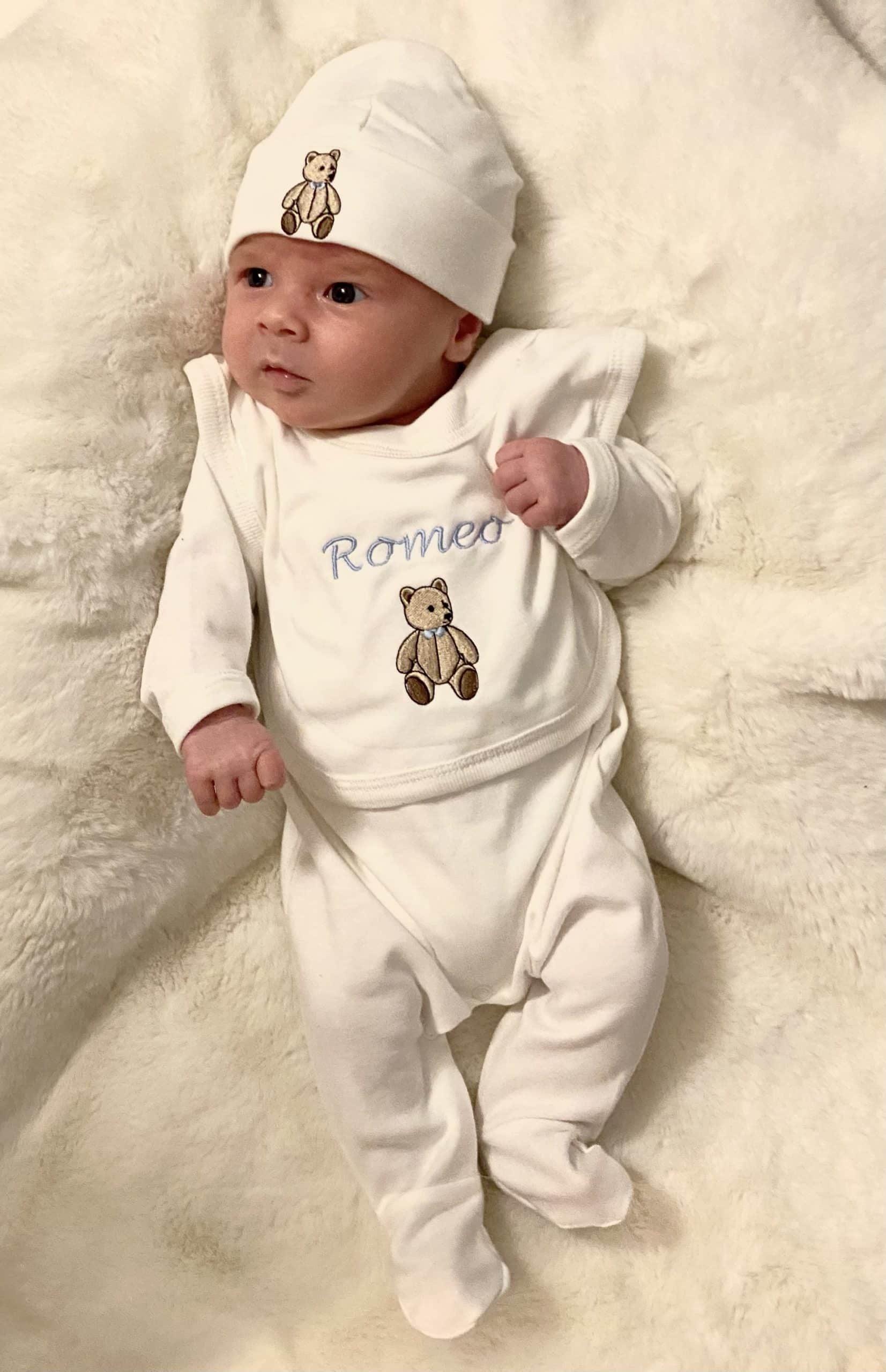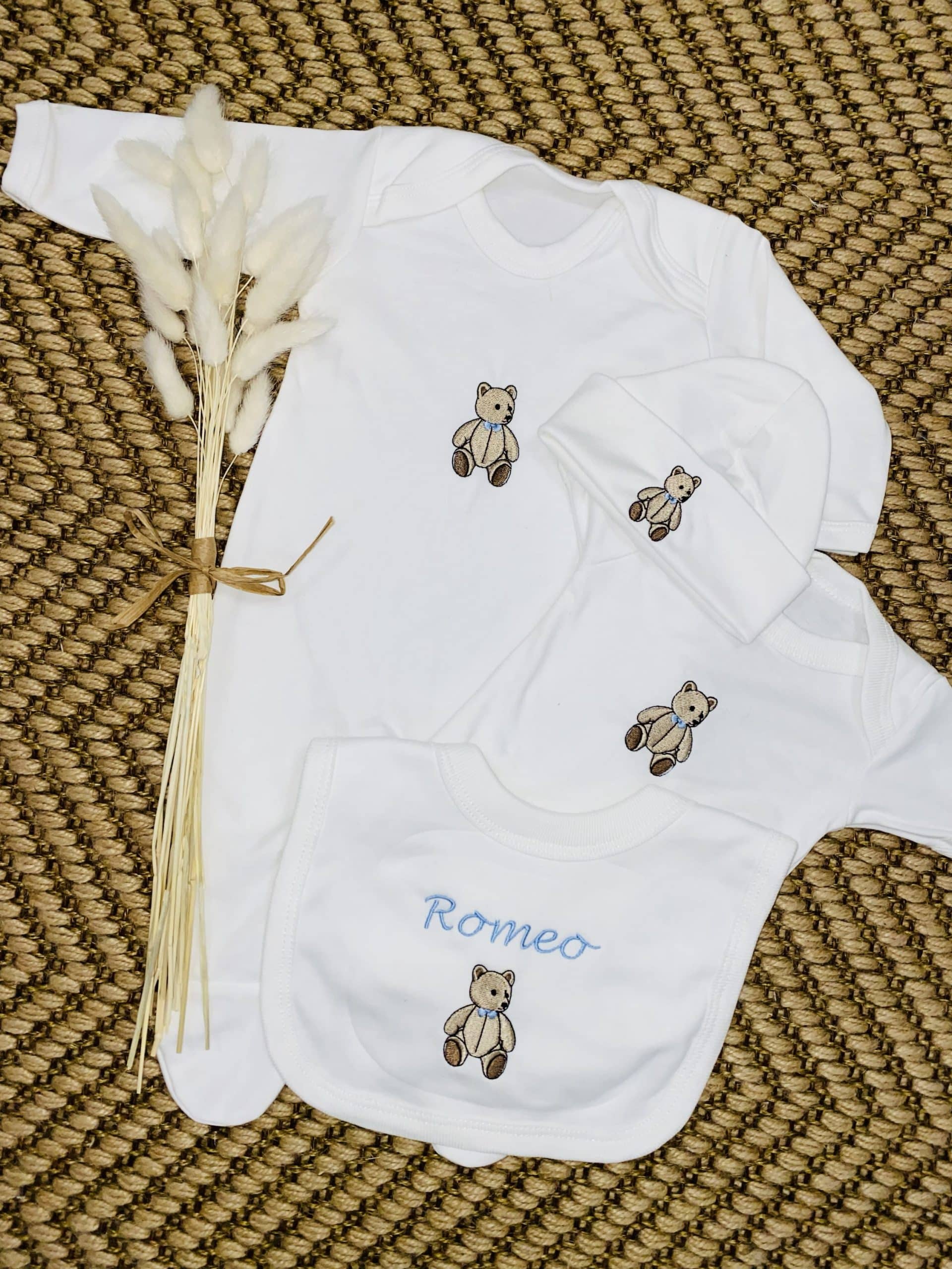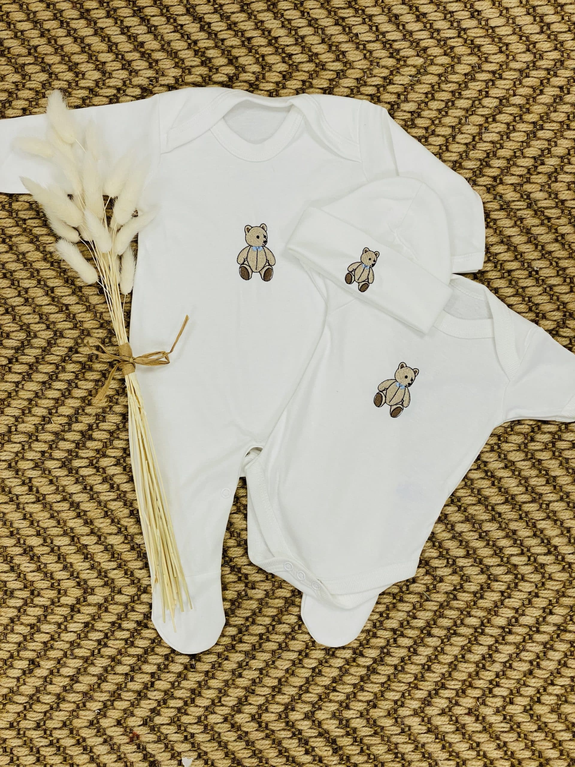 Newborn gift sets includes sleepsuit, vest, bib and beanie hat.