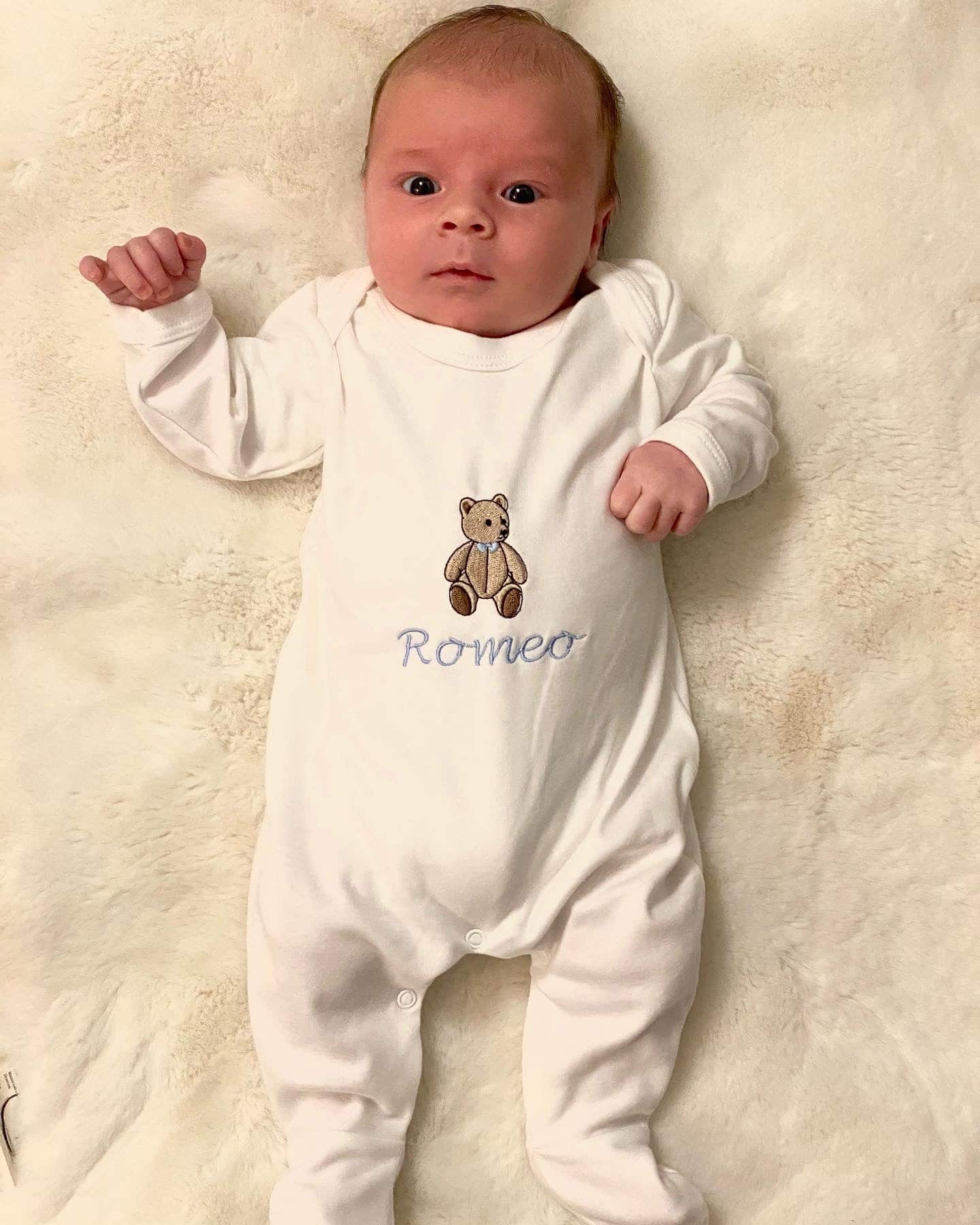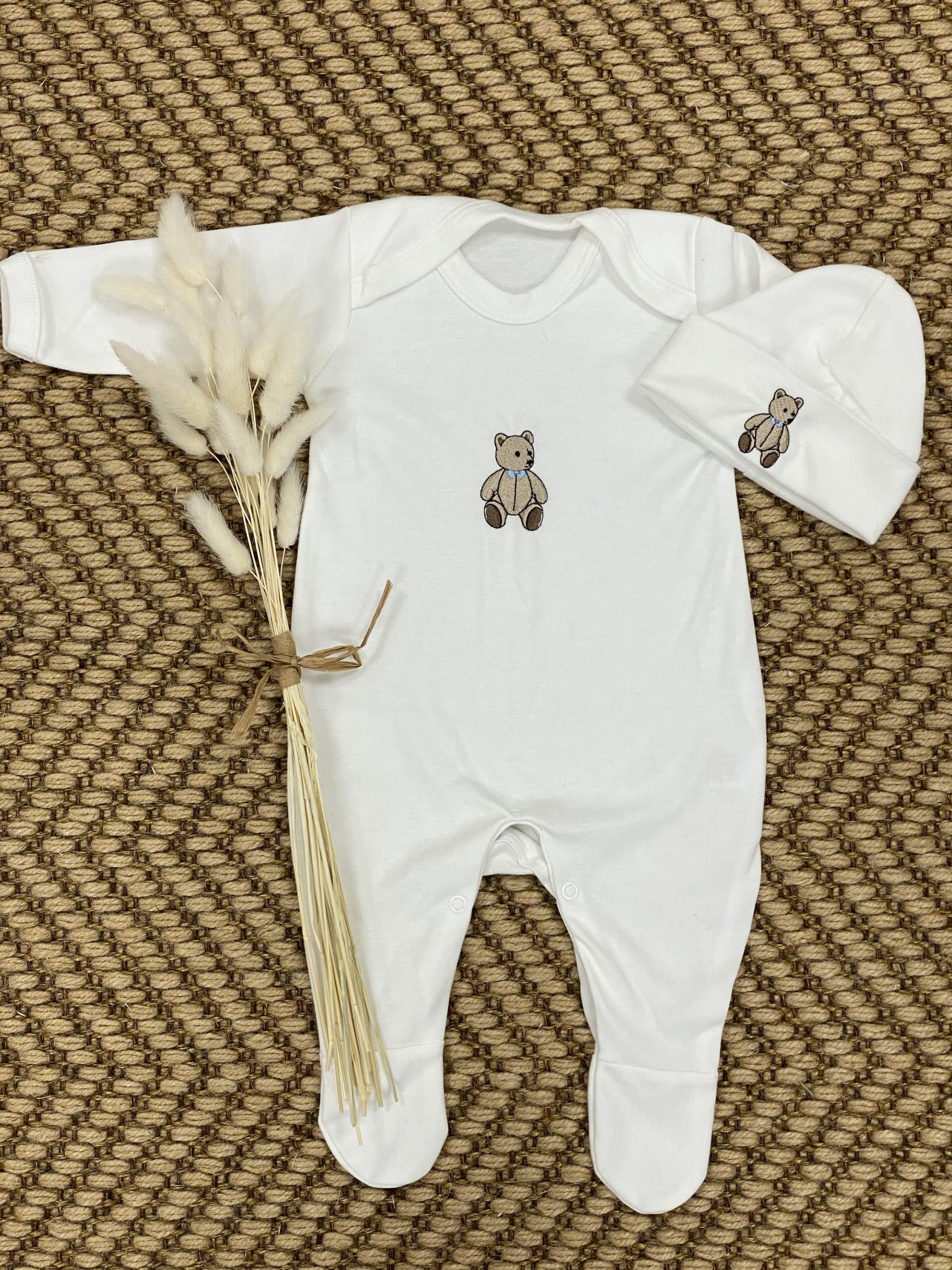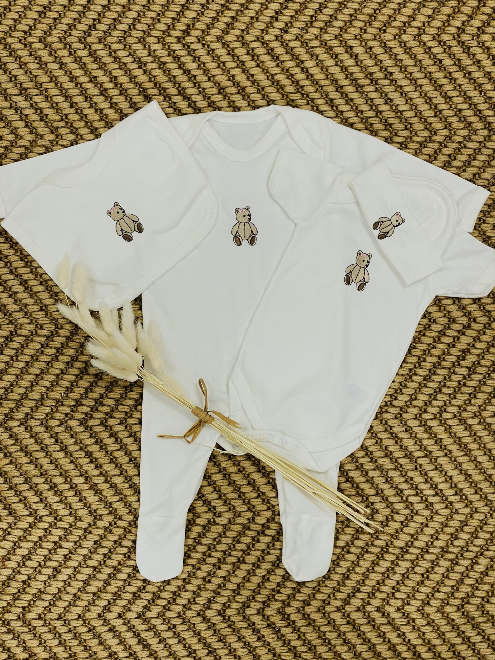 Newborn gift sets includes sleepsuit, vest, bib and beanie hat.