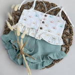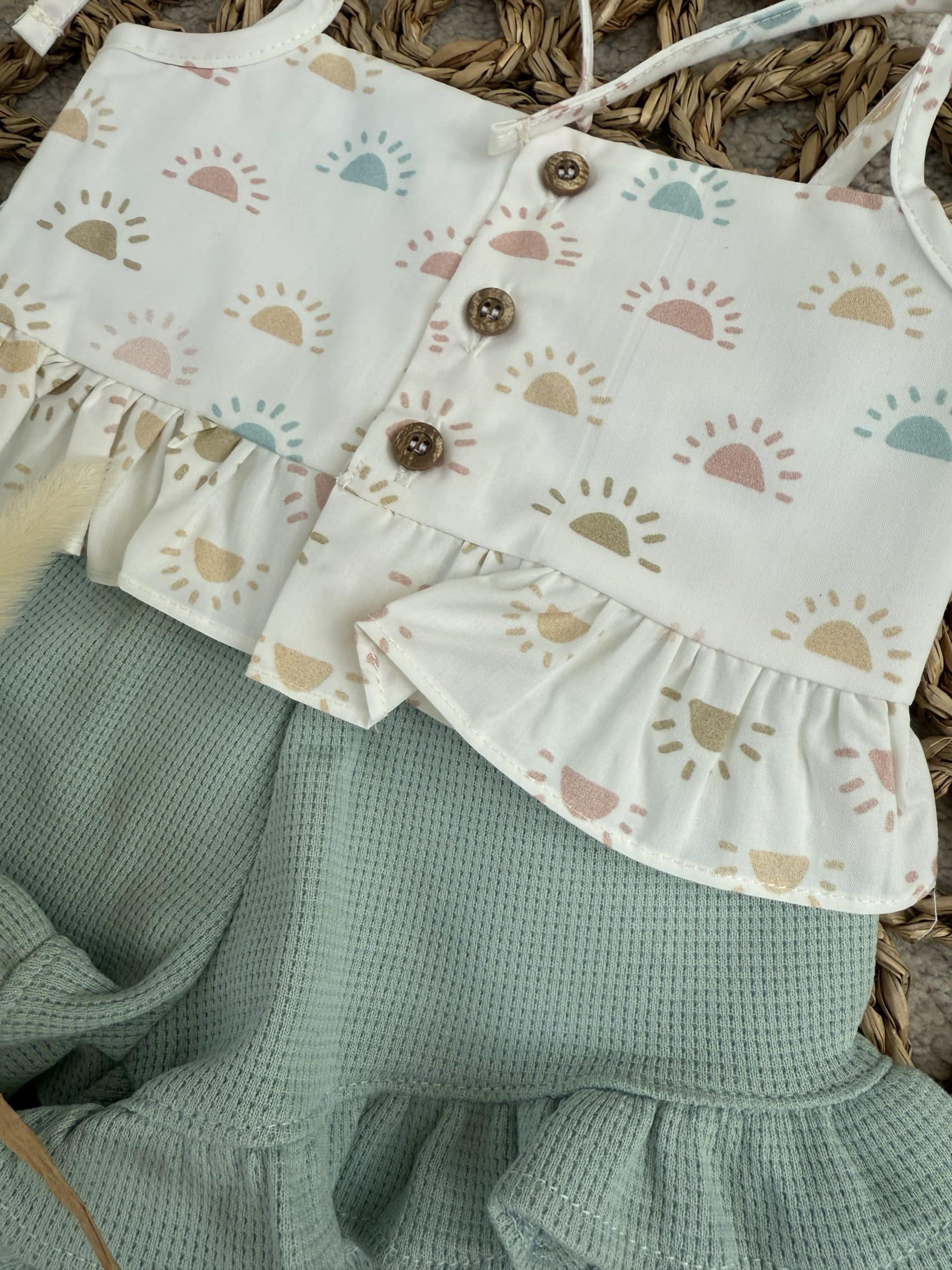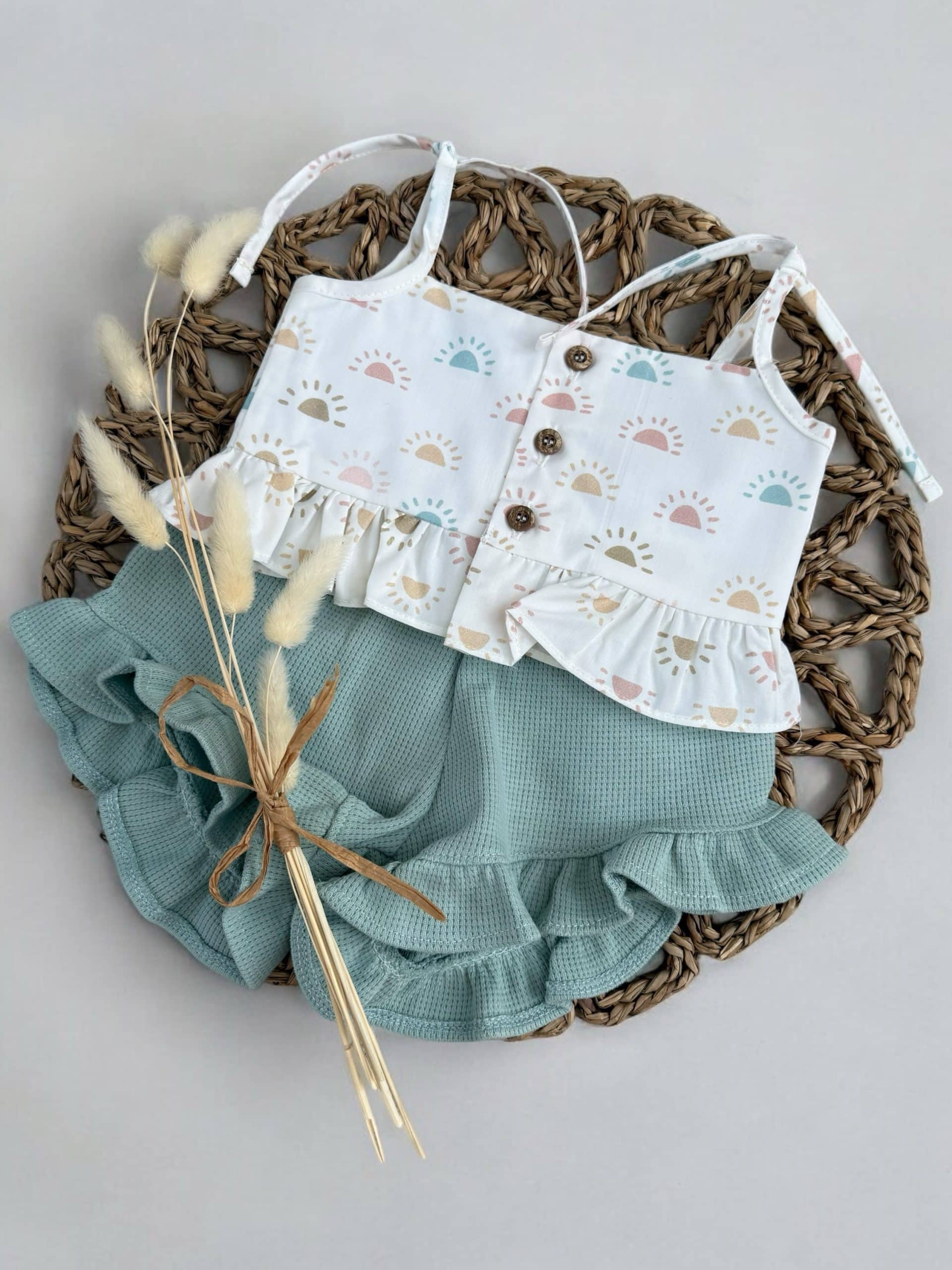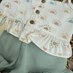 baby girls beautiful 2 piece set, vest top is cotton with sun print all over, the shorts are green jersey cotton with a little frill at the bottom, perfect for summer.