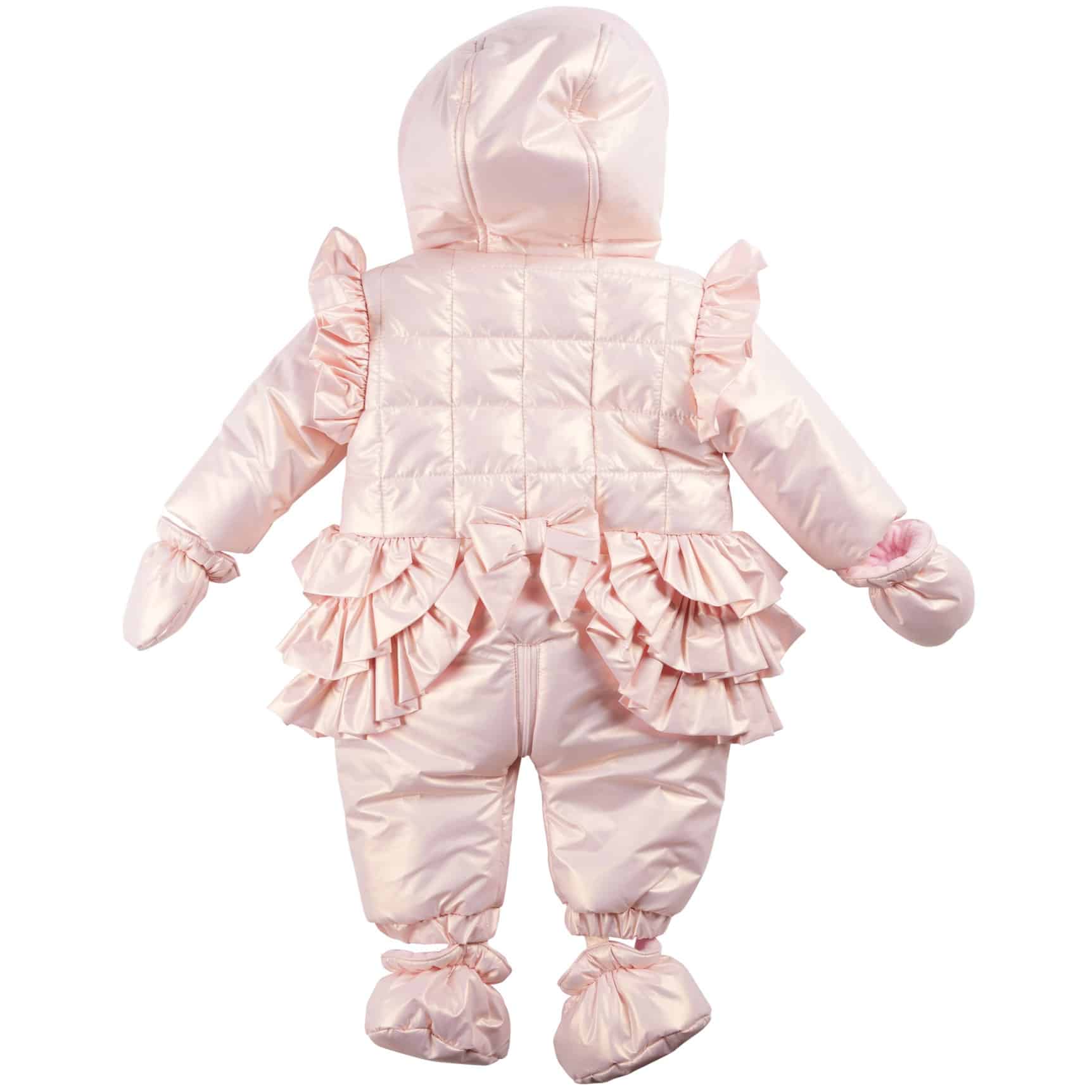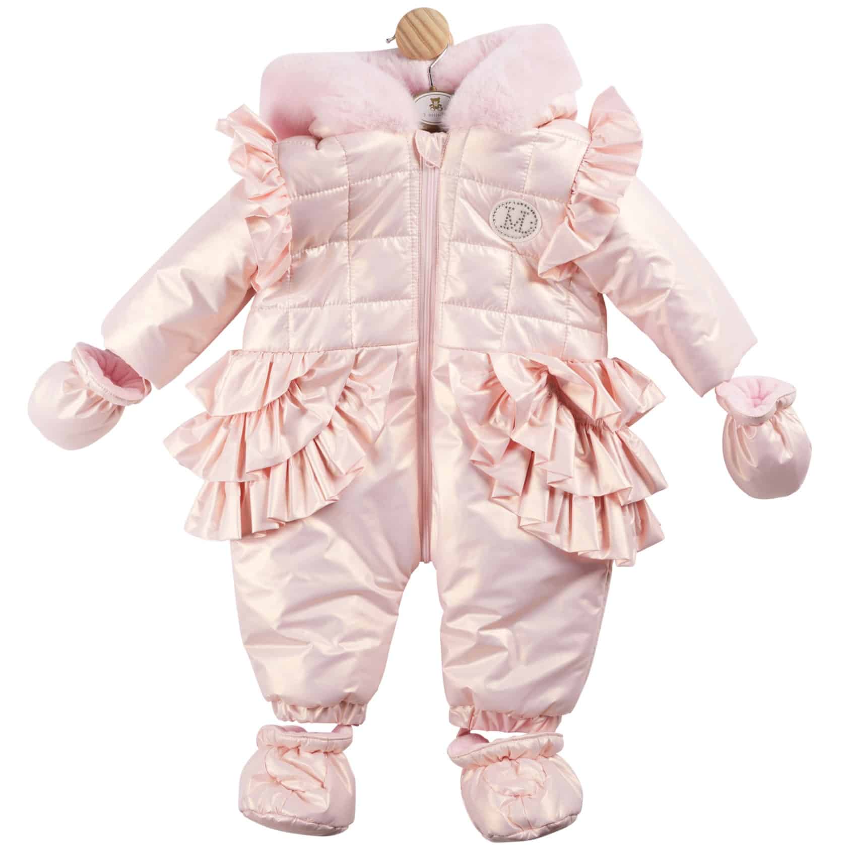 Pretty and feminine for baby girls, a silky smooth pink snowsuit by Mintini Baby. It is softly padded for comfort and warmth, and has elasticated ankle cuffs to help keep out chilly winds. There is a faux fur trim on the fixed hood, and the quilted chest panel is embroidered with shiny frills and has a popper fastening storm flap. The snowsuit has padded ruffles around the waistline, with a fixed bow on the back. It fastens with a zip down the front and comes with detachable mittens and booties that secure with poppers.