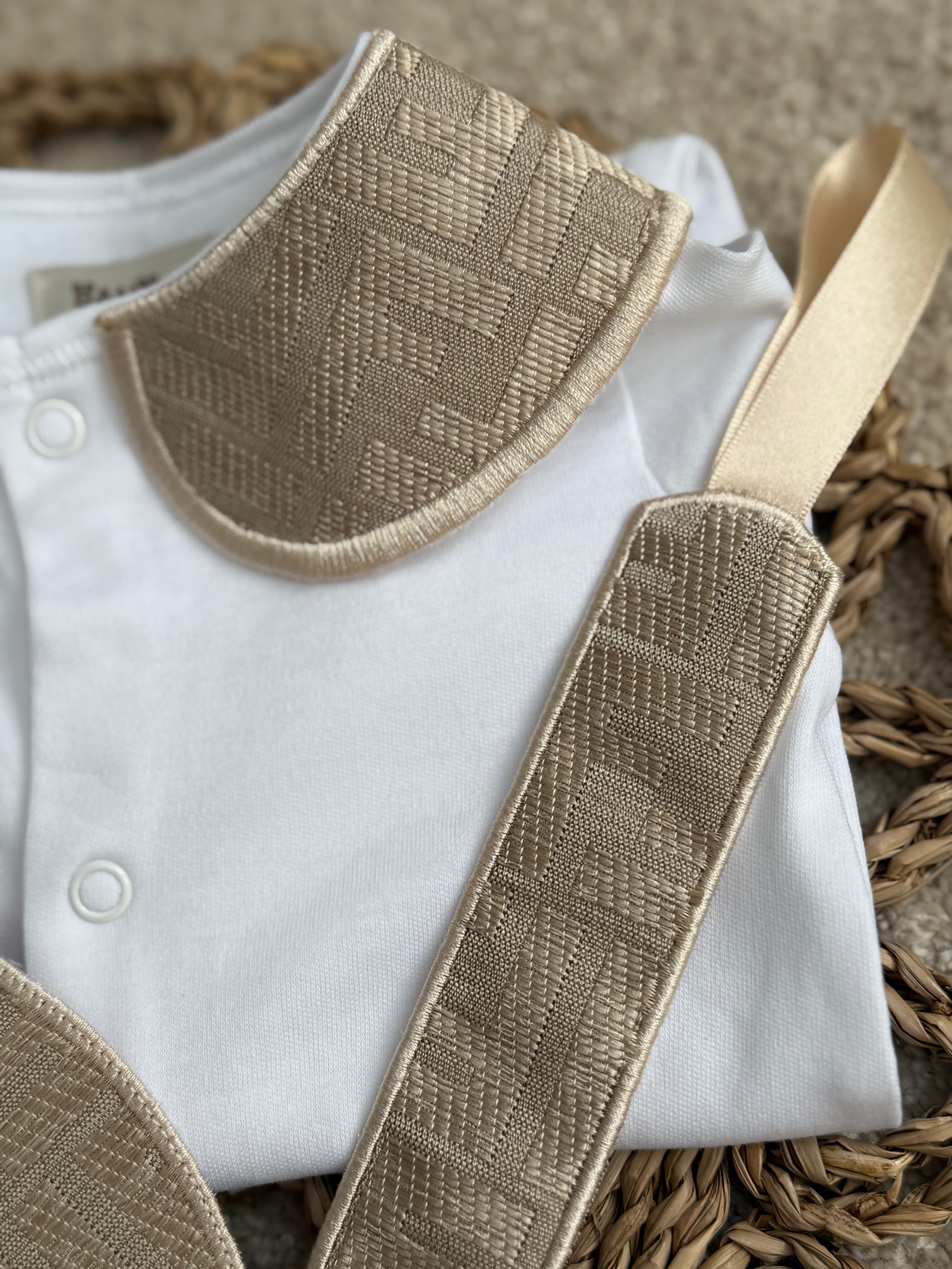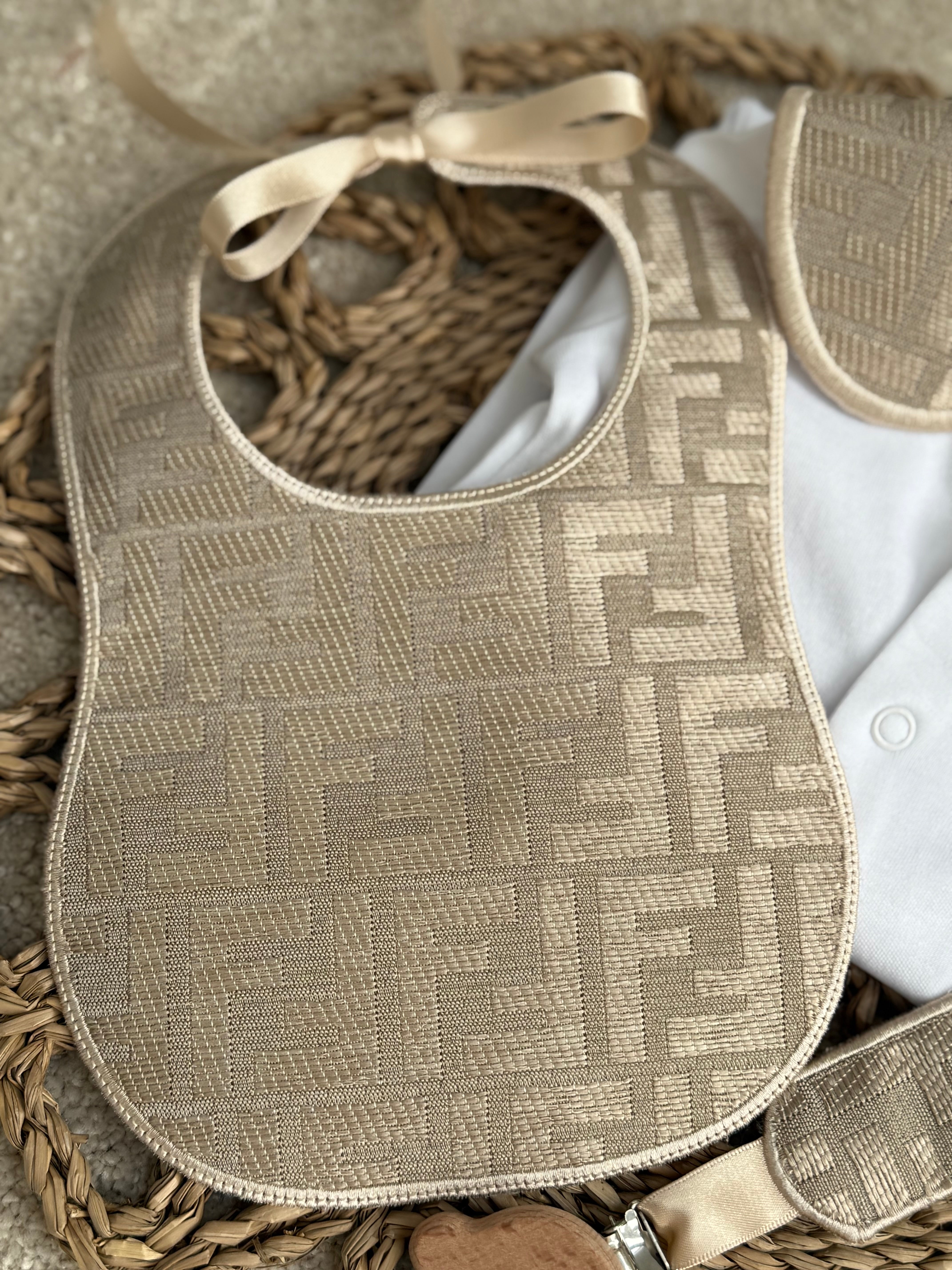 Baby’s Unisex Beige inspired Handmade Sleepsuit, Bib & Dummy Clip Set