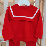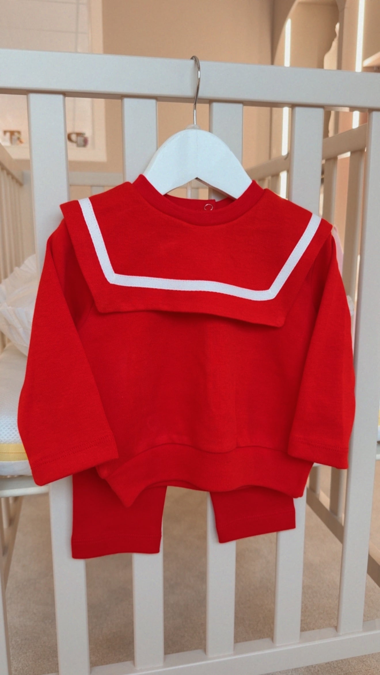 Keep your little one cosy and stylish this season with our adorable Baby Girls Red Jumper and Leggings Set. This soft cotton two-piece features a charming sailor-style collar with crisp white trim, paired with matching comfy leggings — perfect for everyday wear or festive occasions.
