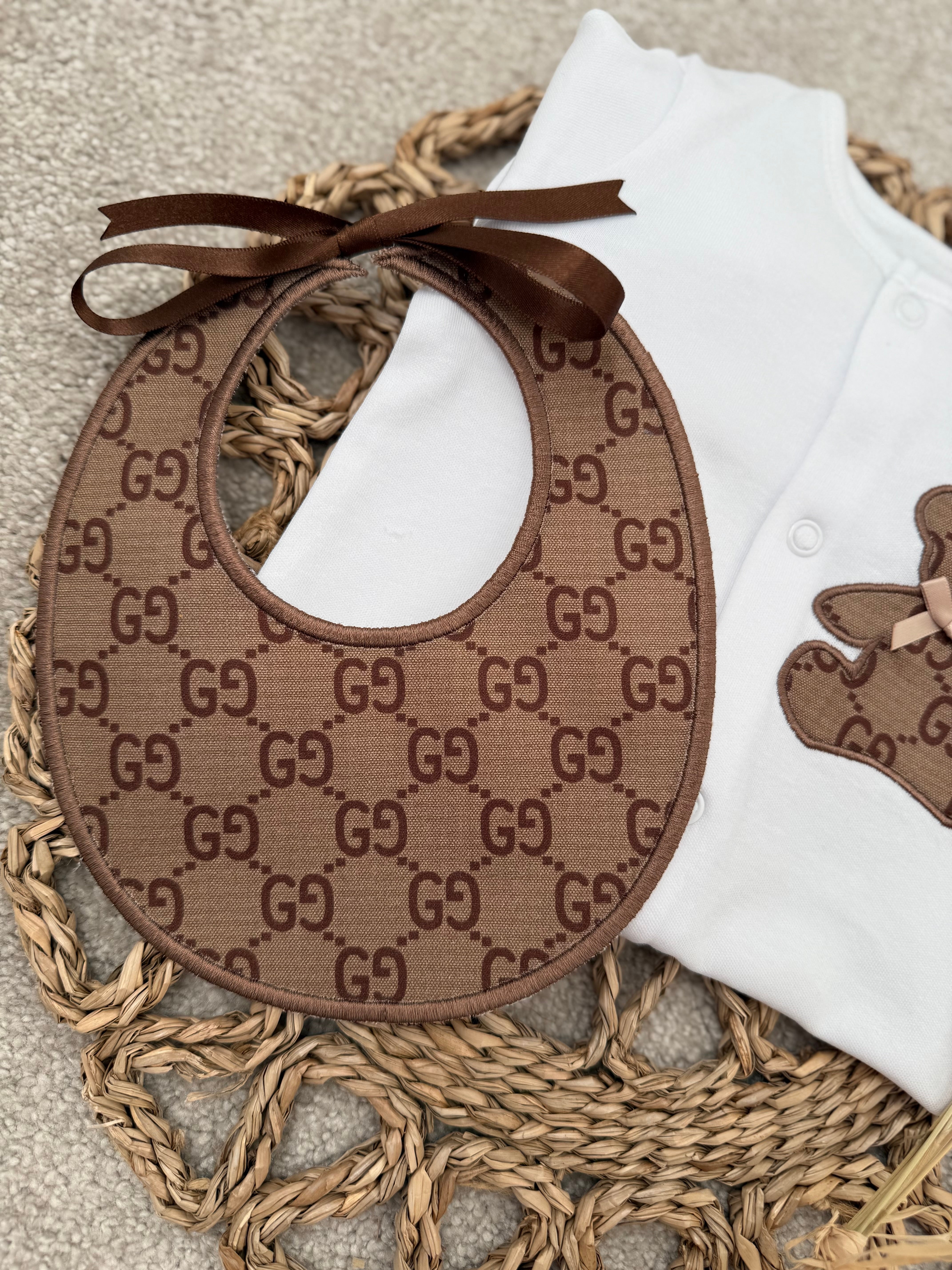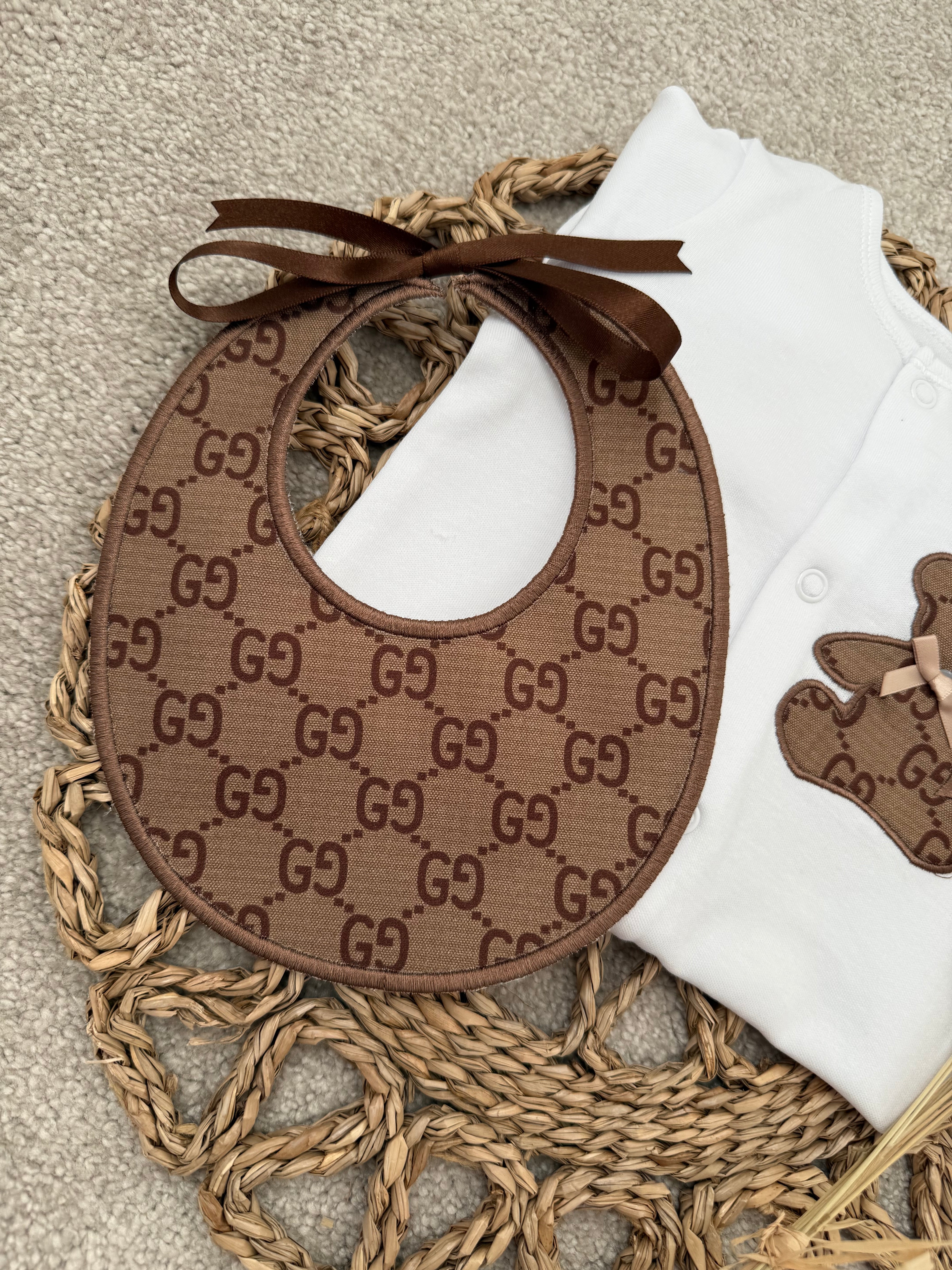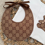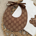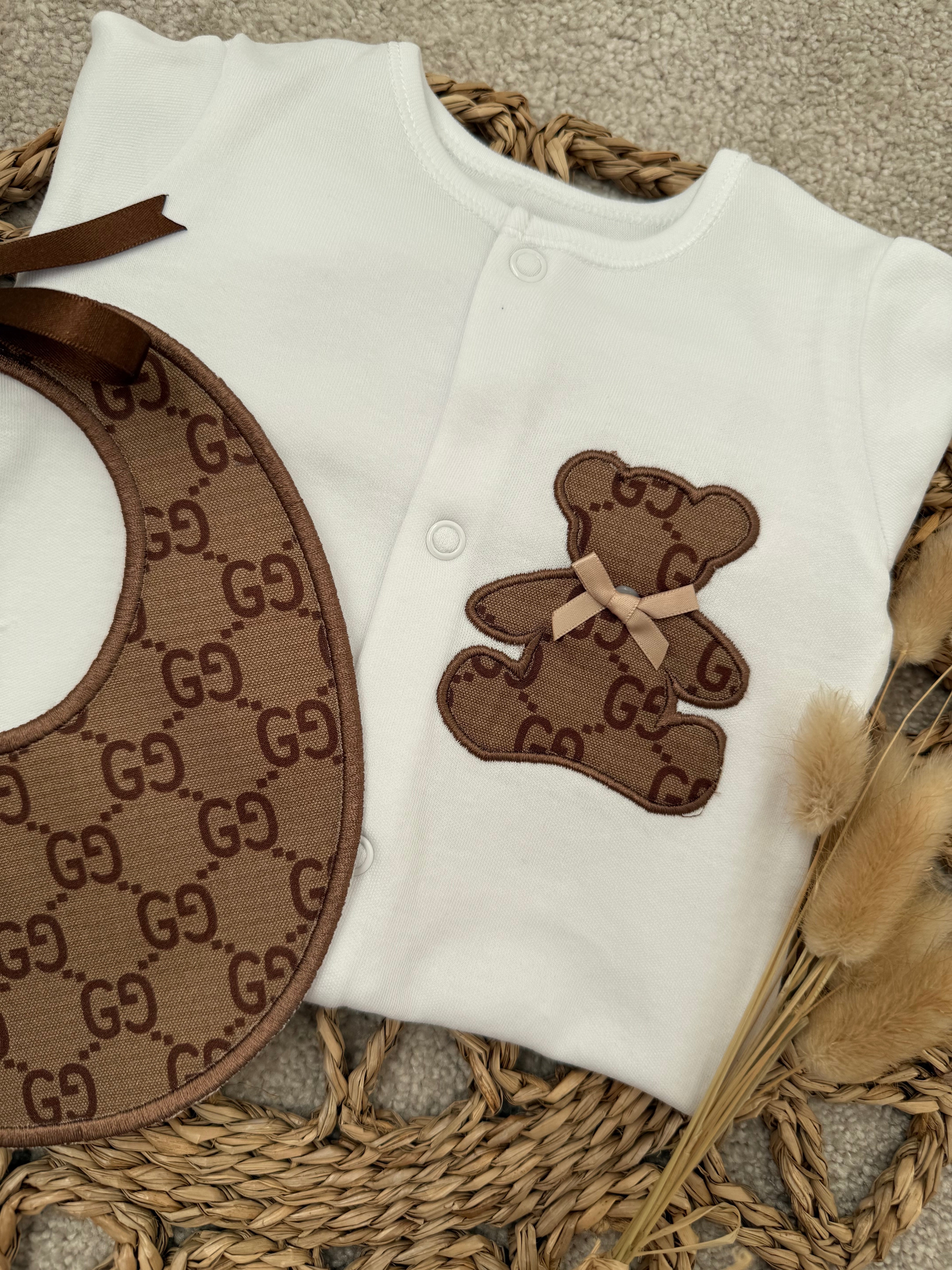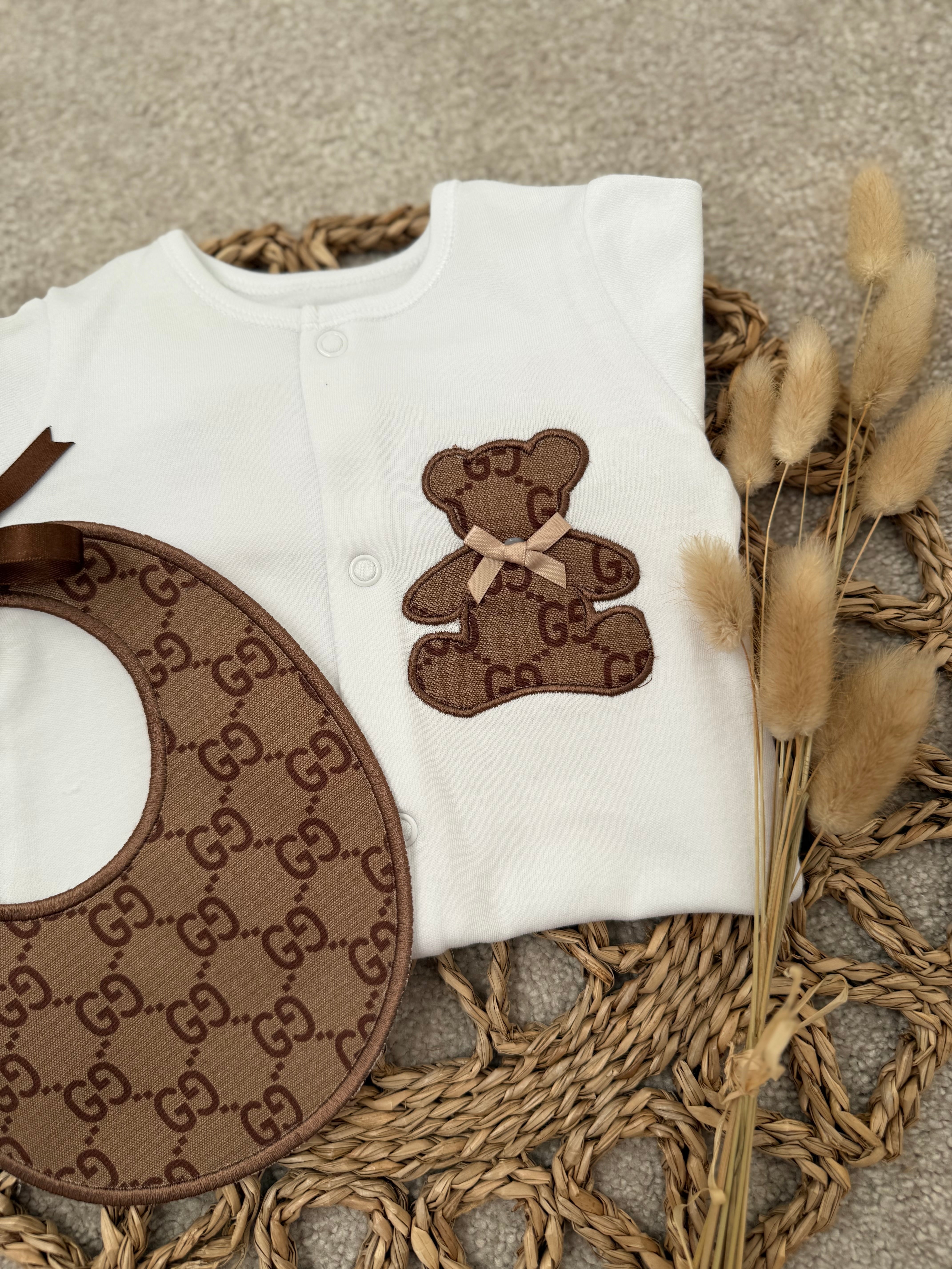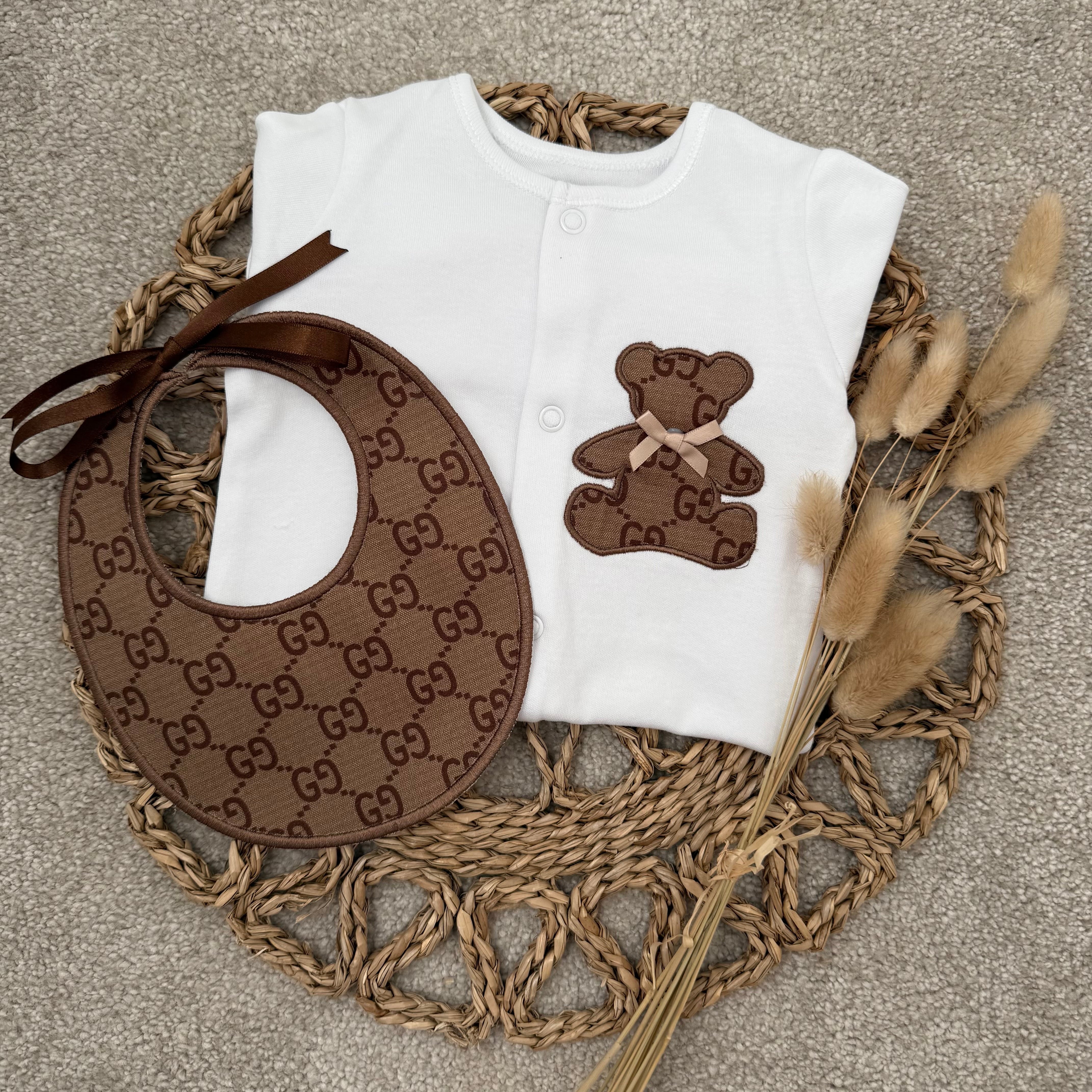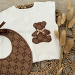 Our beautifully handcrafted teddy set is the perfect blend of timeless style and modern luxury. Designed in a soft neutral white babygrow, finished with a statement brown teddy appliqué and matching monogram-style bib, this set is made to stand out while remaining beautifully delicate for your little one.