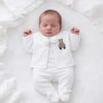 Baby Knitted Jacket with pom poms on the front & Trousers with full foot, perfect for a coming home outfit, Gift for a baby shower. Team it up with a babidu vest under neath.