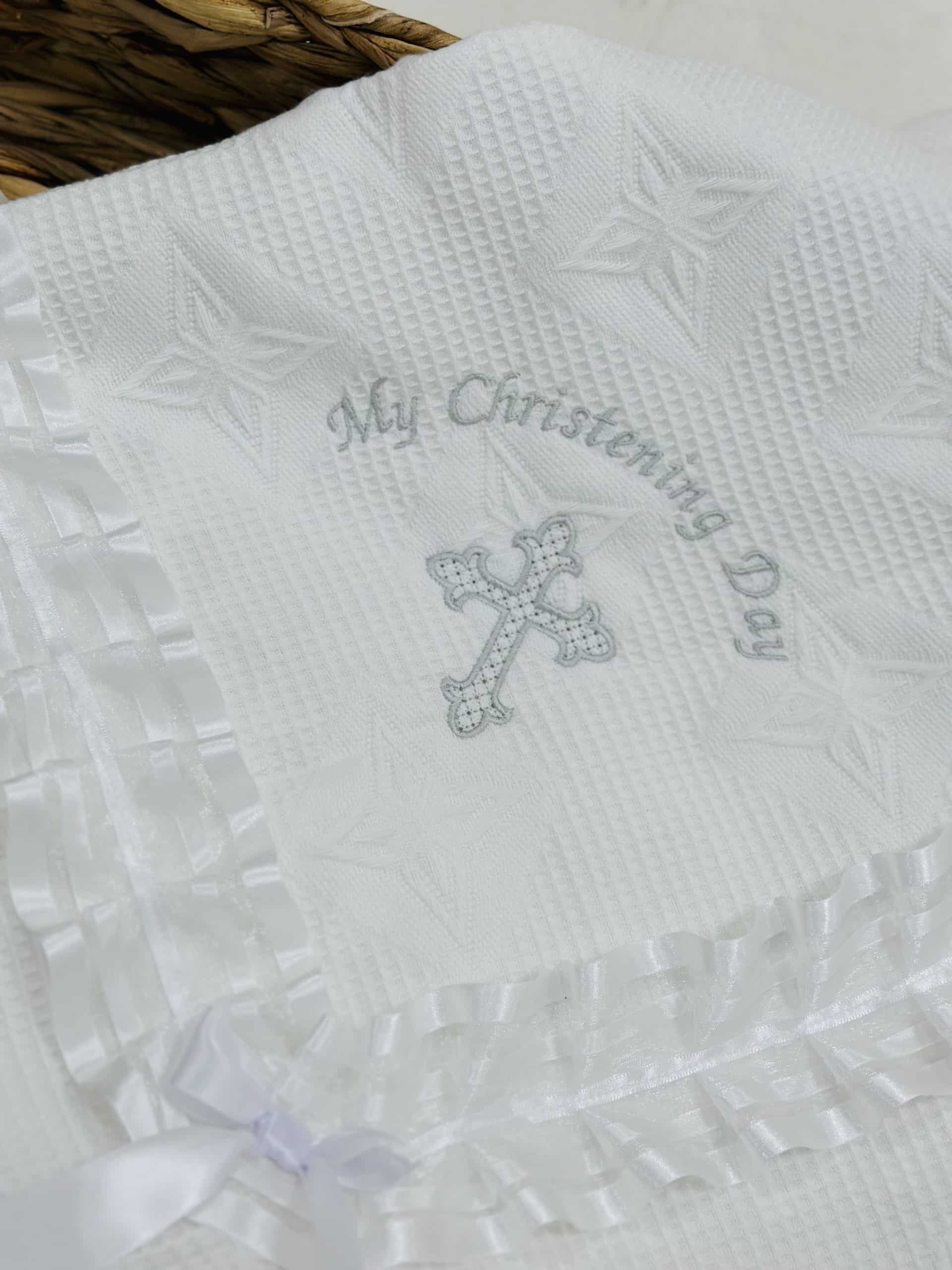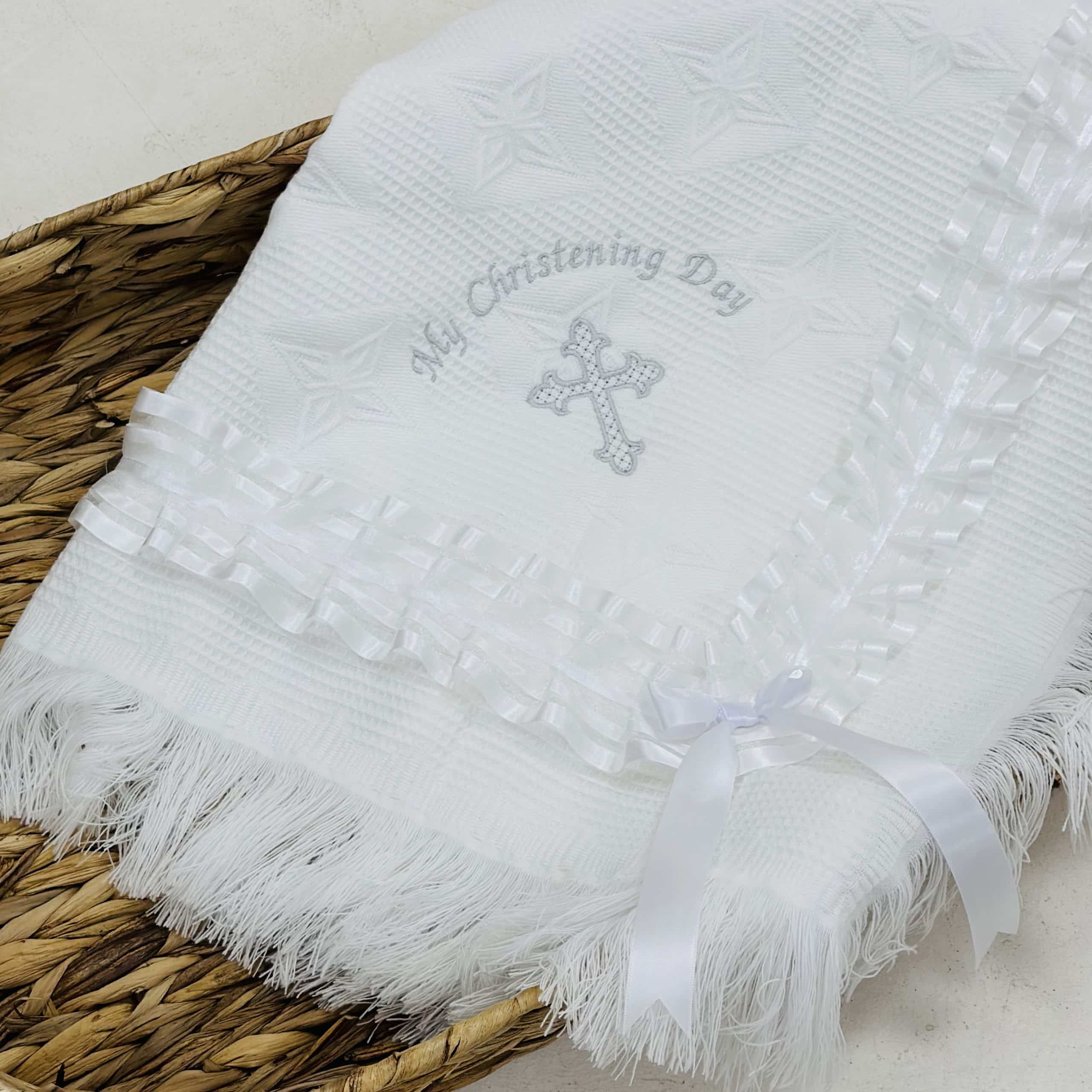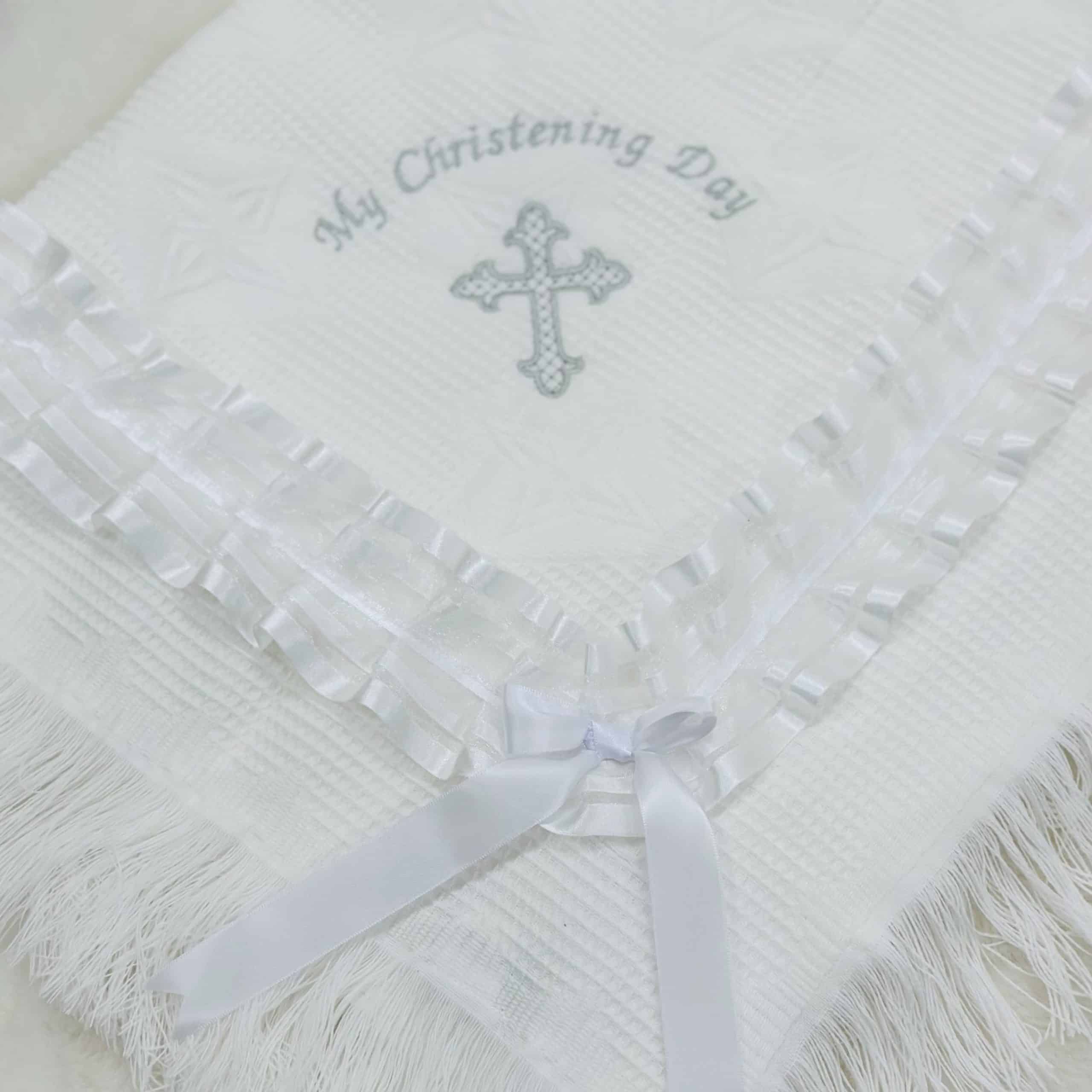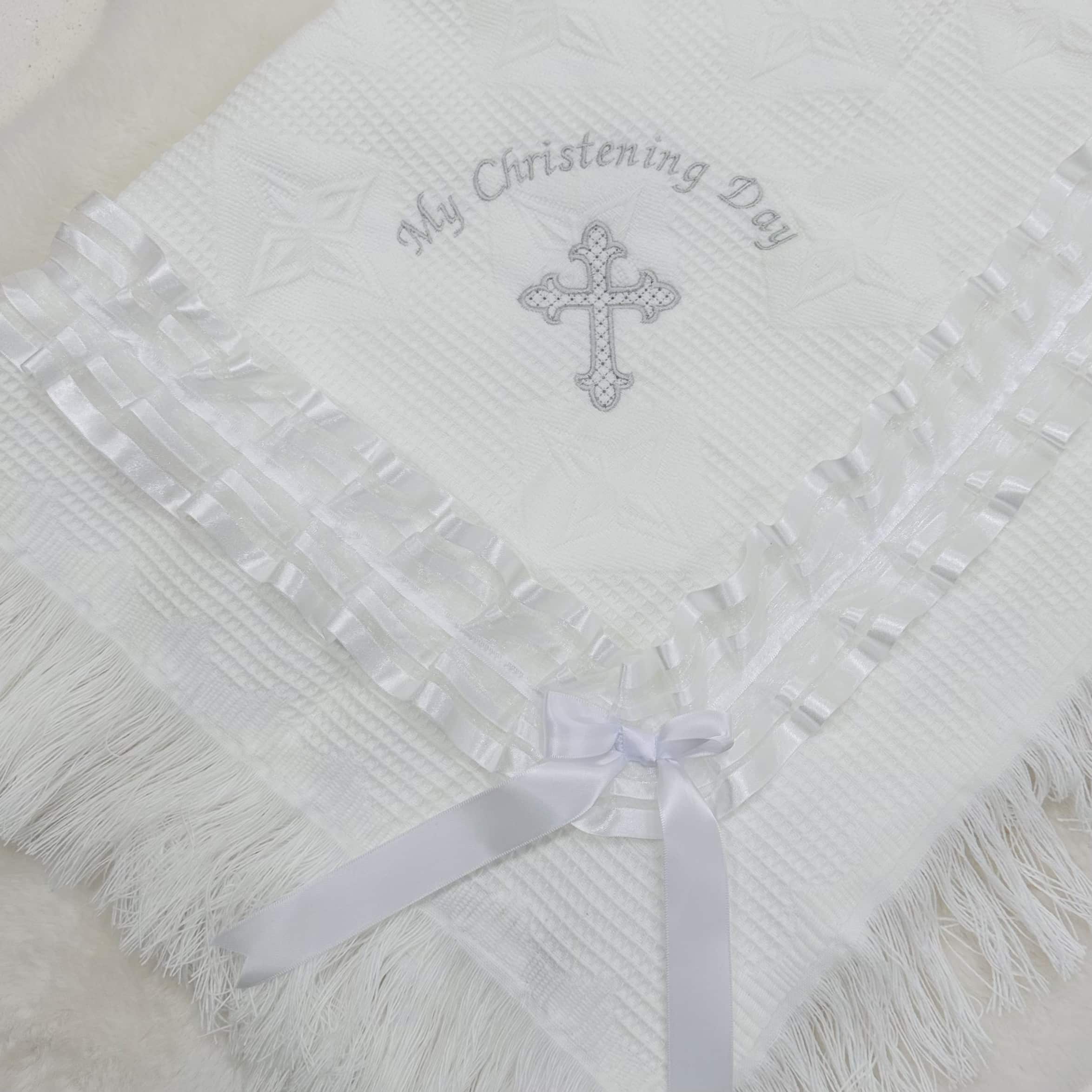 Perfect Little Thing baby shawl comes in a design with a lace ribbon and frill edge. " My Christening Day"