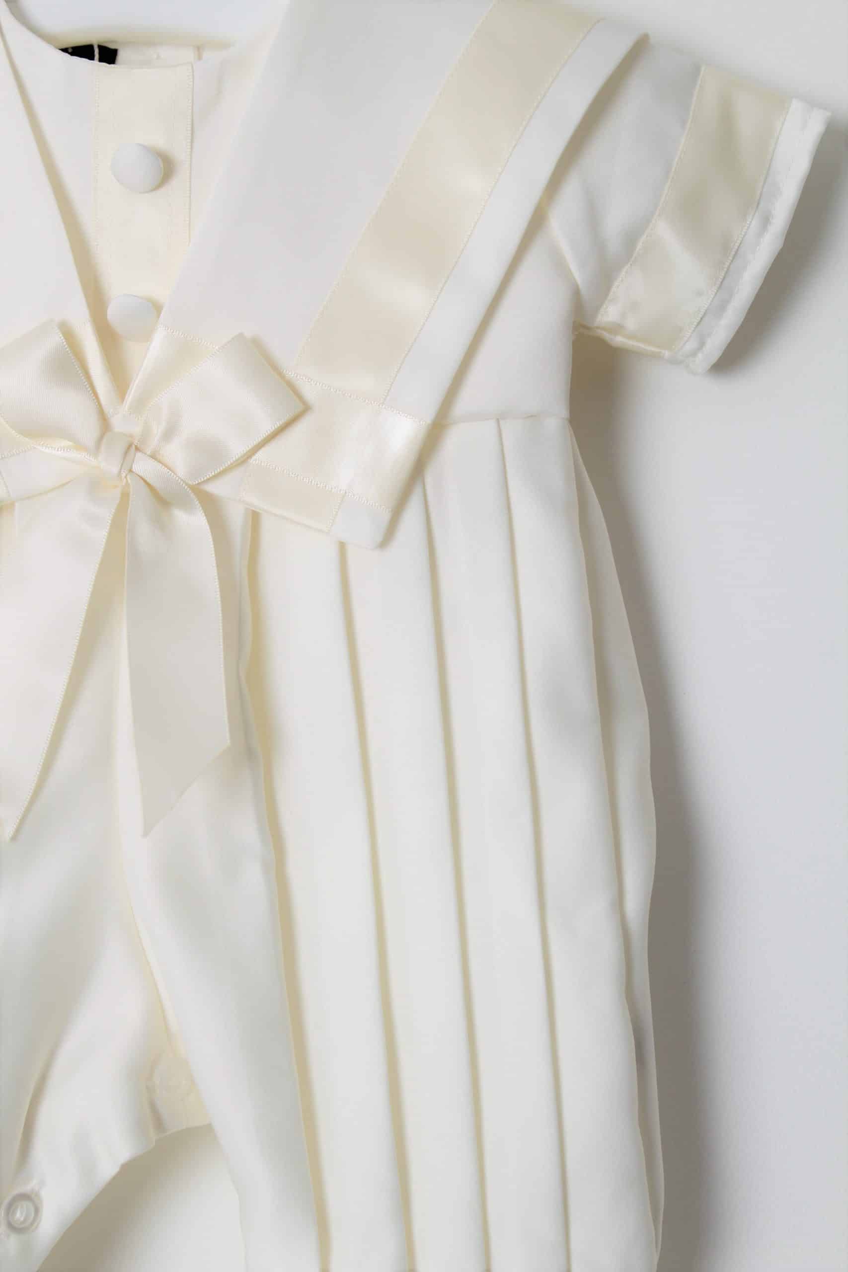 This baby boys ivory sailor style christening outfit, made with 100% polyester, is of an outstanding quality and will make a precious family heirloom for future generations of your family.