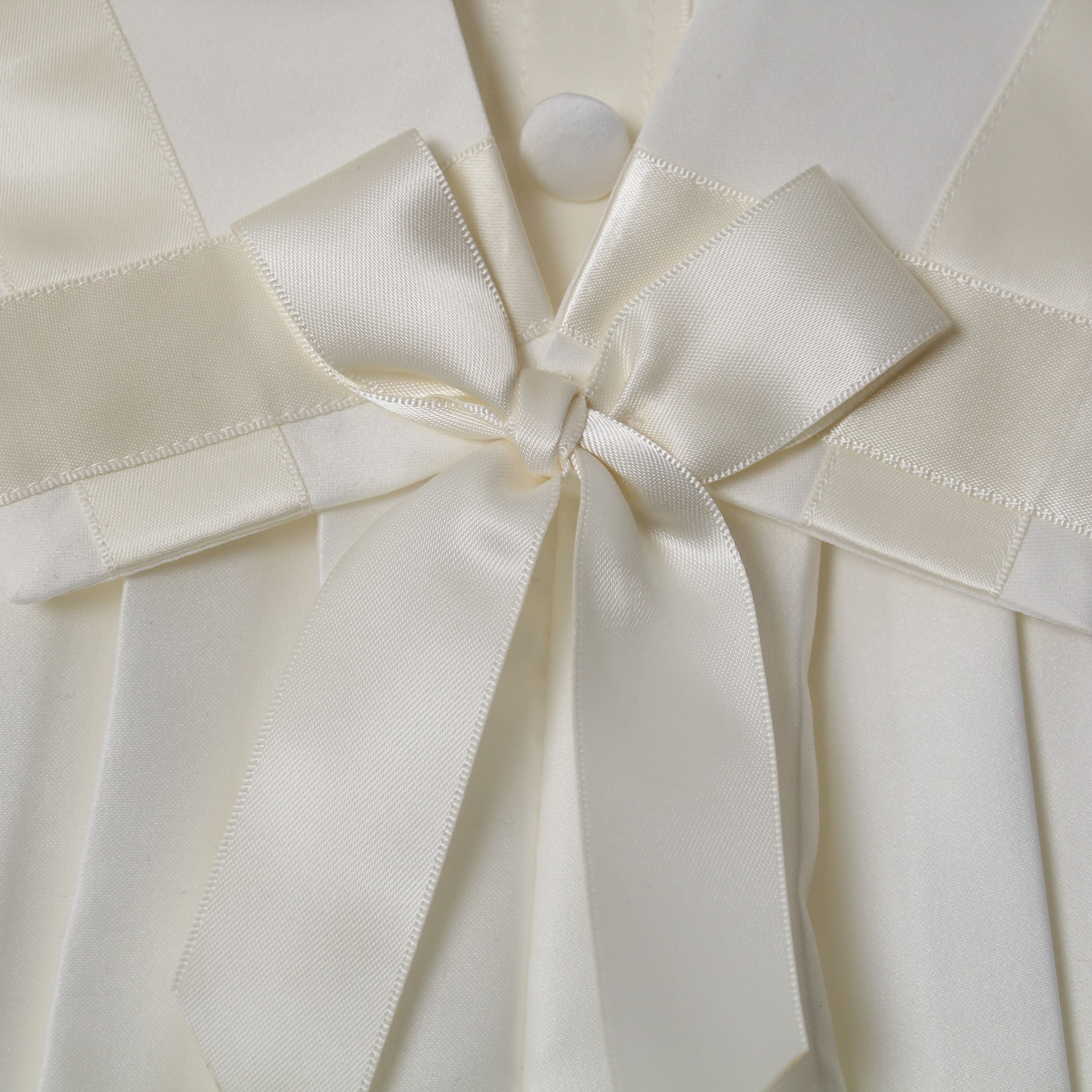 - Romper: This ivory satin romper has a large sailor style collar with satin ribbon trims and bow, with mock buttons down the front of the chest. The legs of the romper are pleated. Short sleeves are trimmed with satin ribbon, with a button fastening on the back and legs for easy removal / changing.