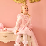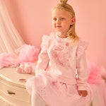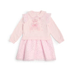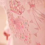 A pretty pink dress for girls by Caramelo Kids, combining soft jersey comfort with lots of sparkle. The top has a delightful crown and fairy wings motif on the front, embellished with diamantés and pearls. It has eye-catching pink tulle ruffles with shiny silver polka dots.