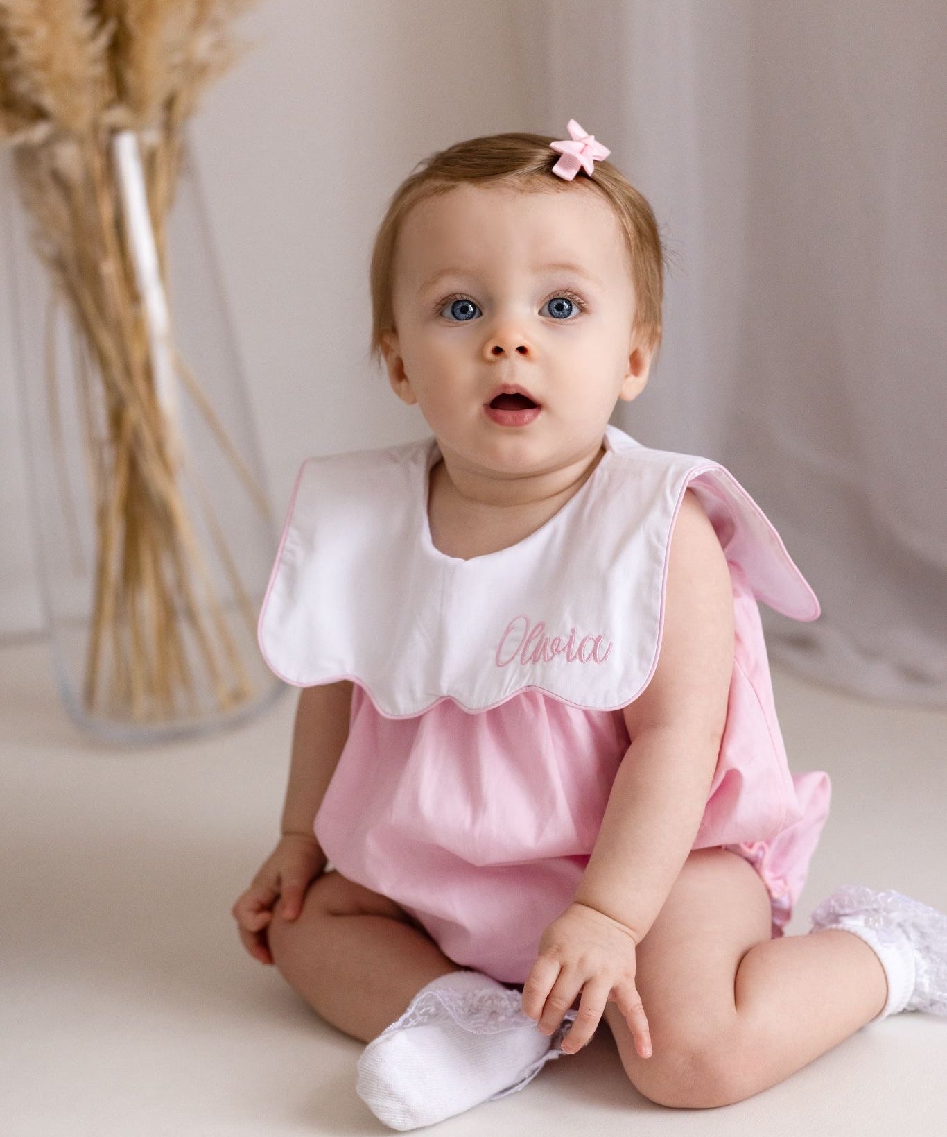 Luxury Pink Baby Girl Romper with Personalised Bib Collar – Woven Cotton