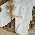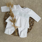 Dress your little one in timeless elegance with this baby blue velour smocked 2 piece. Crafted from soft and cosy velour, this outfir features delicate hand-smocked detailing across the chest and a crisp white Peter Pan collar for a classic finish. The long sleeves and gentle elasticated legs provide comfort and ease of movement, while the back popper fastening makes dressing simple. Perfect for special occasions, christenings, or everyday wear, this baby romper combines traditional charm with modern comfort.