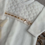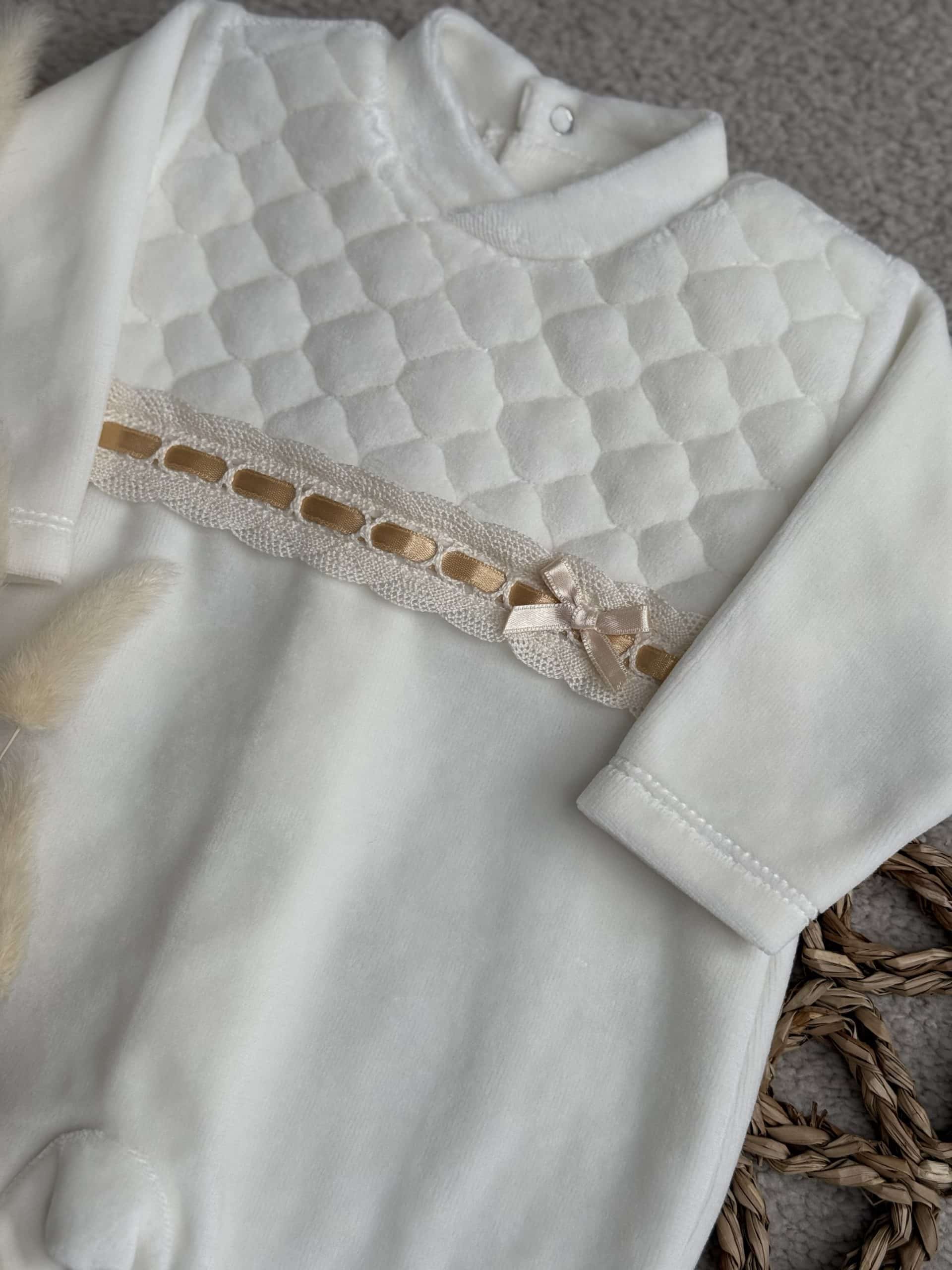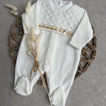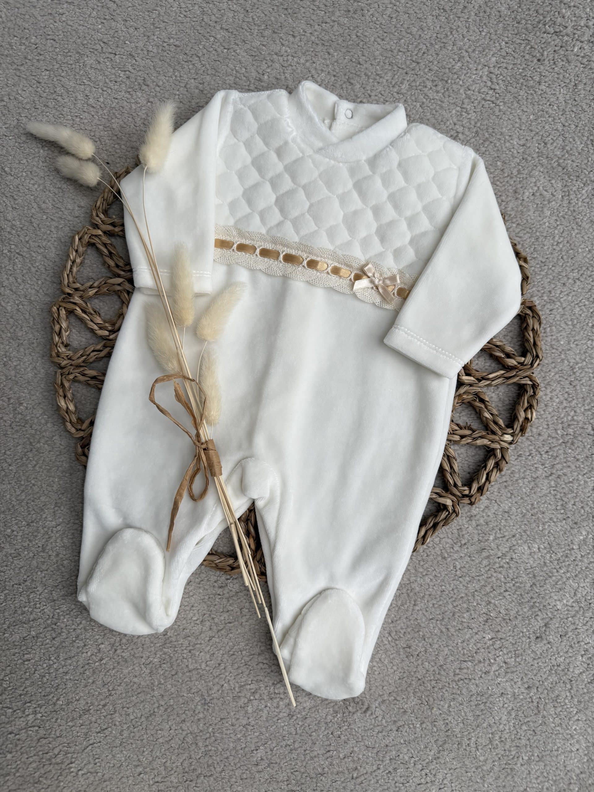 Soft and sweet, our baby boys cream velour babygrow features a delicate Pattern on the front. Designed for both comfort and style, this babygrow is perfect for keeping your little one cozy while looking adorable. Made from luxuriously soft velour, it ensures gentle warmth and is easy to care for. Ideal for special occasions or everyday wear, this piece adds a touch of elegance to babys wardrobe.