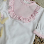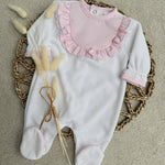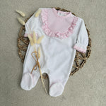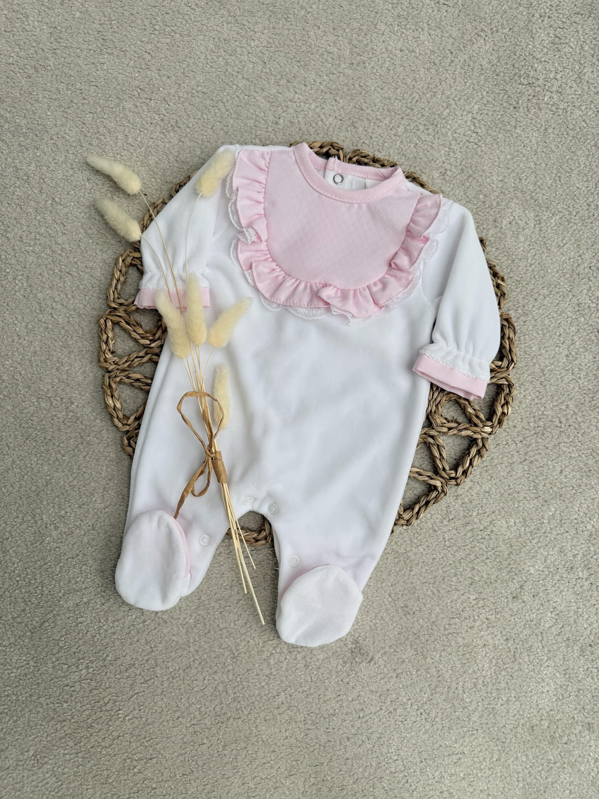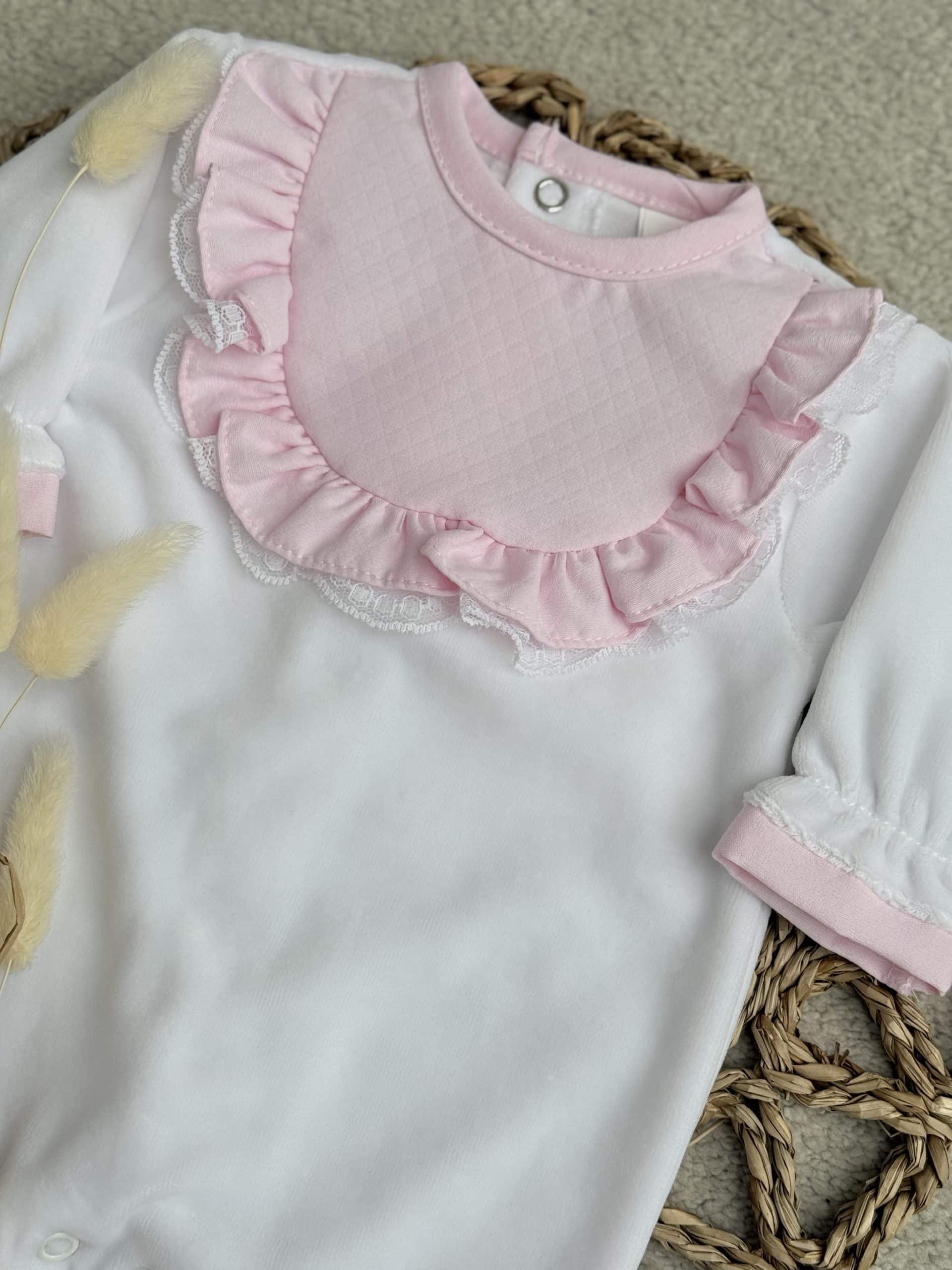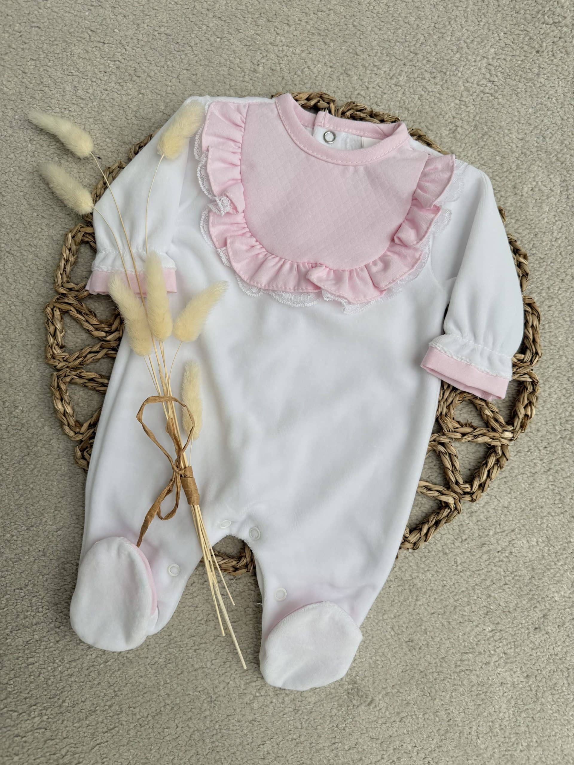 Soft and sweet, our baby girls cream velour babygrow features a delicate Pink panel adorned with a charming frill on the front. Designed for both comfort and style, this babygrow is perfect for keeping your little one cozy while looking adorable. Made from luxuriously soft velour, it ensures gentle warmth and is easy to care for. Ideal for special occasions or everyday wear, this piece adds a touch of elegance to babys wardrobe.