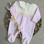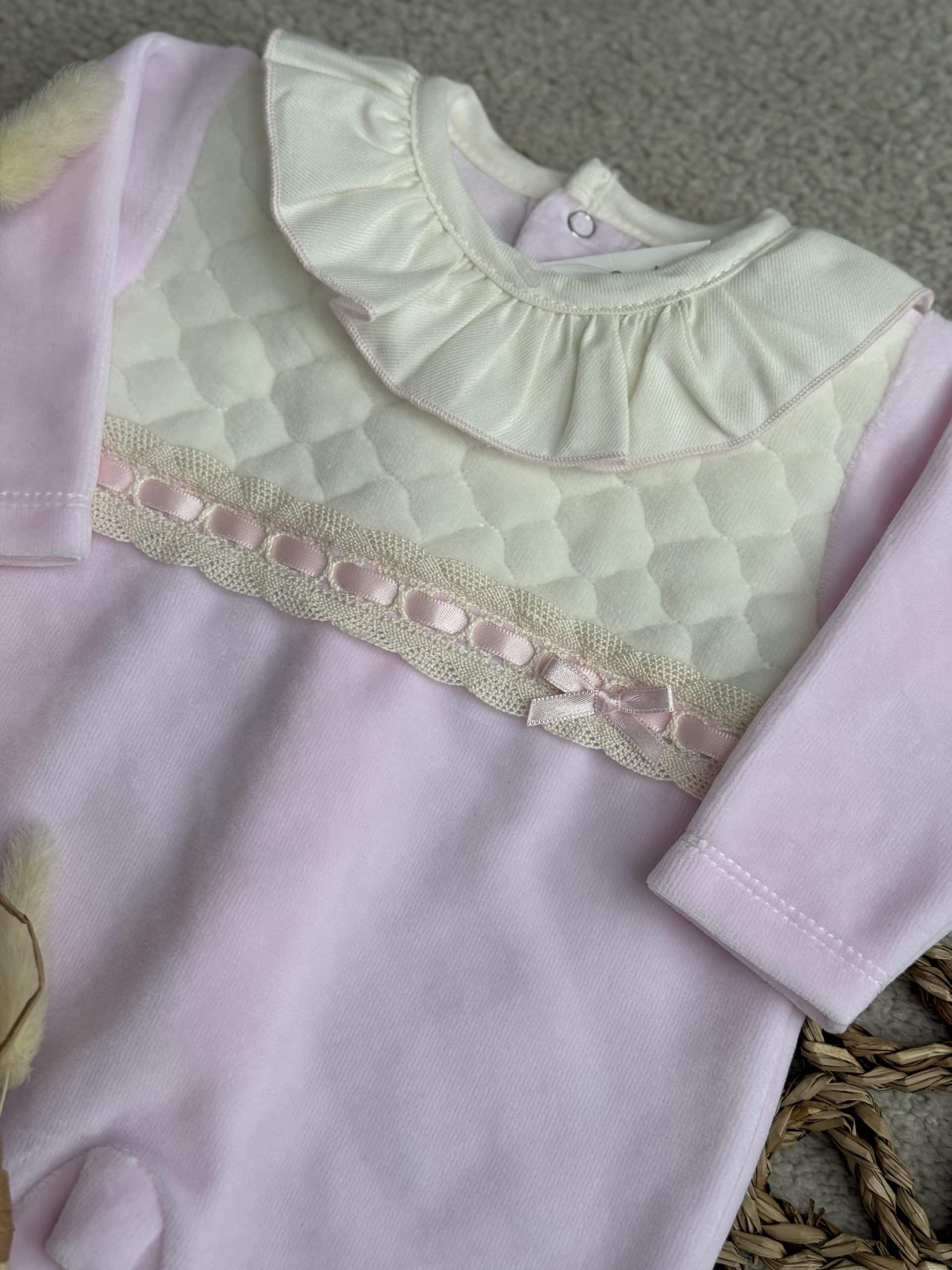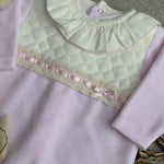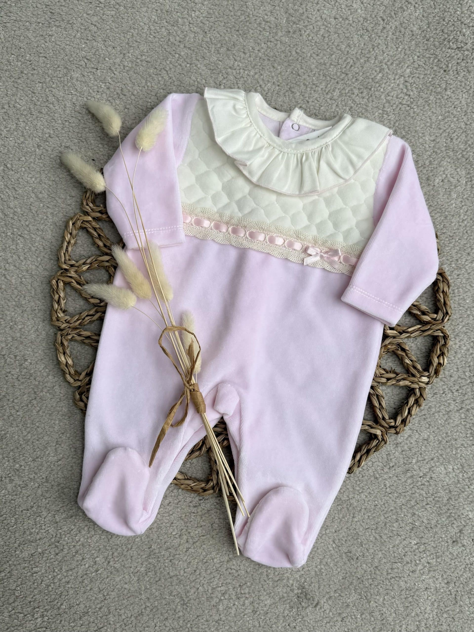 Soft and sweet, our baby girls pink velour babygrow features a delicate Pink panel adorned with a charming frill on the front. Designed for both comfort and style, this babygrow is perfect for keeping your little one cozy while looking adorable. Made from luxuriously soft velour, it ensures gentle warmth and is easy to care for. Ideal for special occasions or everyday wear, this piece adds a touch of elegance to babys wardrobe.