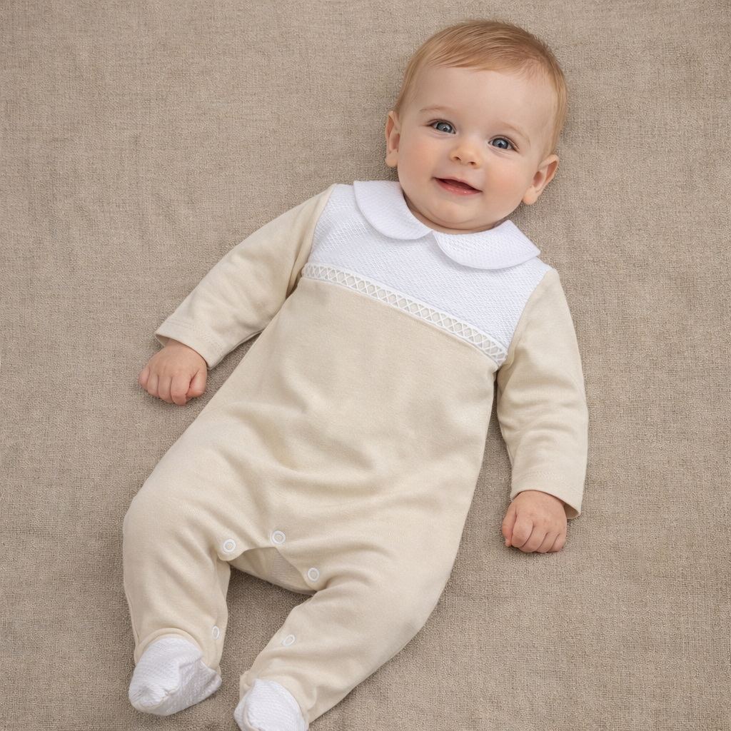 Keep your little one comfortable and stylish with this elegant white cotton sleepsuit. Made from soft, breathable fabric, it features a beautifully embroidered smocked panel on the chest for a traditional touch. The Peter Pan collar, finished with a delicate beige trim, adds classic charm. Designed with built-in feet for extra coziness and practical popper fastenings for easy changing, this sleepsuit is perfect for both everyday wear and special occasions.